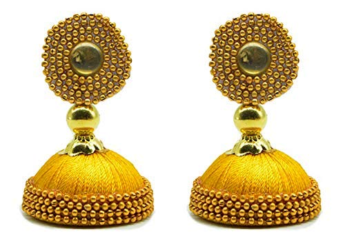 Ethnic Designer Wear Golden Silk Thread Jhumki in Different ColorsBeautiful Designer Silk Jhumki for all age group. Even kids can wear it appropriate size for those looking for small earrings. This designer Rose flower silk thread jhumki is suitable for all ocassions.Available in different color options to choose from. A traditional party wear earring that matches to our outfit. These elegant jhumki are light in weight which makes them suitable to be carried. Whether you wear ethnic outfit or western dress it suits you on each and every occasion.Golden Embellished Stud gives an exquisite and elegant fancy look to the earring. Our silk thread jewellery designers create high quality well checked luxurious fashionable unique designs which has elegance and style to it.