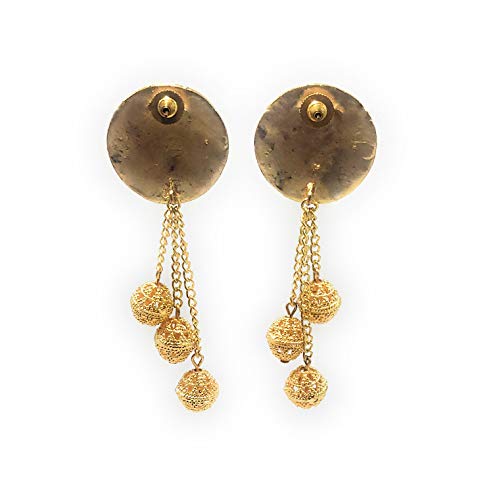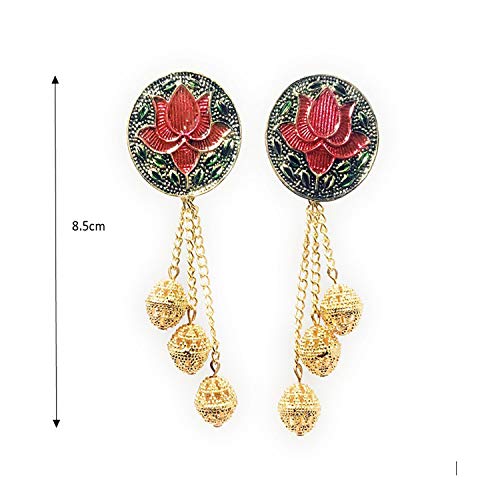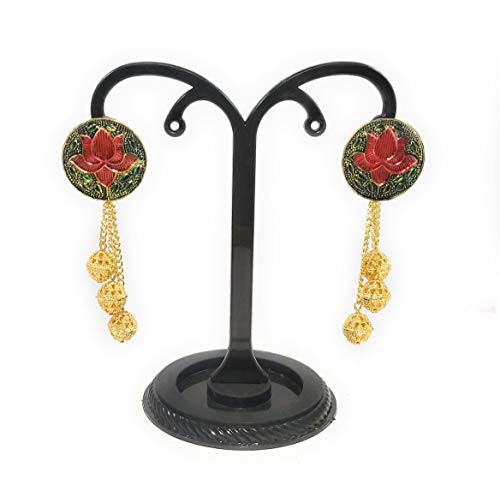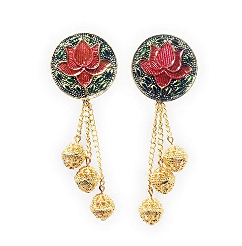 Hand ted meenakari earrings in antique golden colour.The lotus and leaves have hand ted meenakari work and have dangling handmade golden metal beads. It has a very elegant loook and is not very heavy to wear.Suitable for party dialywear festive wear.Earring back type: push studEarring length: approx 8.5cm