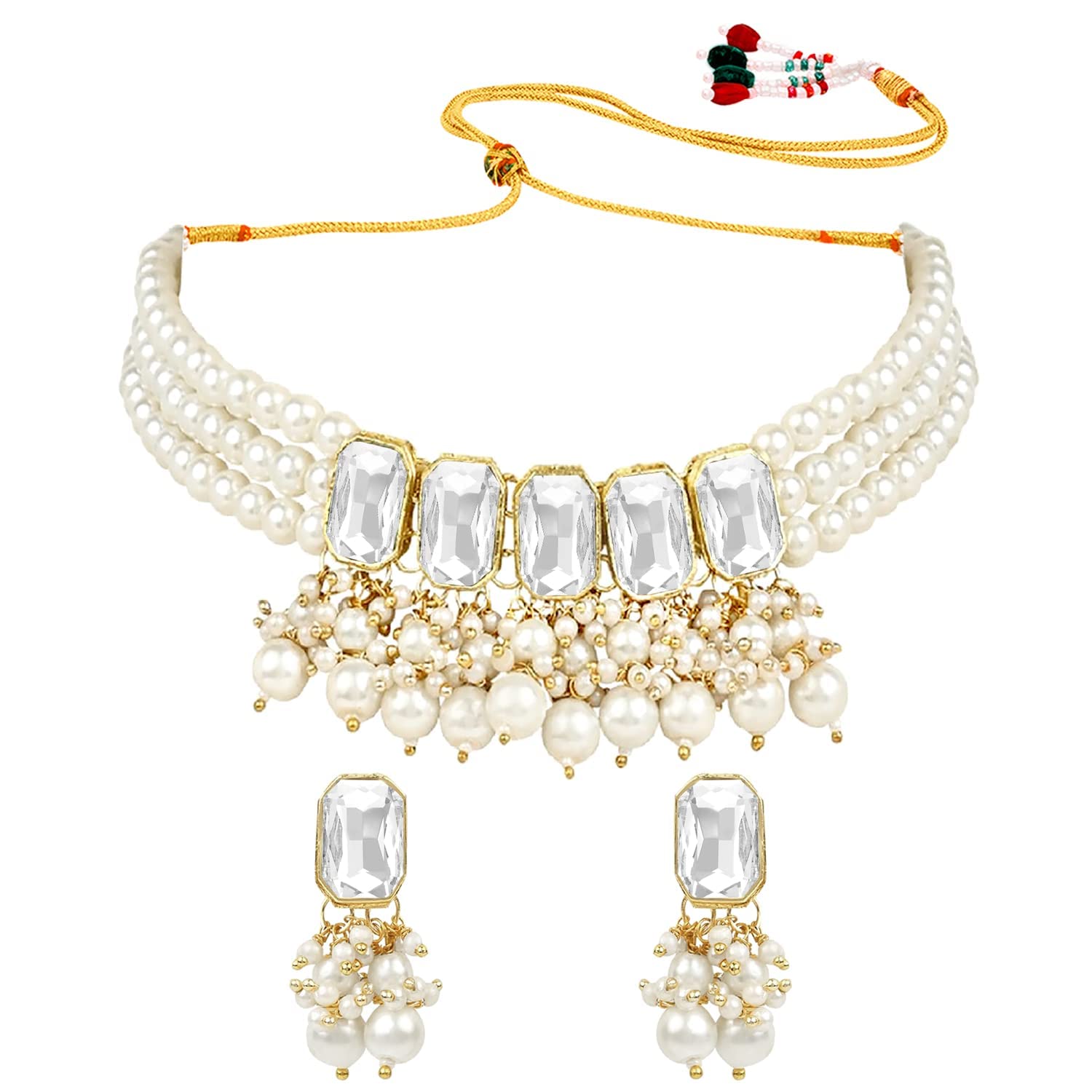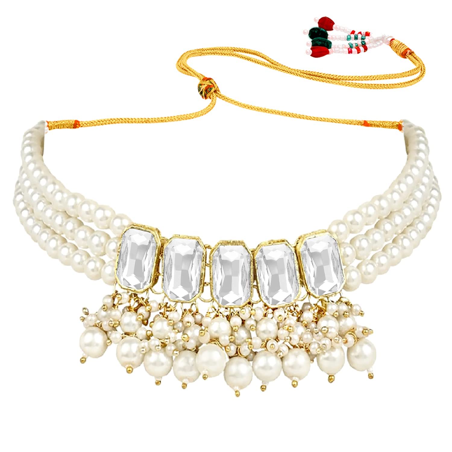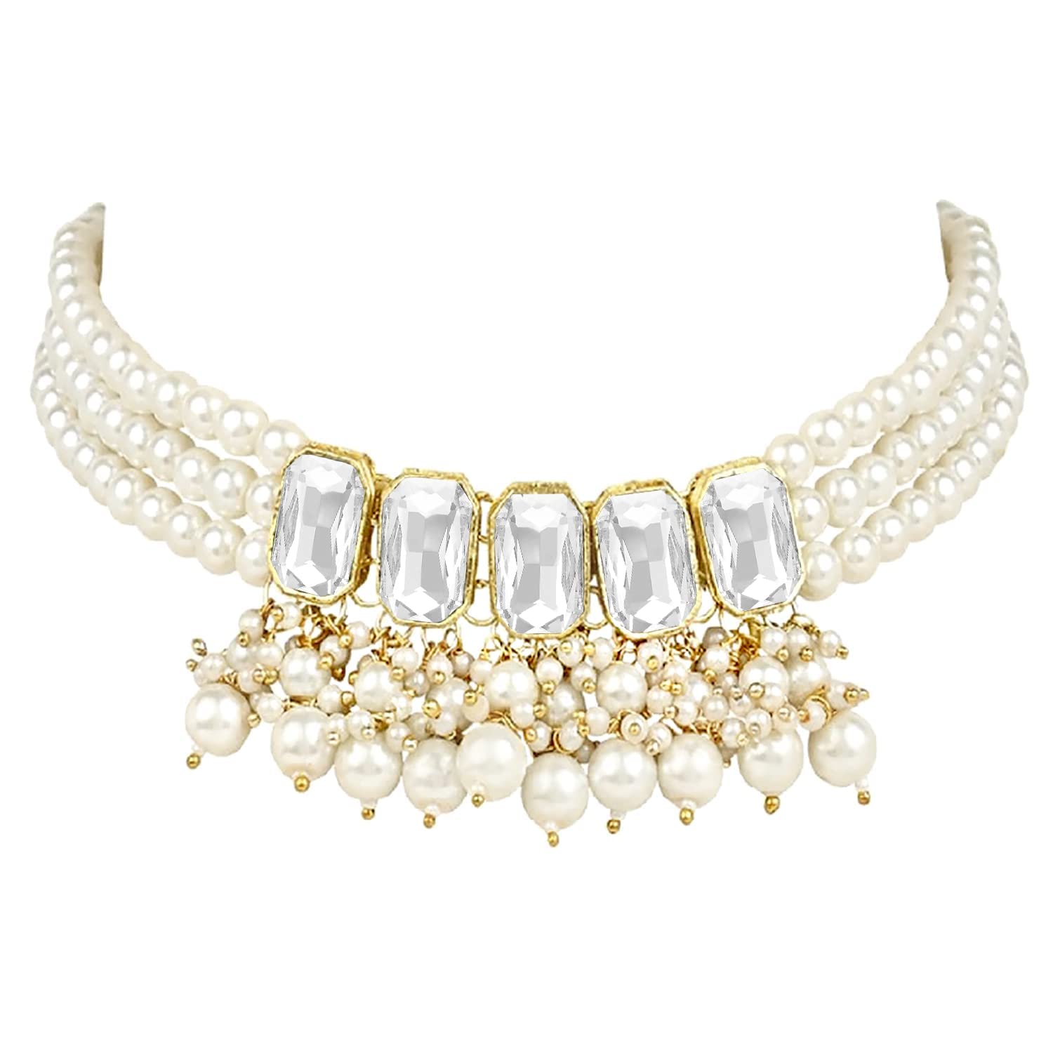 I Jewels 18K Gold Plated Traditional Stone Studded Multi Layered White Pearl Choker Necklace Jewellery Set with Earrings for Women And Girls (IJ355)