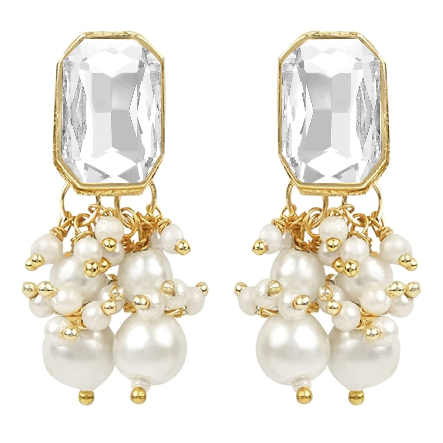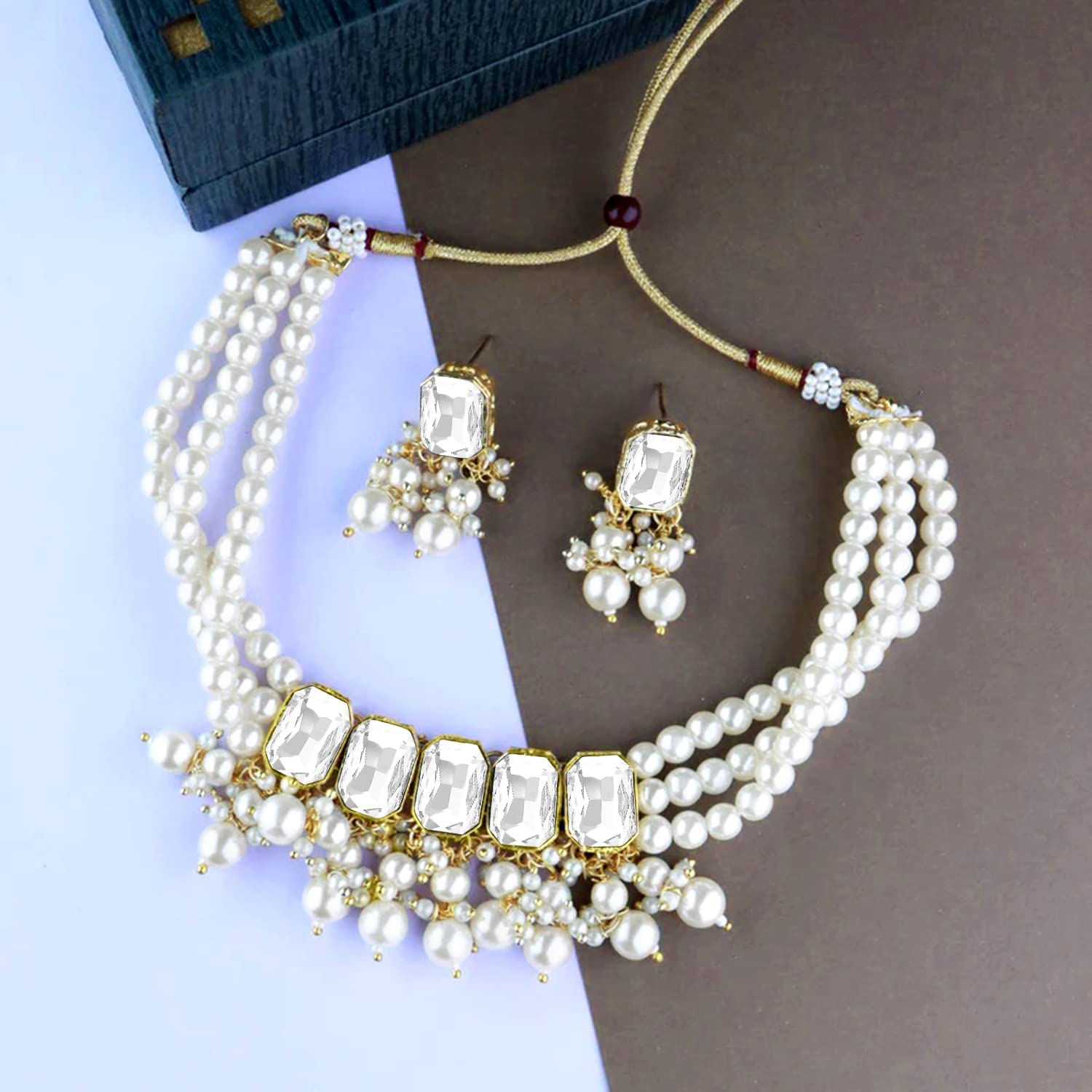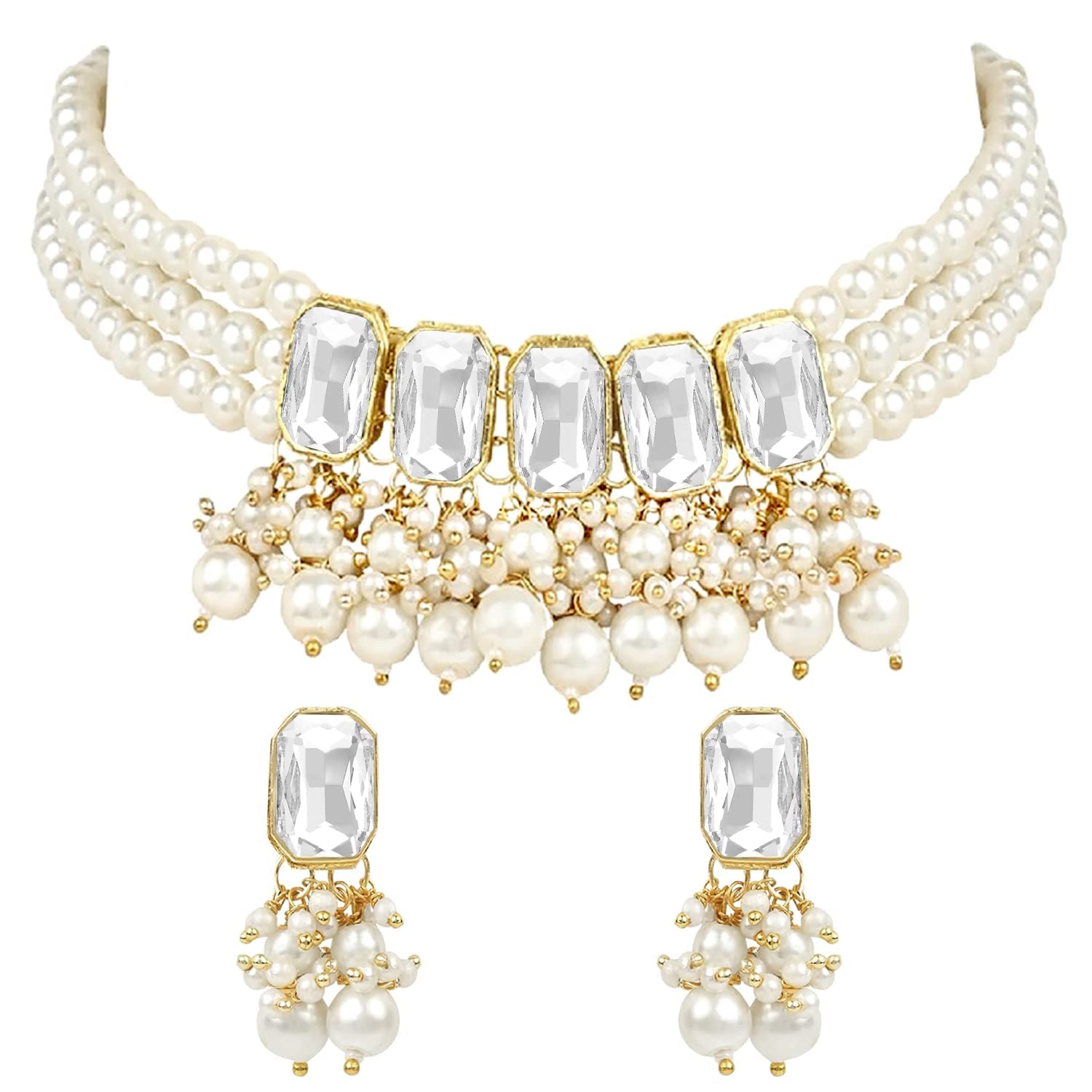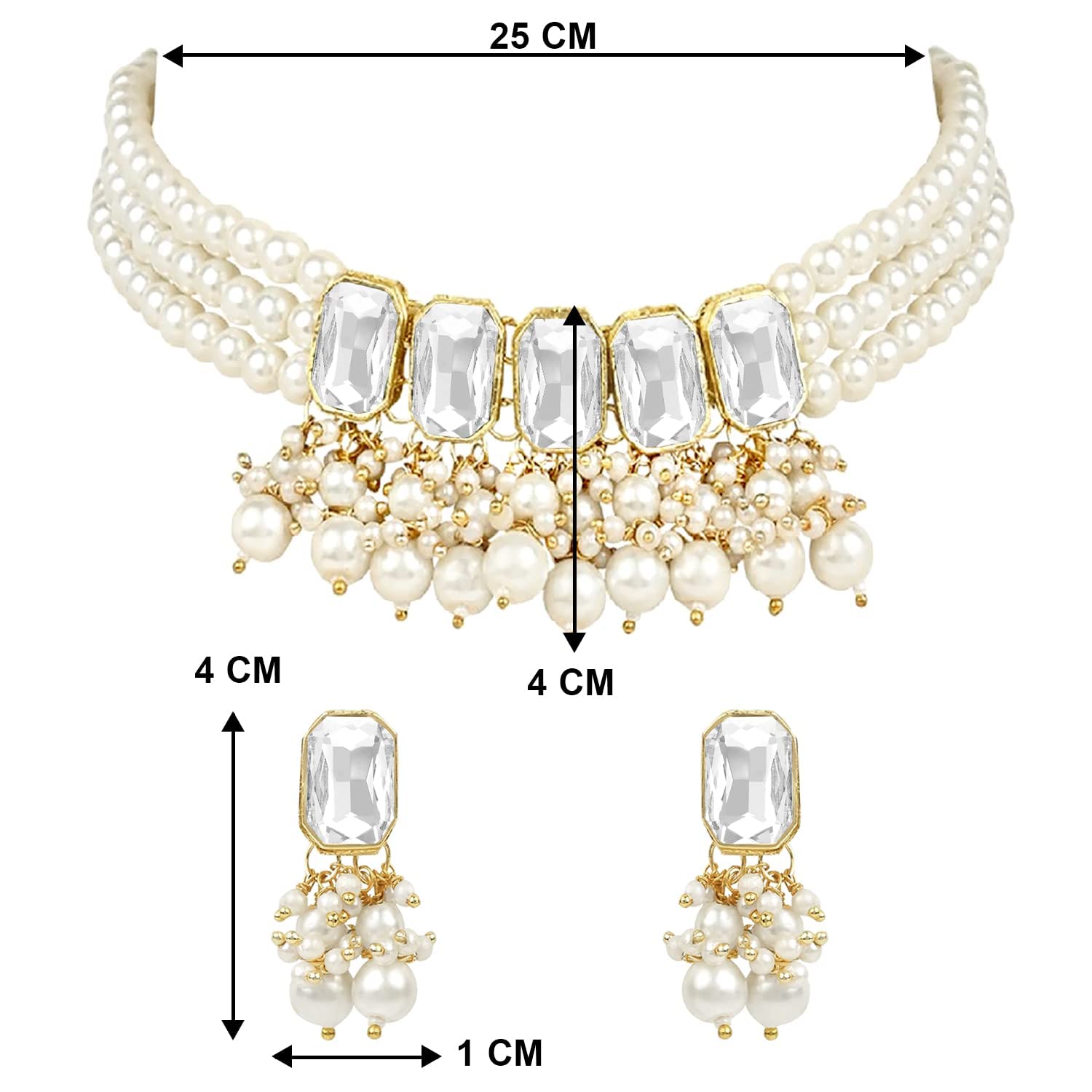 I Jewels 18K Gold Plated Traditional Stone Studded Multi Layered White Pearl Choker Necklace Jewellery Set with Earrings for Women And Girls (IJ355)