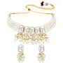 This mesmerizing jewellery set features a gorgeous choker necklace and a pair of matching earrings both adorned with traditional stone studding and white pearls. The choker is crafted with multiple layers of lustrous pearls that beautifully complement the intricately designed gold plating. The necklace features a drawstring closure which ensures a comfortable fit while also adding to the overall aesthetic appeal. The combination of white pearls and traditional stone studding creates an enchanting contrast making this jewellery set an ideal choice for a special occasion or formal event. The choker necklace sits comfortably and elegantly around the neck accentuating the collarbone and adding an air of sophistication to any outfit. The pearls add a touch of classic beauty to the necklace while the stone studding adds a pop of color and texture. The earrings are lightweight and comfortable to wear while also adding a touch of glamour to the overall look. This stone studded pearl choker with earrings set is versatile and can be paired with a variety of traditional and contemporary outfits making it a must-have addition to any jewellery collection. It is perfect for a bride or a bridesmaid as well as for any special occasion such as a wedding anniversary or birthday.