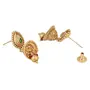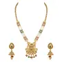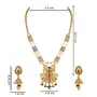 The necklace features a stunning arrangement of lustrous pearls that gracefully drape along your neckline creating a captivating visual effect. Each pearl is carefully selected for its quality and radiance adding a luxurious touch to the piece. The intricate gold plating on the brass pendant and beads exudes a regal charm reminiscent of antique temple jewelry. Complementing the necklace the jhumki earrings boast a beautifully detailed design that perfectly complements the overall aesthetic. The delicate jhumka-style drops dangle gracefully catching the light with every movement and drawing attention to your face. The earrings are lightweight and comfortable to wear ensuring that you can flaunt your style with ease.