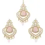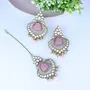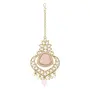 A beautiful set of jewelry that will add elegance and grace to any traditional attire.These chandbali earrings are gold plated and adorned with shimmering kundan stones that sparkle in the light. The earrings feature traditional pearl hangings that add a touch of sophistication to the design. Accompanying the earrings is a matching maang tikka which is studded with kundan stones and pearls. The maang tikka beautifully complements the earrings and adds a touch of glamour to any hairstyle.This jewelry set is perfect for weddings festivals and other traditional occasions. It also makes a great gift for any special woman or girl in your life.