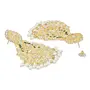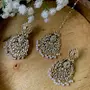A stunning piece of jewelry that beautifully blends tradition with contemporary style. Crafted with intricate meena work and adorned with kundan stones and pearls these chandbali earrings are a true work of art. The gold plating adds a touch of elegance and sophistication to the design.The earrings feature a traditional pearl hanging that adds a graceful touch to the overall look. The matching maang tikka complements the earrings perfectly with its exquisite kundan and pearl detailing.This jewelry set is perfect for weddings parties and other special occasions where you want to make a statement. It is also a great gift for any woman who loves traditional jewelry with a modern twist.
