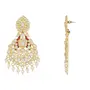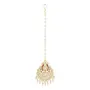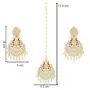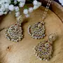 A stunning piece of jewelry that beautifully blends tradition with contemporary style. Crafted with intricate meena work and adorned with kundan stones and pearls these chandbali earrings are a true work of art. The gold plating adds a touch of elegance and sophistication to the design.The earrings feature a traditional pearl hanging that adds a graceful touch to the overall look. The matching maang tikka complements the earrings perfectly with its exquisite kundan and pearl detailing.This jewelry set is perfect for weddings parties and other special occasions where you want to make a statement. It is also a great gift for any woman who loves traditional jewelry with a modern twist.
