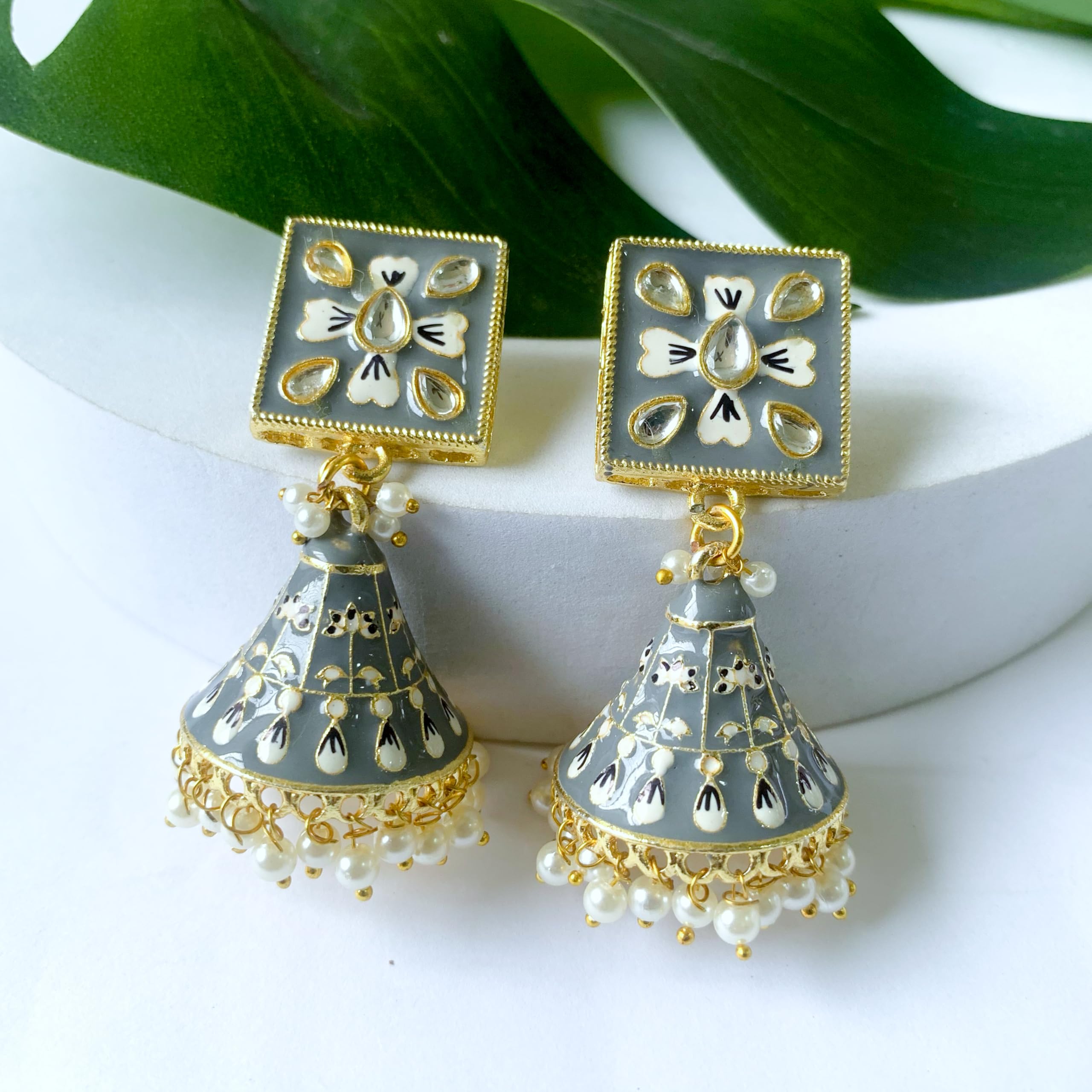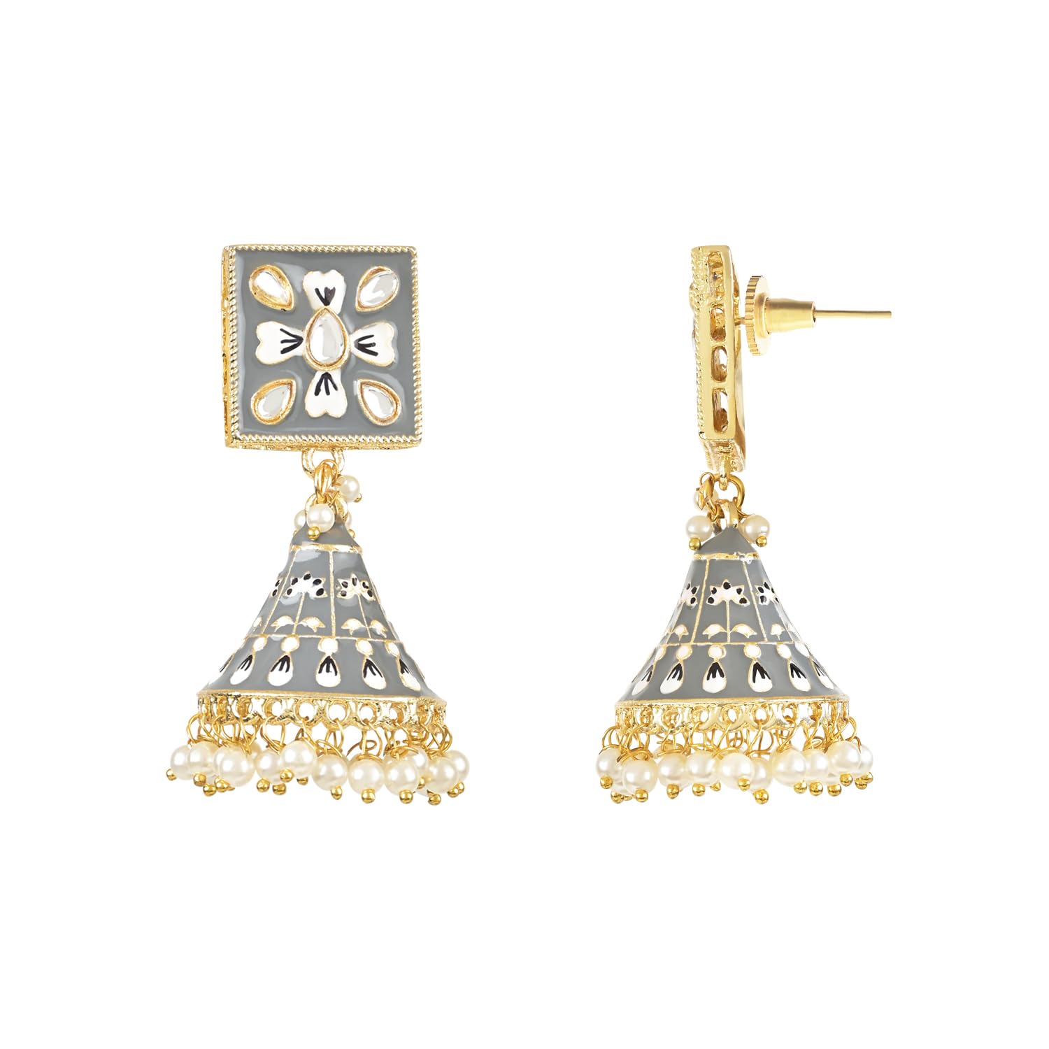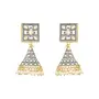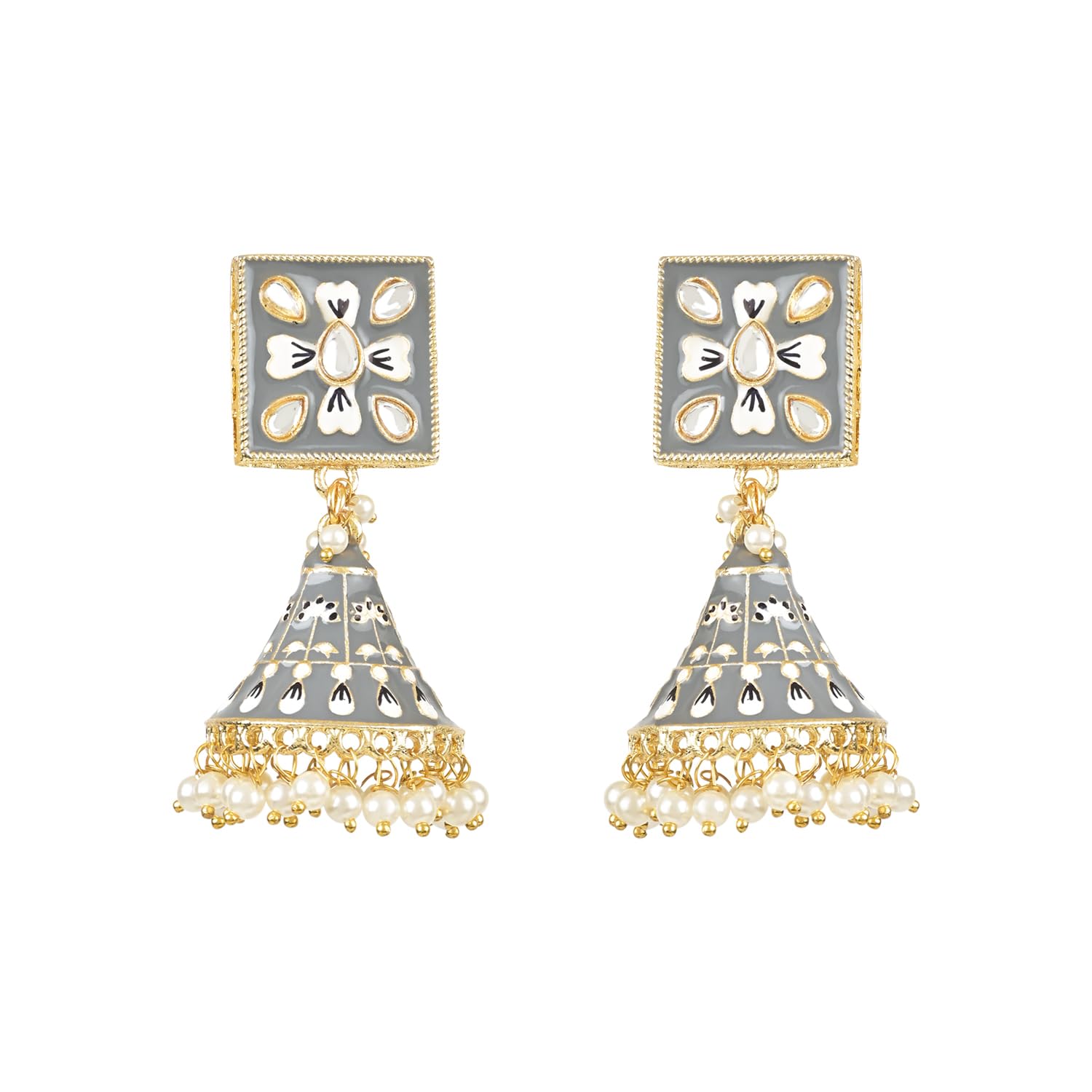 These earrings are a testament to the exquisite craftsmanship and artistry of India making them a cherished addition to any jewelry collection. Indulge yourself or surprise a loved one with these enchanting earrings that effortlessly blend tradition and contemporary style leaving a lasting impression wherever they go.Designed for comfort and wearability these earrings are lightweight and easy to adorn for extended periods. They effortlessly complement traditional Indian attire such as sarees lehengas and anarkalis as well as adding a touch of elegance to modern outfits.The centerpiece of these earrings is the stunning Kundan studded detailing. The radiant Kundan stones are meticulously set adding a regal touch and a mesmerizing sparkle to the design. The careful arrangement of pearls enhances the elegance of the earrings exuding grace and sophistication with every movement.
