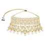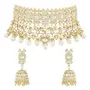 This exquisite bridal jewelry set features a stunning gold-plated choker necklace adorned with traditional white kundan and stone embellishments. The necklace is a embellished with sparkling kundan stones and pearls. The necklace are matching jhumka earrings that perfectly complement the overall design. These jhumka earrings feature intricate kundan and stone work with delicate pearl hangings that add movement and charm to the set. The combination of white kundan stones pearls and gold plating creates a timeless and regal look making this jewelry set ideal for a bride or anyone seeking to make a statement on a special occasion. The intricate craftsmanship and attention to detail ensure that this set stands out adding a touch of traditional charm.