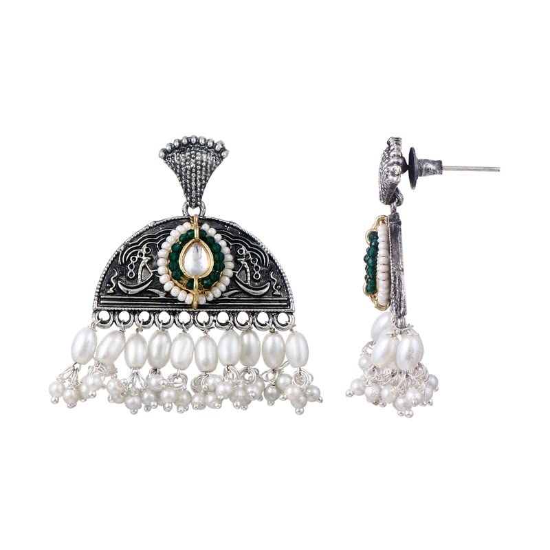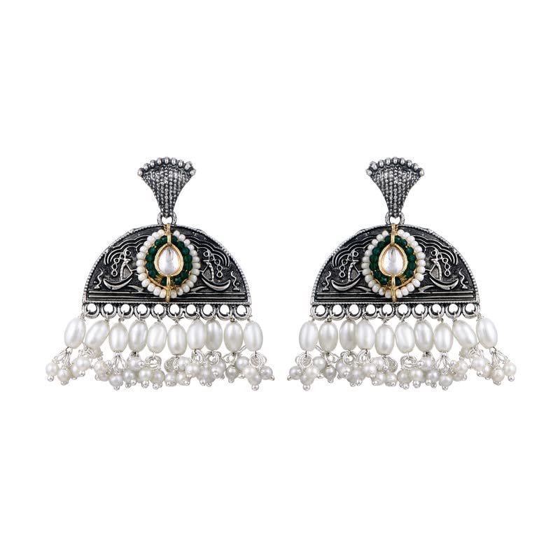 Perfect for day-to-night accessorizing this SILVER FILIGREE CRAFT - CHANDI TARKASHI oxidised silver finish easy to mix n match oxidized earrings for women will make a statement addition to your persona and jewellery collection. These oxidised earrings are intrinsically designed to create a dynamic effect with soft shimmer. The product comes in perfect packaging. Designer and trendy earrings from SILVER FILIGREE CRAFT - CHANDI TARKASHI (A brand by RSN INDIA group) perfect for all occasions - daily wear casual wear office wear party wear birthday anniversary wedding festivals functions ceremony ideal for anywhere go around. We at SILVER FILIGREE CRAFT - CHANDI TARKASHI being the oxidised jewellery manufacturer and supplier brings the best of designs craftsmanship quality purity and services at the most competitive prices you can imagine. So dont wait any longer be bold make your statement in the world now discover it know it touch it have it with most trustable brand SILVER FILIGREE CRAFT - CHANDI TARKASHI. SILVER FILIGREE CRAFT - CHANDI TARKASHI offers you to feel and live the emotions with its exclusive collection of traditional ethnic designs oxidised fashion jewellery. SILVER FILIGREE CRAFT - CHANDI TARKASHI oxidised earrings are ideal for party office & daily wear. These silver oxidised earrings can be used on birthday marriage engagement and any occasion. Our SILVER FILIGREE CRAFT - CHANDI TARKASHI oxidised jewellery is crafted as per internationally accepted material and quality standards. These earrings are made from brass no lead or no nickel used and are studded with best AAA quality kundan gemstone beads crystal american diamonds colored gemstones. You can find variety of earrings with us like stud earrings drop earrings dangler jhumki earrings jhumka earrings tops earings boho earing dangle drop earrings heavy earrings and light weight earring and many more styles within earrings for women / earrings for girls. SILVER FILIGREE CRAFT - CHANDI TARKASHI oxidised ethnic earrings features a unique one of a kind traditionally embellishes with an antique finish. So order now to be a center of attraction in any gathering.