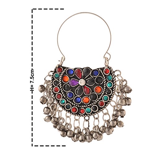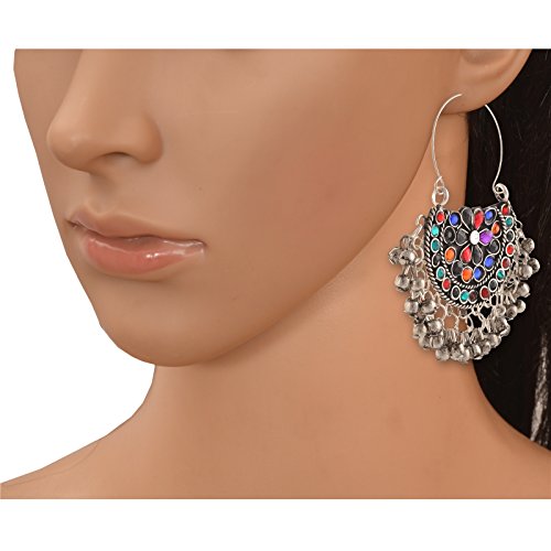 Stunning ethnic dangler Afghani hook chandbali earrings in silver tone.Floral design with filigree work and studded with multi color rhinestones gives a traditional touch to the earrings.Silver beads dangle to create a striking look.Perfect with ethnic & traditional wear. Can also be a perfect gifting option for friends and dear ones.Earrings Length=3'' earrings Width=1.5''
