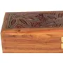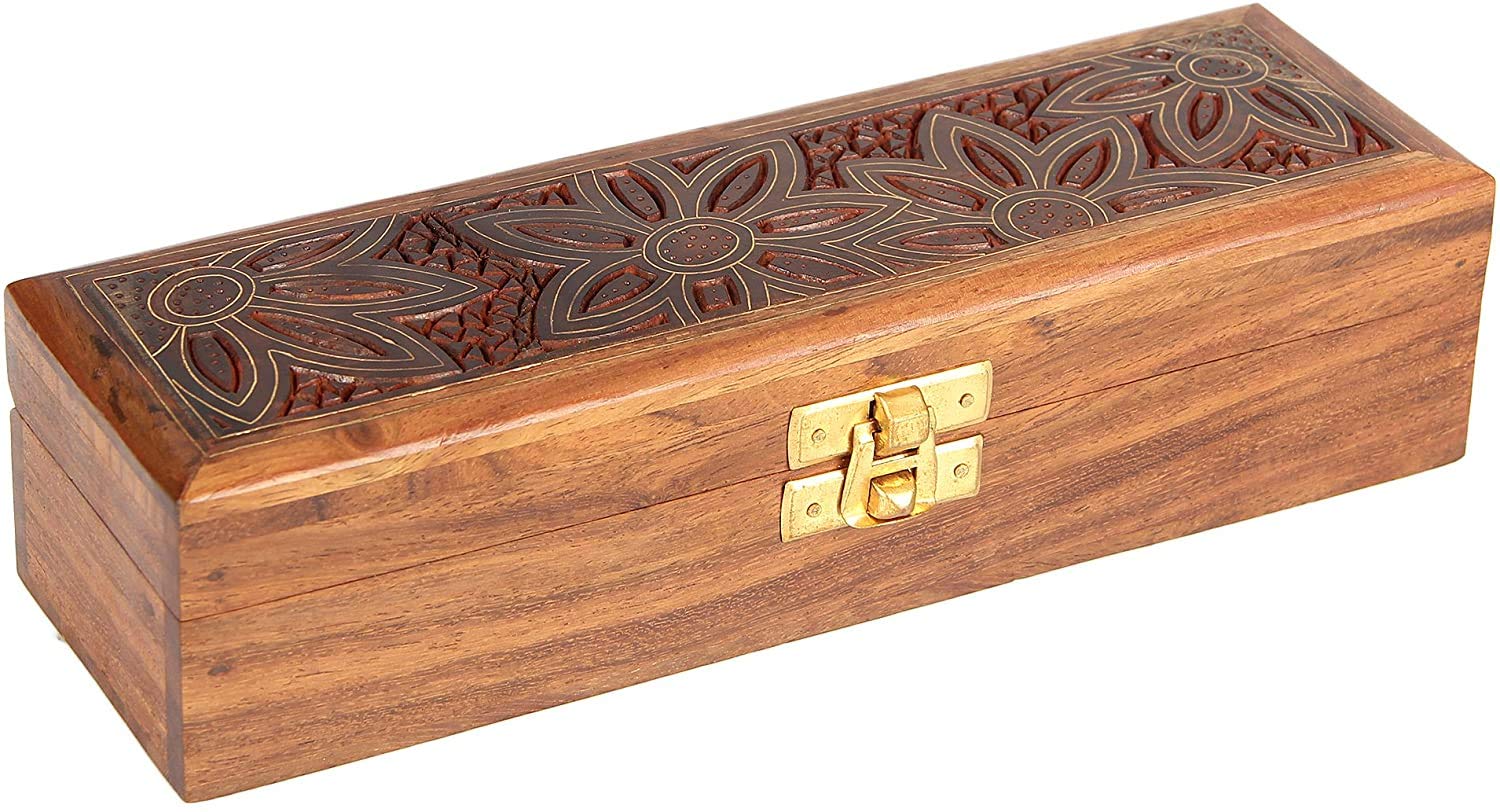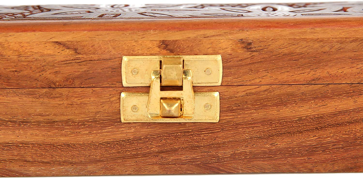 This hinged wooden jewelry box with beautiful decorative hand carved drawing and inlay work has been handmade by artisans of pilkhua in utter pradesh state of north india Jewelry boxes are thoughtful gifts for women and girls as they can be treasured for years to come and displayed in a special place where they can be seen daily. If you're looking for a cheap jewelry box to give as an inexpensive gift to someone special but still want to make sure that lovely lady or girl gets a gift of the absolute finest quality our Handmade Indian Wood Jewelry Box is the perfect choice. Our jewelry box for girls and women is a design you won't find in stores or anywhere else on Amazon. Each of jewelry box is handcrafted out of sheesham wood an Indian renowned for its durability and handsome natural grain. The Handmade Indian Wood Jewelry Box is made with traditional techniques that have been passed down through generations of artisans from Saharanpur India. The skills of these woodworkers are world renowned and make this jewelry box truly beautiful and capable of standing the test of time. On the lid of the Handmade Indian Wood Jewelry Box is a beautiful motif produced out of inlaid brass. The technique is called tarkashi and involves carefully hammering pieces of genuine brass into engravings in the wood. Small holes are punched into the flowers to add a pleasing texture to the design. The careful attention to detail makes the jewelry box more than just a place for storing earrings bracelets rings and necklaces. The piece doubles as a decorative item that can be displayed anywhere in the home. The Handmade Indian Wood Jewelry Box measures 8 inches by 2.5 inches by 2 inches outside. Inside the box's dimensions are 7.25 inches by 1.75 inches by 1 inch. The box features a brass clasp and brass hinges to complement the color of the inlay. Choose a cheap jewelry box that is low in price but not cheaply made.