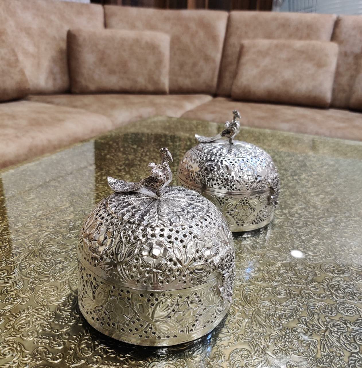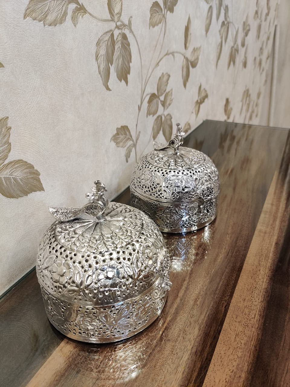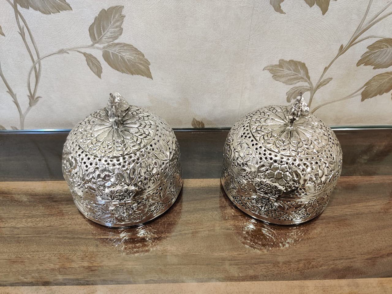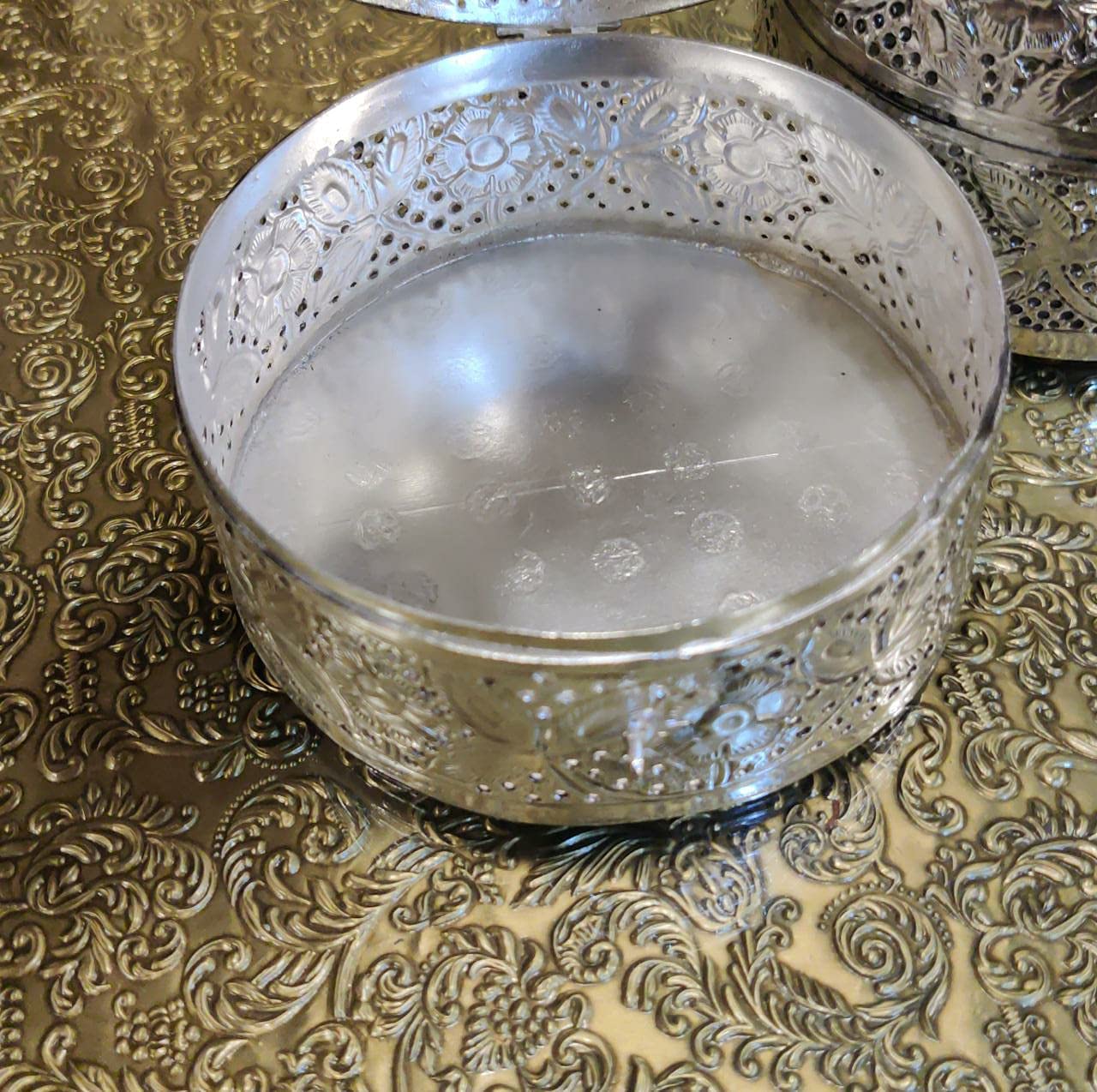 This elegant JEWELLERY CUM DRY FRUIT box made of wooden base and brass cover enhanced with german silver embossing work is a result of meticulous craftsmanship.This unique blend of material craft and art work has lent an appeal that will resonate brilliantly with the festive mood of your near and dear ones on special occasions like diwali. Gift precious articles in our exclusive German silver hand engraved boxes.so your memories are captured in something very exclusive!!