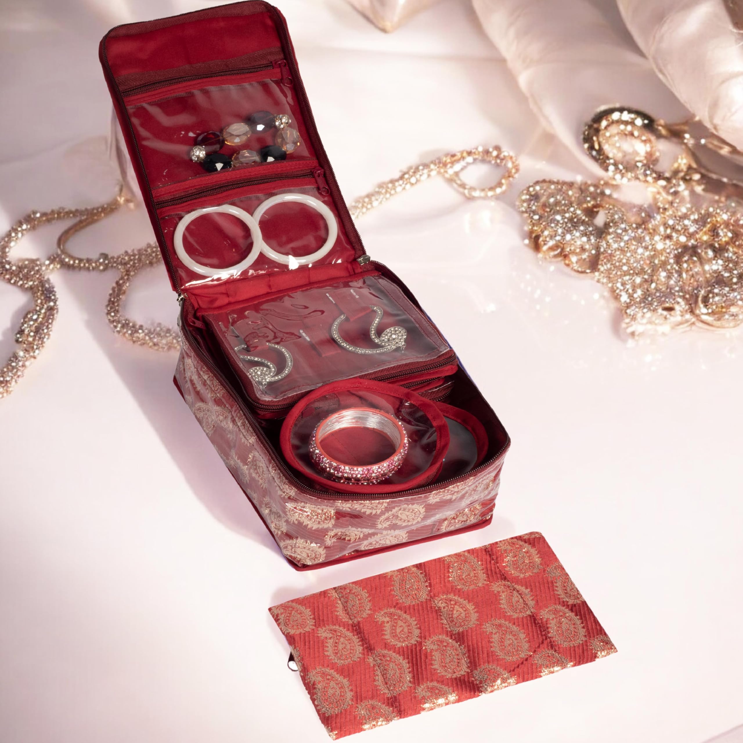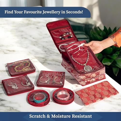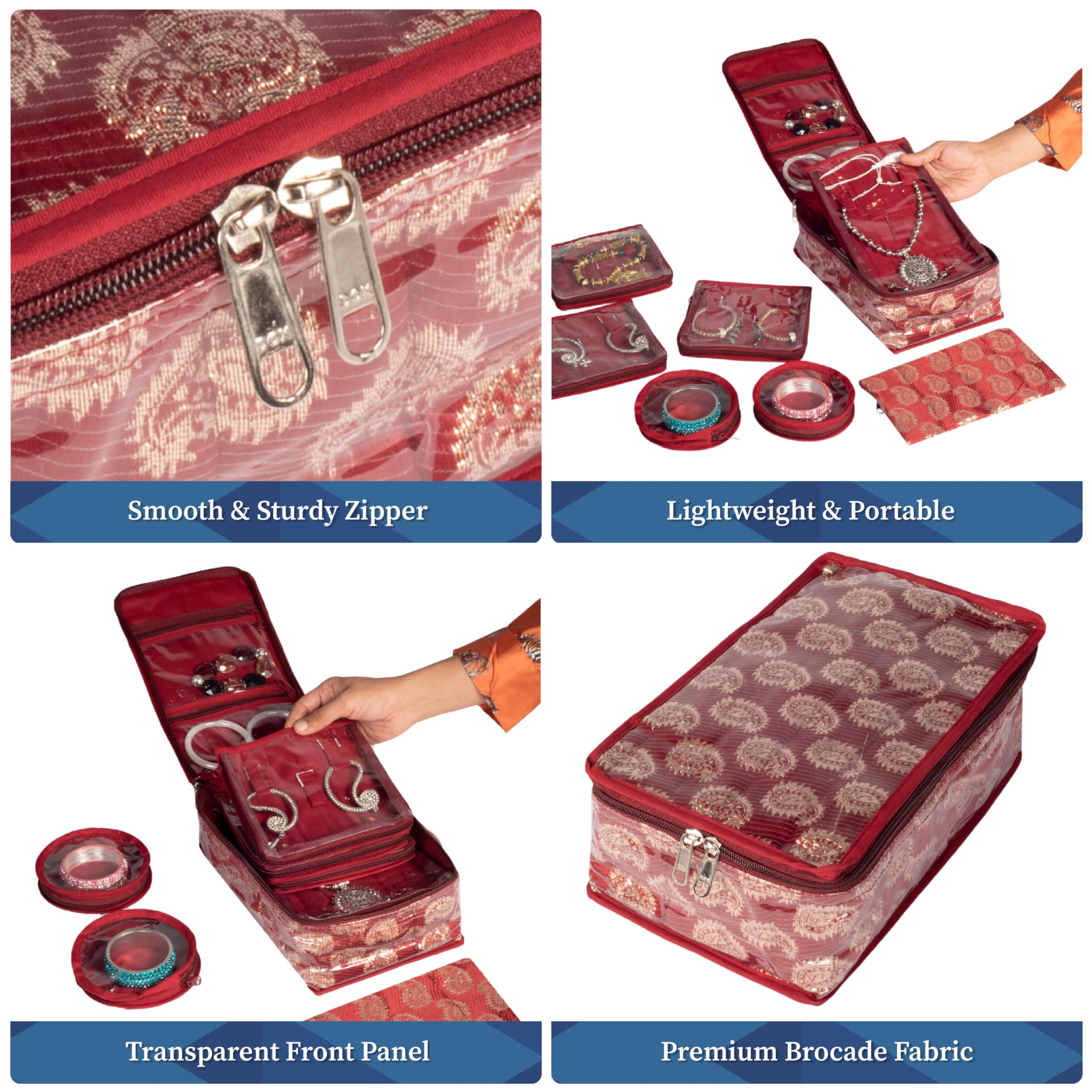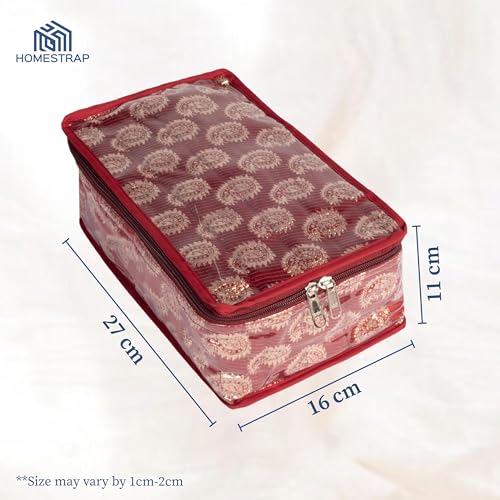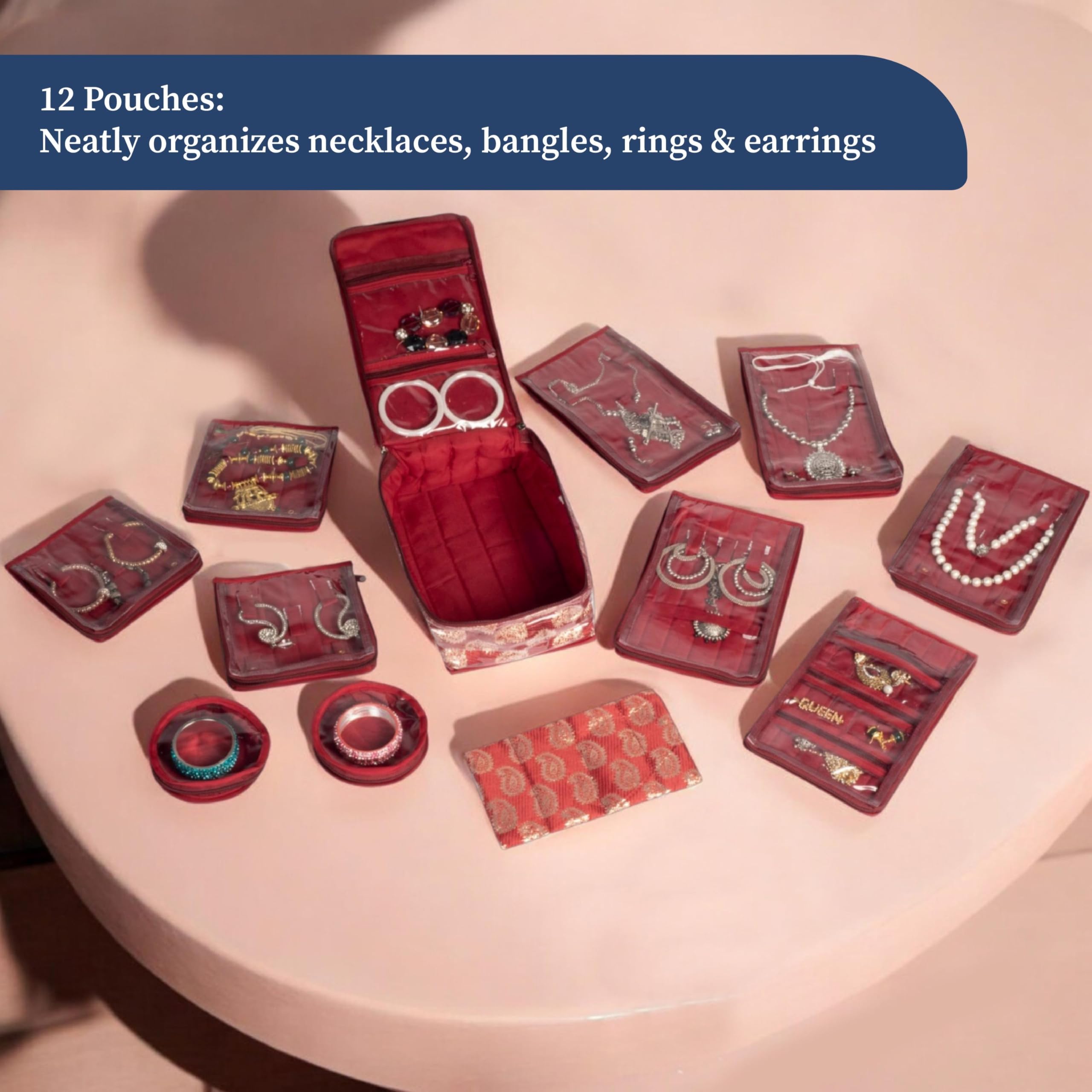 HomeStrap beautiful brocade jewellery organizer/pouch with 12 pouches to store and organize all your jewellery accessories bangles watches etc. This beautiful organizer is made from heavy brocade and laminated from all the sides to protect your stuff inside from dust dirt moisture etc. The inside lining is of satin to further protect your jewellery and accessories from scratches. HomeStrap jewellery organizer contains 12 different size pouches to store thing as per your need different size pouches for bangles necklaces rings earrings watches etc. Best option to organize your jewellery in bank lockers while travelling or even for gifting.