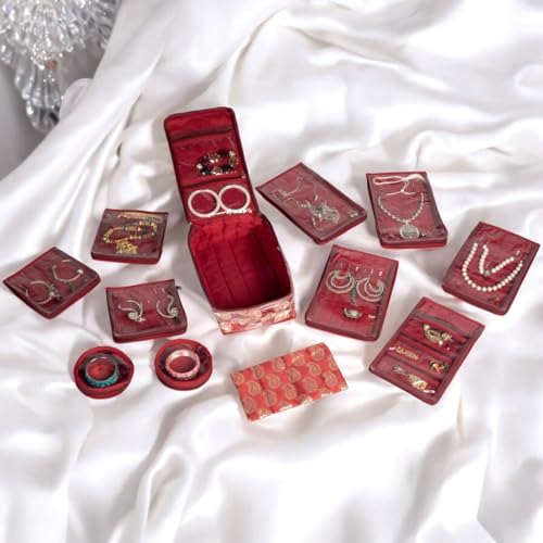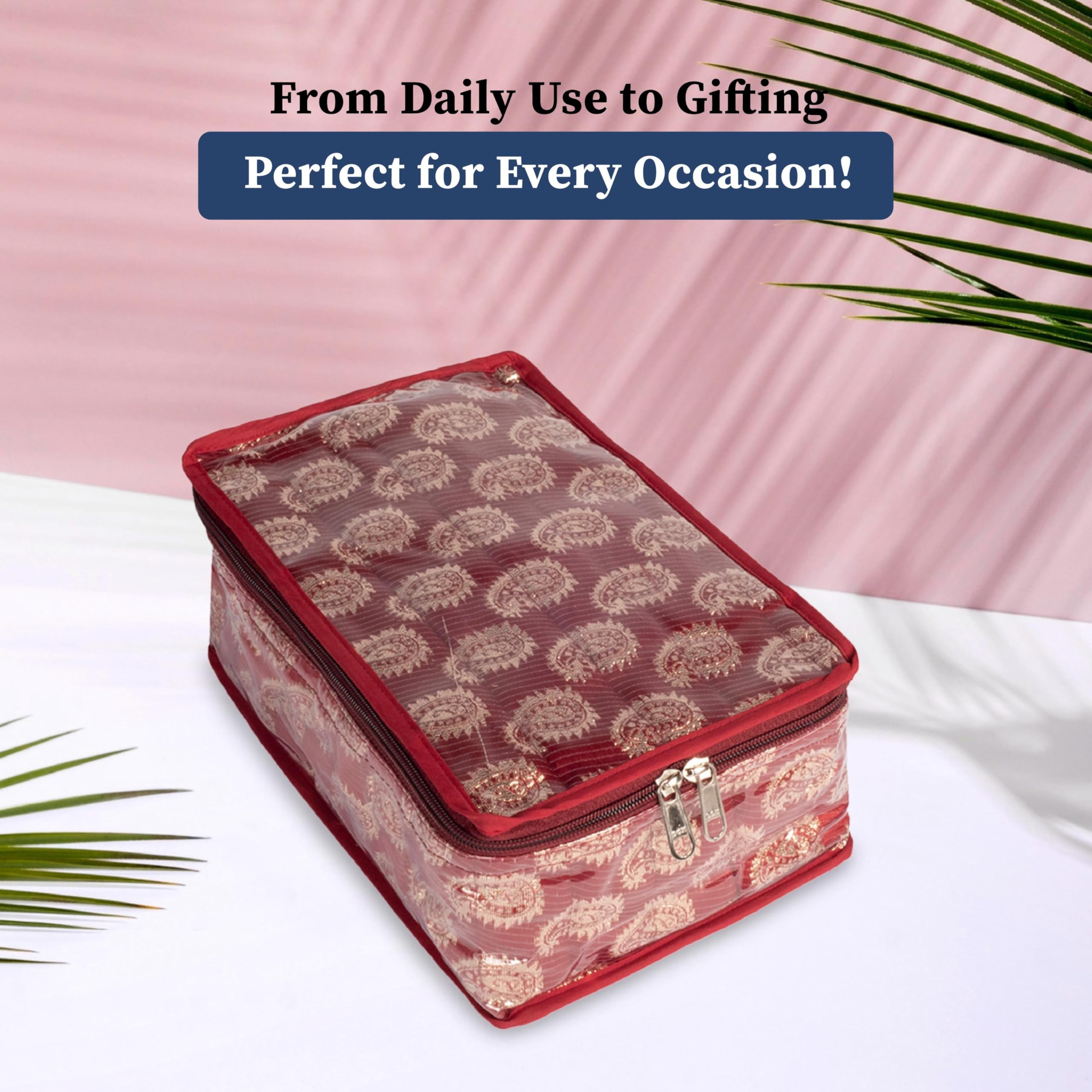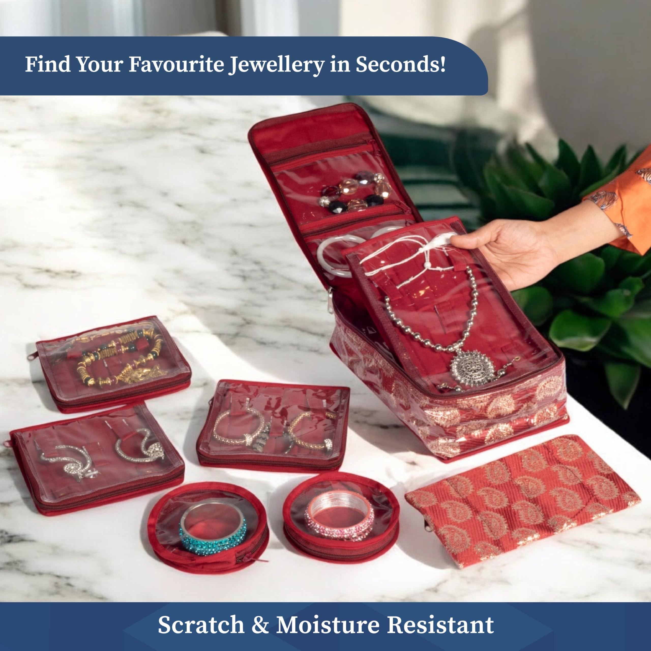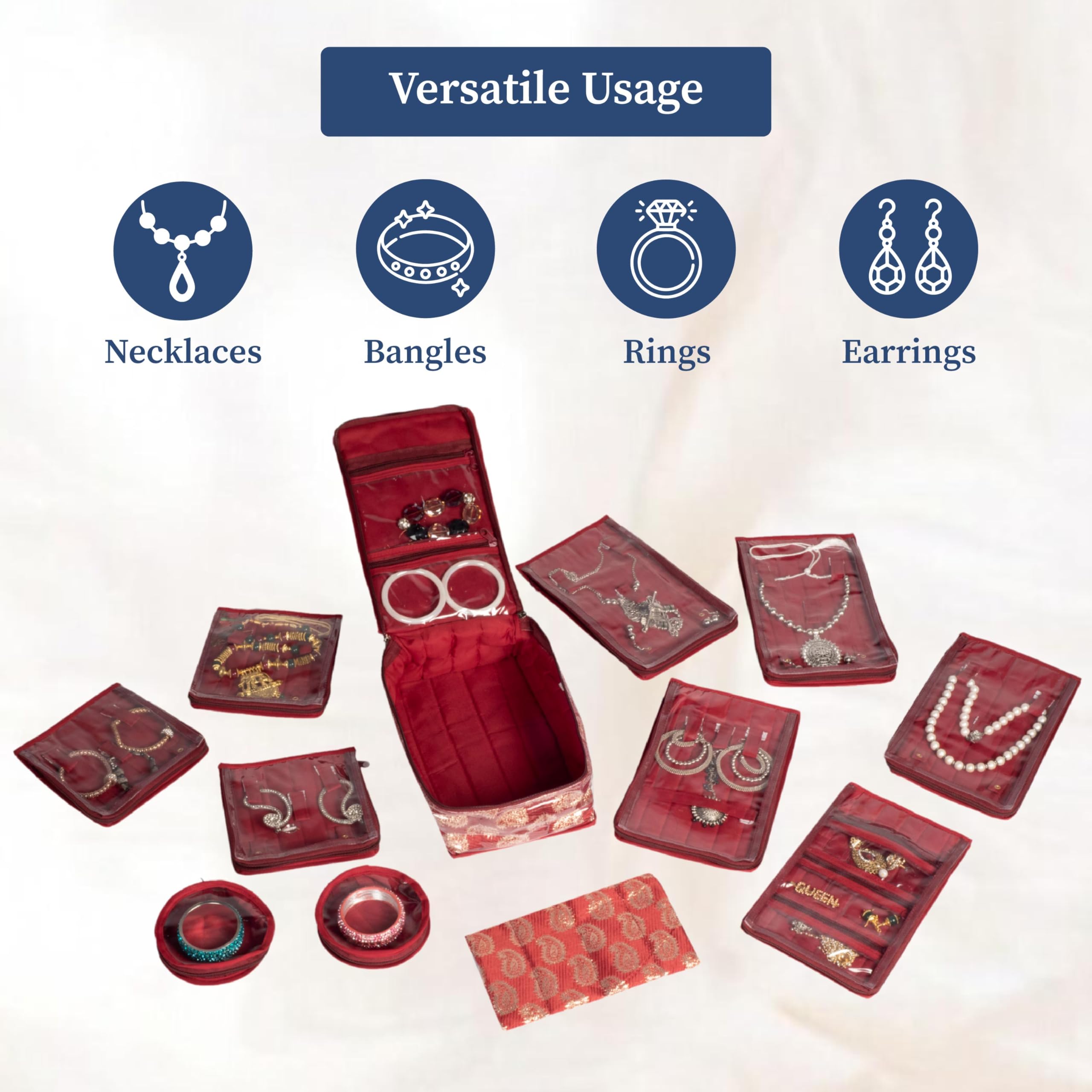 HomeStrap beautiful brocade jewellery organizer/pouch with 12 pouches to store and organize all your jewellery accessories bangles watches etc. This beautiful organizer is made from heavy brocade and laminated from all the sides to protect your stuff inside from dust dirt moisture etc. The inside lining is of satin to further protect your jewellery and accessories from scratches. HomeStrap jewellery organizer contains 12 different size pouches to store thing as per your need different size pouches for bangles necklaces rings earrings watches etc. Best option to organize your jewellery in bank lockers while travelling or even for gifting.