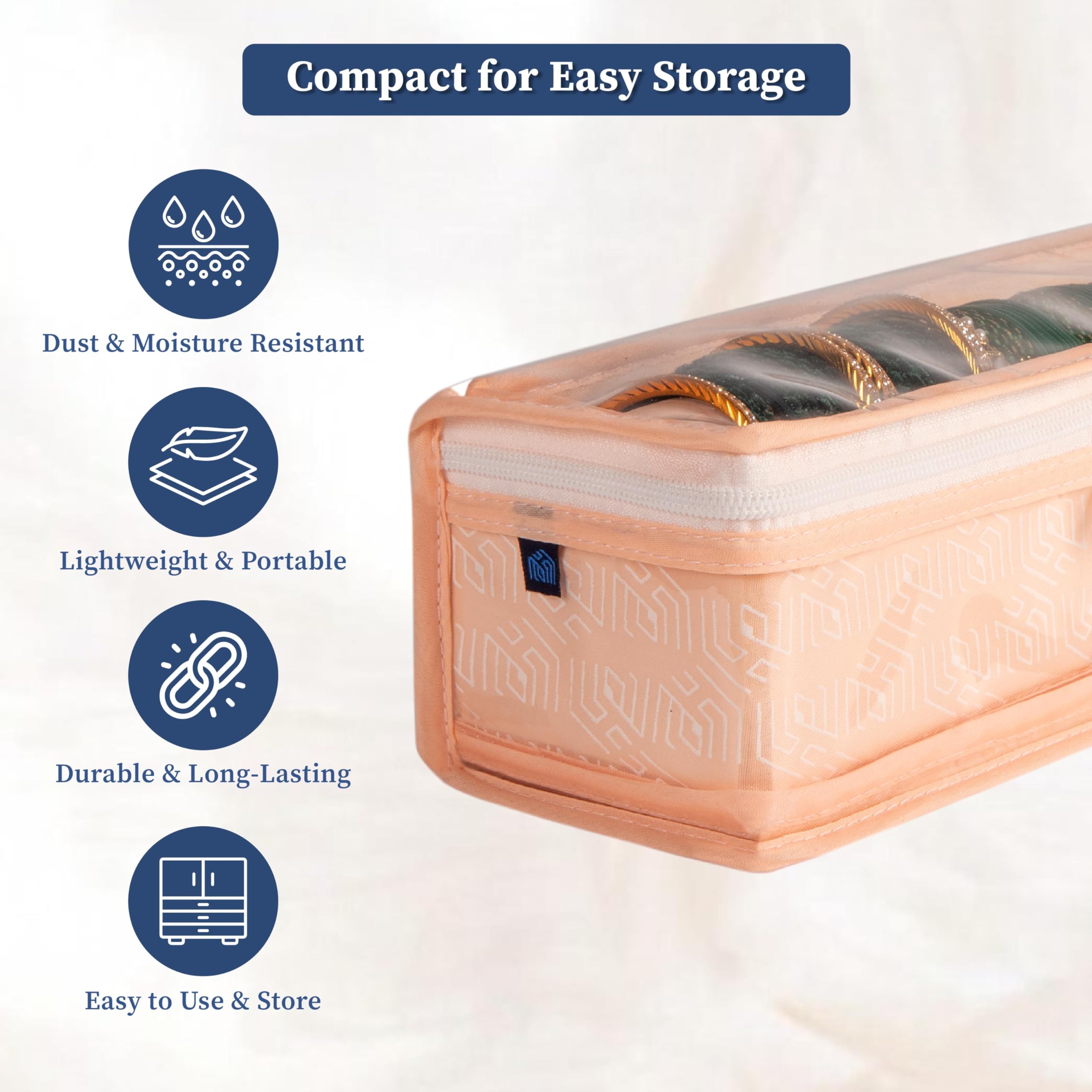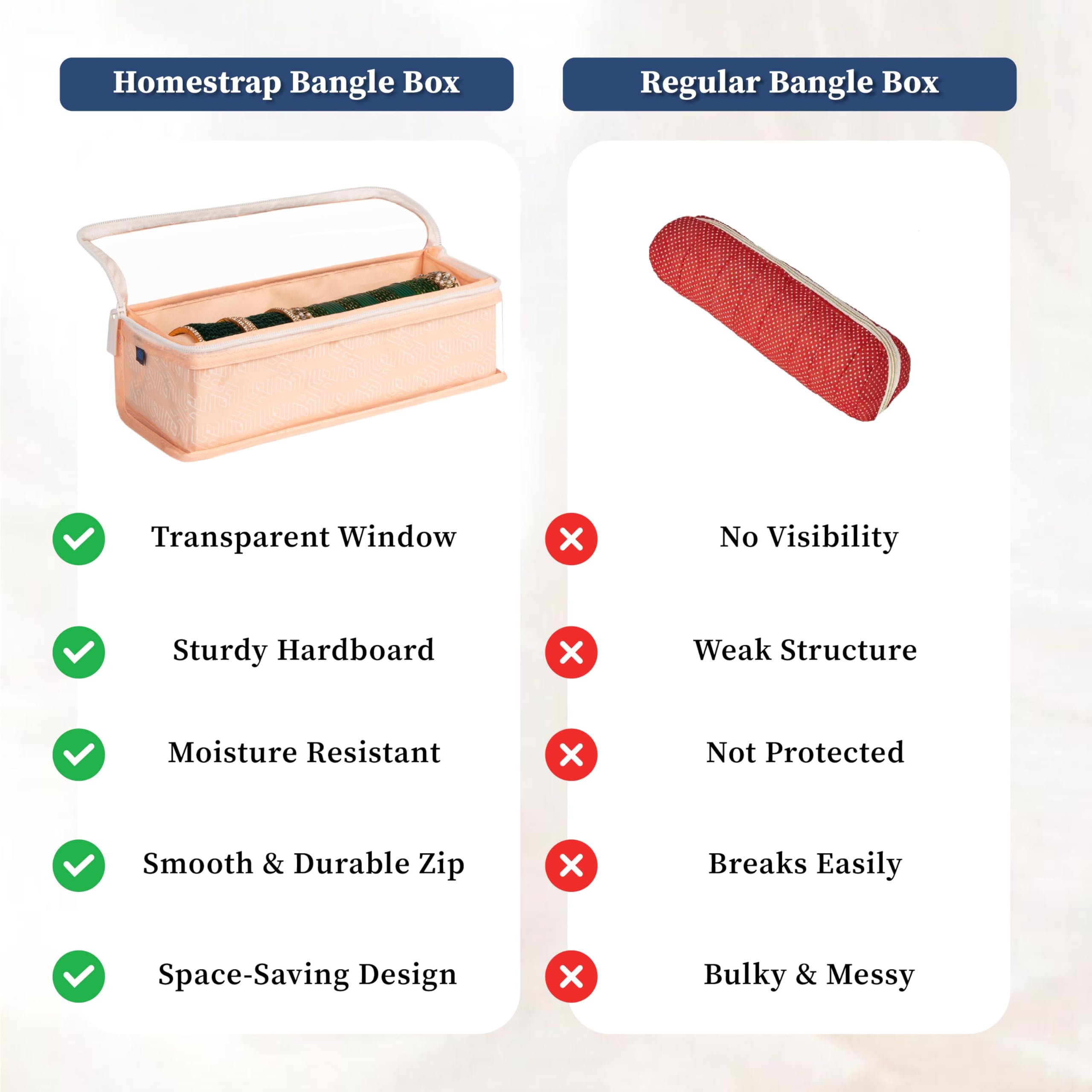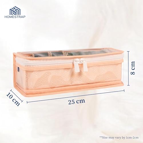 Tired of tangled bangles or missing sets when you need them? The Homestrap Cotton Bangle Box is designed to keep your bangles chudis bracelets and watches neatly organized and protected. With a built-in rod your accessories stay securely in place preventing breakage or scratches. The transparent PVC top allows for quick and easy visibility so you can find the perfect set without opening the box. Made from durable non-woven fabric with a thick PVC layer this bangle box is waterproof and dustproof ensuring your jewellery stays safe from moisture and dust. Built with hardboard on all sides it maintains its shape while being lightweight and foldable for easy
