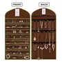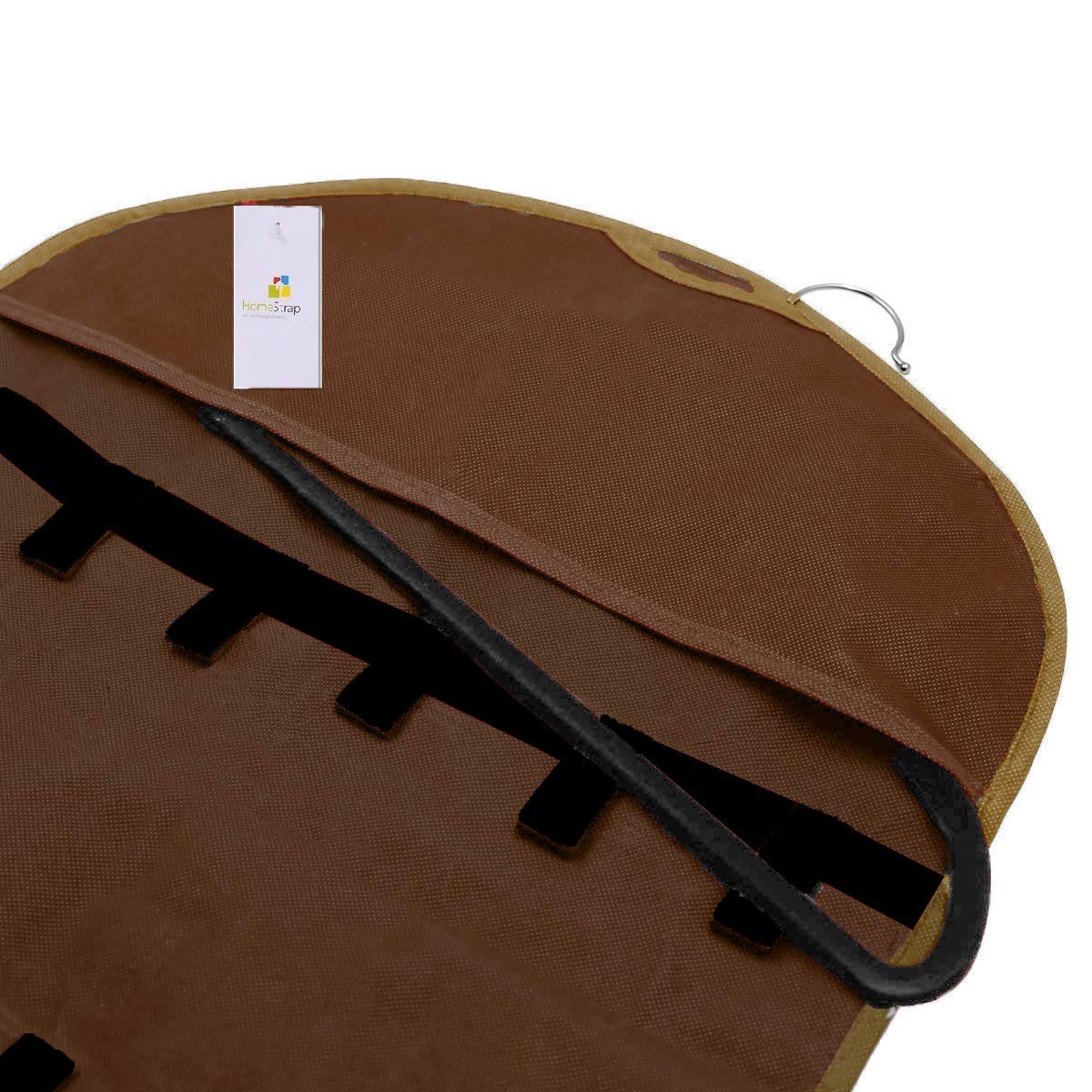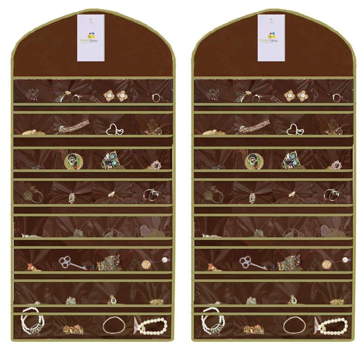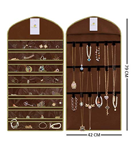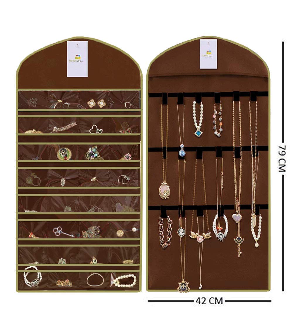 HomeStrap Hanging Non-Woven Jewellery Organizer Are you always choosing the same jewellery because you've forgotten about - or can't find - the rest? HomeStraps hanging Jewellery Organizer have a smart solution to organize your jewellery - check it out: One side with 24 clear pockets another side with 18 loops. Clear pockets make it easy to see your jewellery cosmetics hair and fashion accessories. Loop fastener makes you don't have to worry about your long necklace getting a tangled up with one another. Each clear pocket is approx. 2 3/4 inches tall and 4 inches long. Measured from the middle of the top to the bottom it is 30 3/4" The width is 17 1/3"A standard hanger needed easily hangs as part of your closet and takes a very small space. There is an opening through which to slip a hanger and a flap that covers it at the top Storage solution for jewellery cosmetics hair and fashion accessories and all of life's curiosities hide your expensive ones in clothes. A nice gift idea for women mom girlfriend. Product Name: HomeStrap 32 Pocket Hanging Jewellery Storage cum Organizer Dimension: Height (79CM) Width (42CM);Â A hole on the top for the hanger to go through Material: Made up of high-quality Non woven material which makes it highly durable and long-lasting. Design: The hanger design allows the organizer is situated anywhere including on doors on walls and in closets. Foldable: It can be folded up to a compact size which is perfect for travelling. Colour: Brown