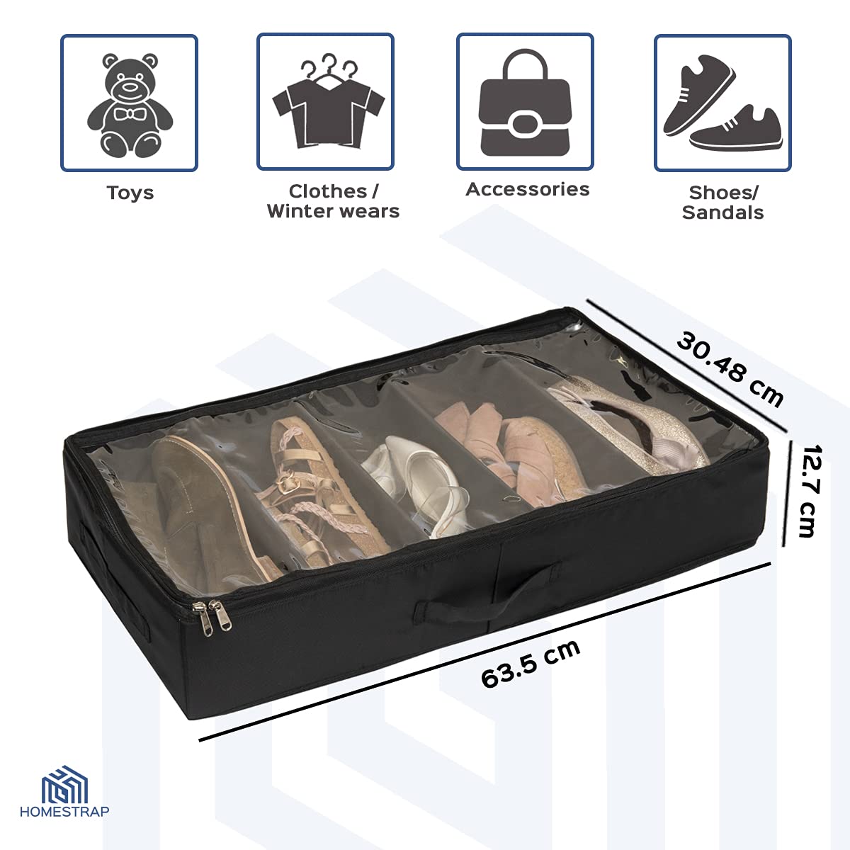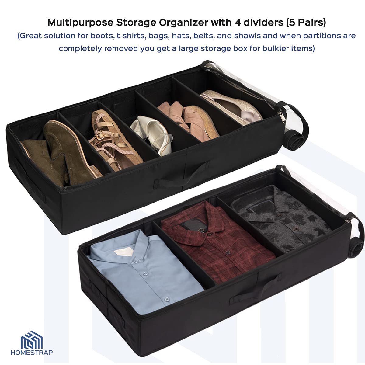 Homestrap Rectangular Polyester Large Underbed Storage Bag/Bin Organizer 5 Pairs Customizable Slots| Clothes Blanket/Comforter storage container with Handles (Black)