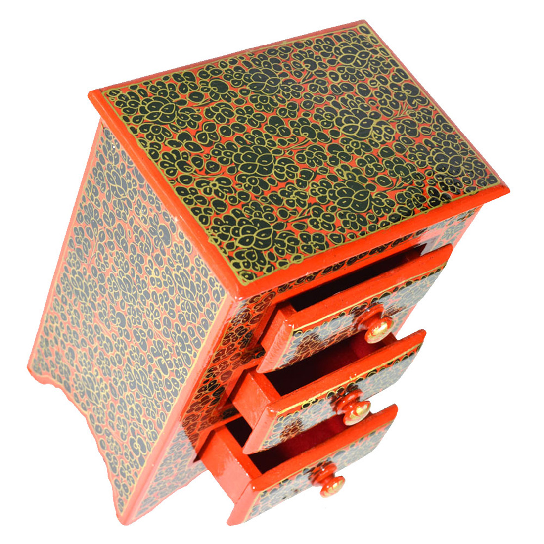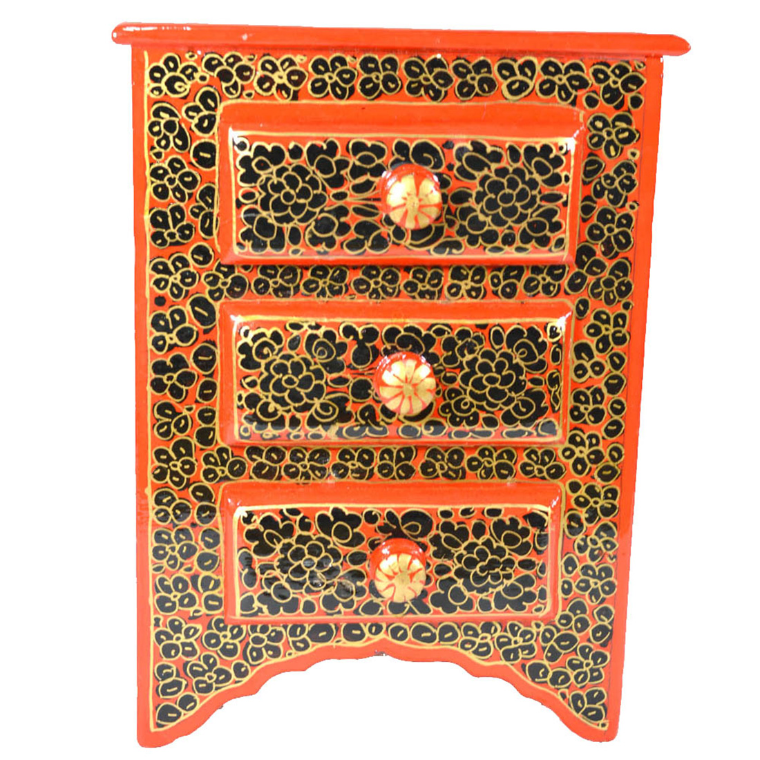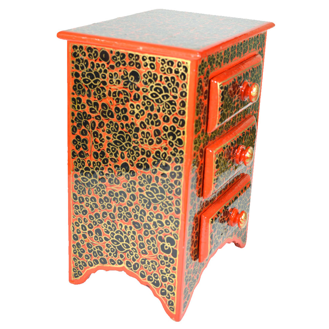 A charming chest of three drawers in saffron shades with floral pattern made of paper mache by the artisans from Kashmir, India. This unique handicraft is an all occasion gift to add a touch of taste to any home while keeping the knick knacks sorted.