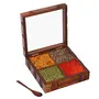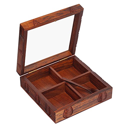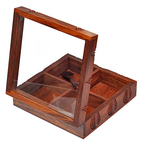 Wooden spice box 8 inch Cooking can be considered as an art and the kitchen as a canvas. Just like in painting you will need the right spices and ingredients at the right place for creating a masterpiece food. It would be very convenient if all the spices are placed close to each other so that they can be accessed easily while cooking. The wooden spice box helps you to store up to four different spices close to each other without mixing them up. The main advantage of using the wooden spice box is that the wooden material preserves the purity of the spices and keeps them in a natural environment and improves the taste of the dishes. The box can be also used for serving the nuts and dry fruits to your friends and family.