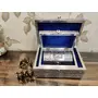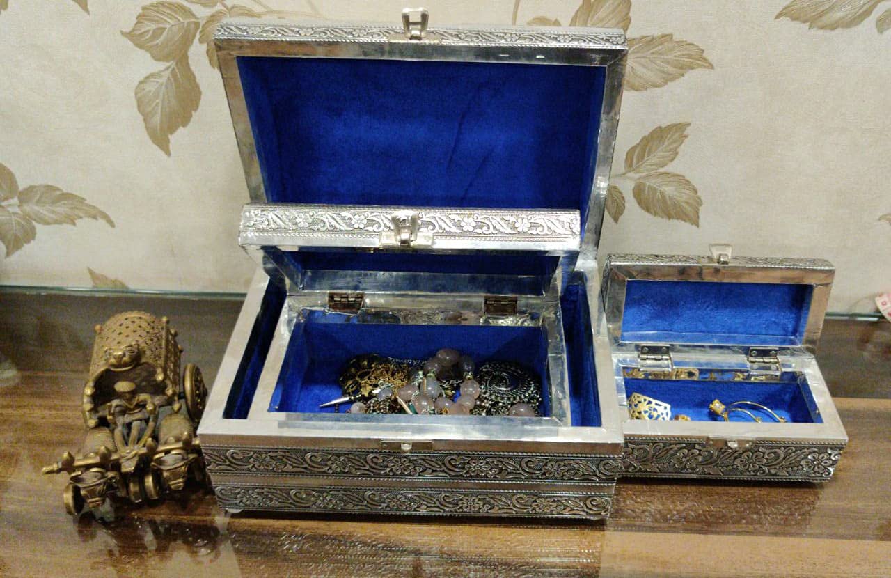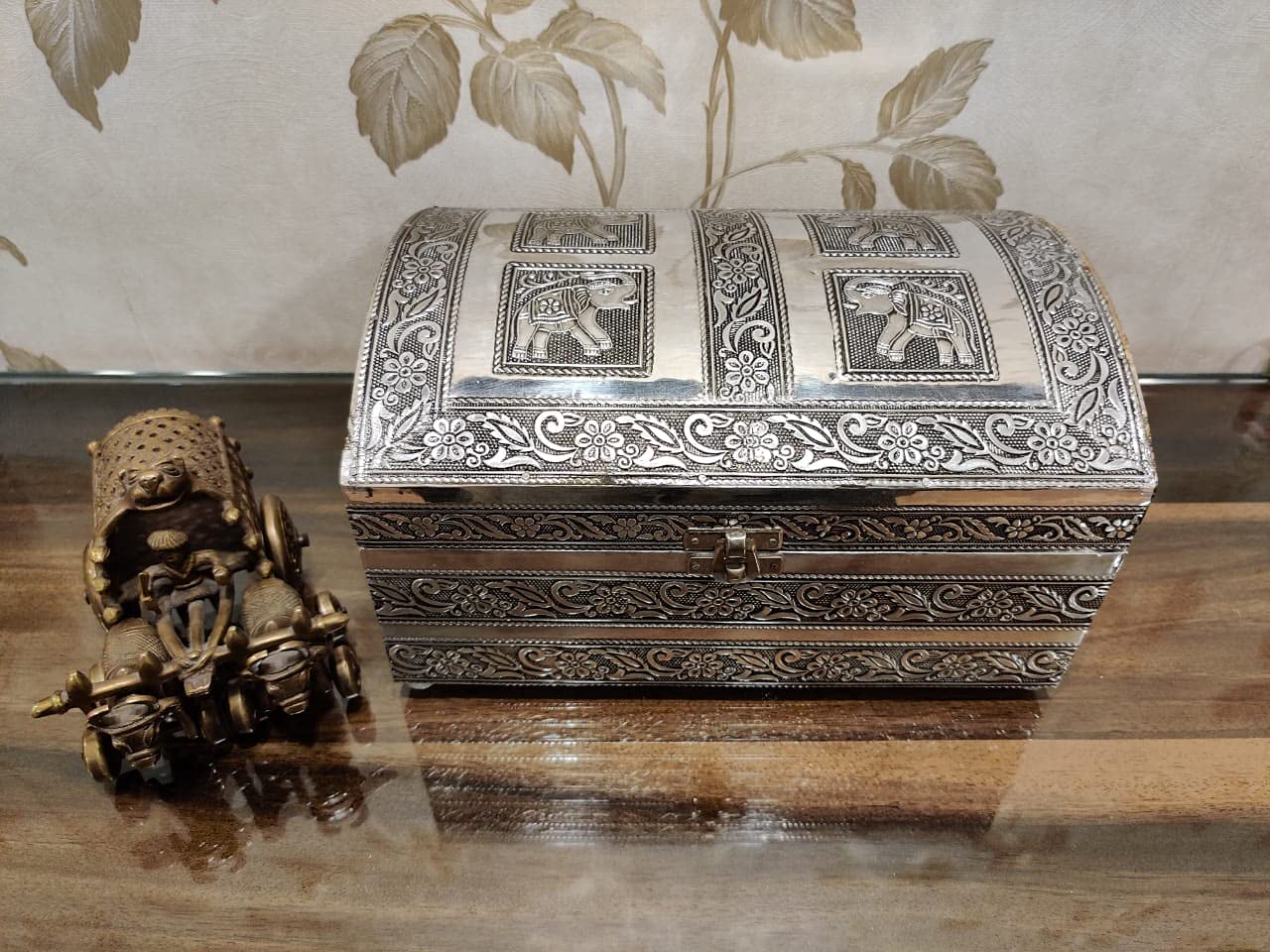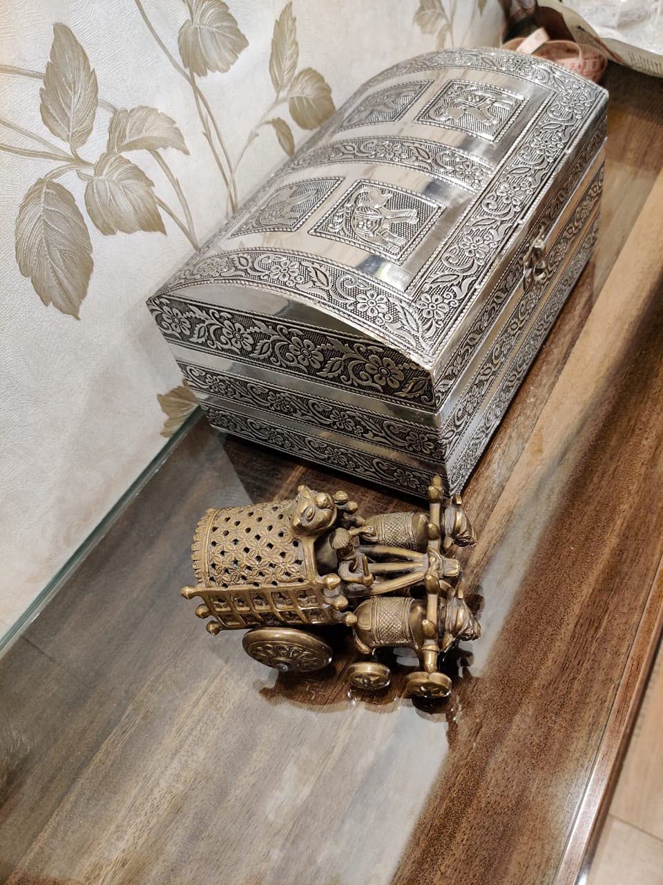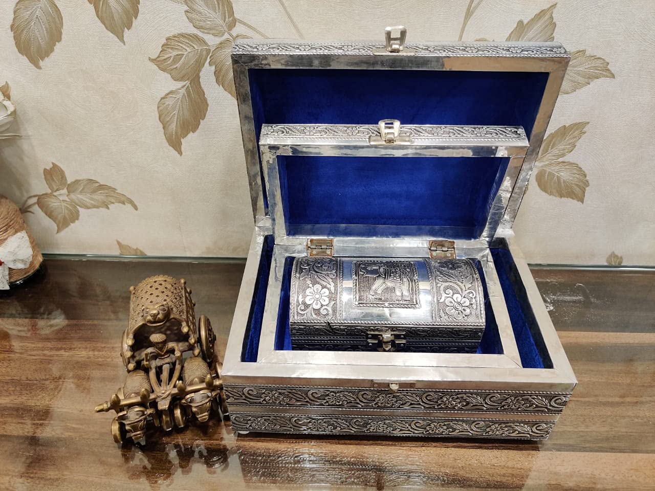 This elegant JEWELLERY CUM DRY FRUIT box made of wooden base and brass cover enhanced with german silver embossing work is a result of meticulous craftsmanship.This unique blend of material craft and art work has lent an appeal that will resonate brilliantly with the festive mood of your near and dear ones on special occasions like diwali. Gift precious articles in our exclusive German silver hand engraved boxes.so your memories are captured in something very exclusive!!
