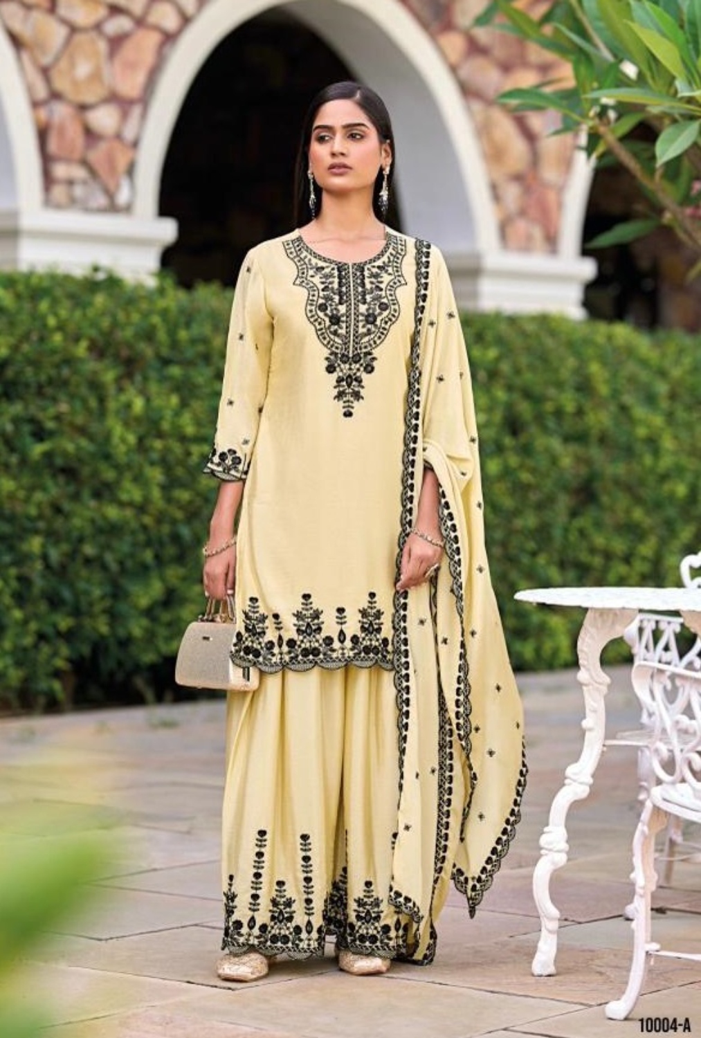 Beige Chinon Readymade Plazzo Suit with Heavy Embroidery Work