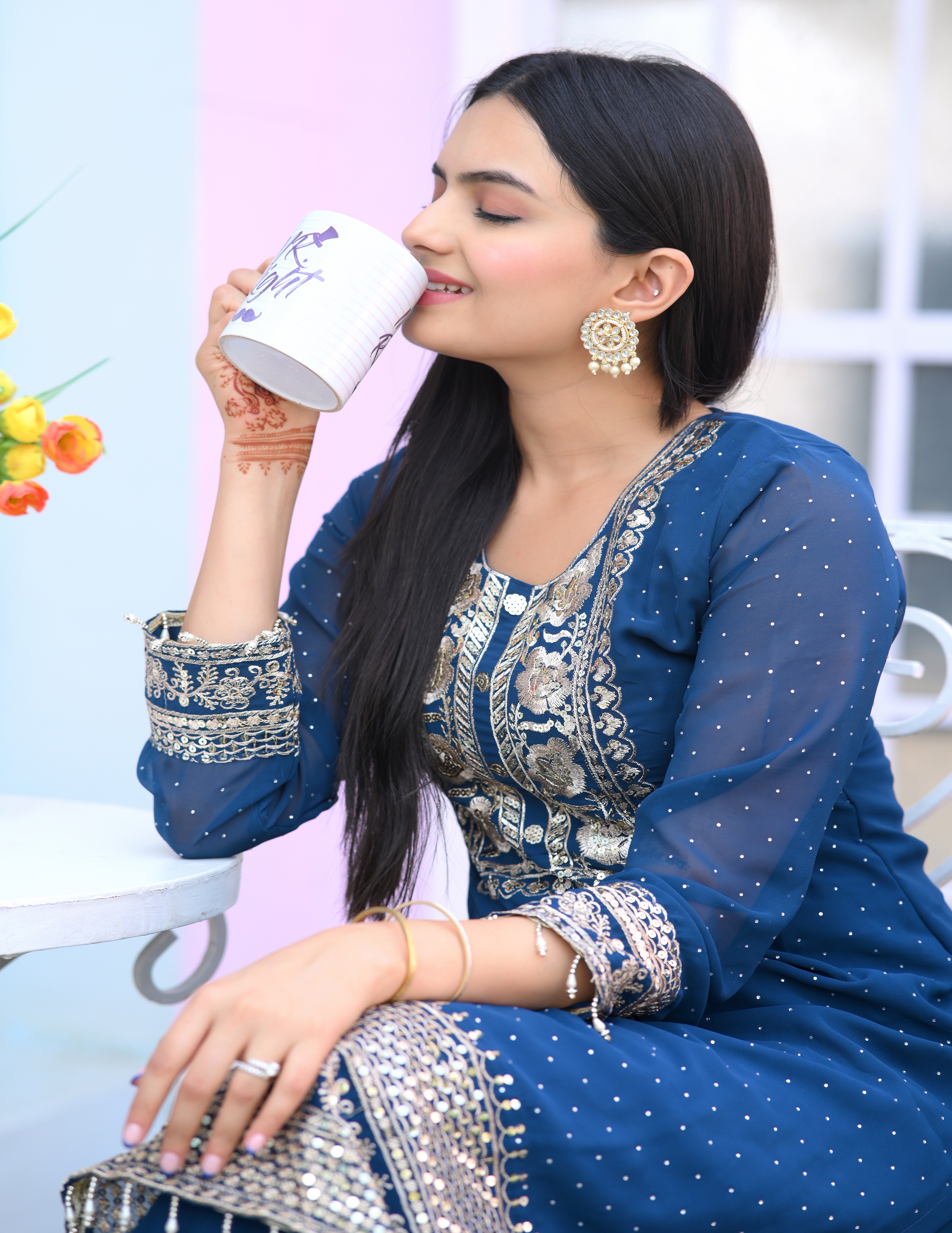 Top, Fabric : Fox Georgette, Inner : Micro, Work : Sequence Embroidery Work And Stone Work, Top length : 46 inch, Stich : S(36), M(38), L(40), XL(42), XXL(44), Pent, Fabric: Fox Georgette, Inner : micro, Stich :- Full Stich With Elastic, Bottom Length: 40 inch, Dupata, Fabric : Fox Georgette, Work. : Sequence Embroidery Work, Length : 2.2 meter.