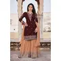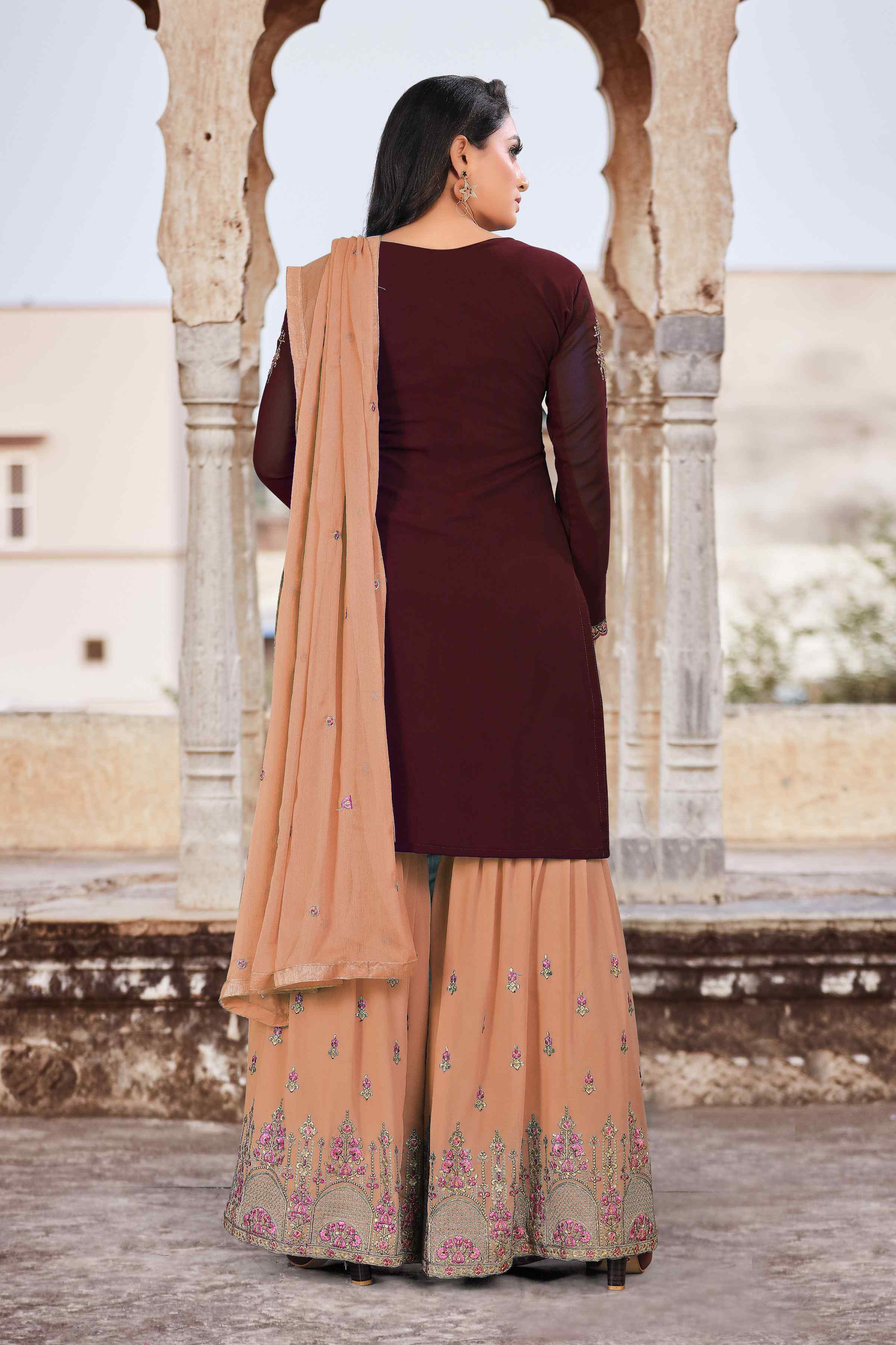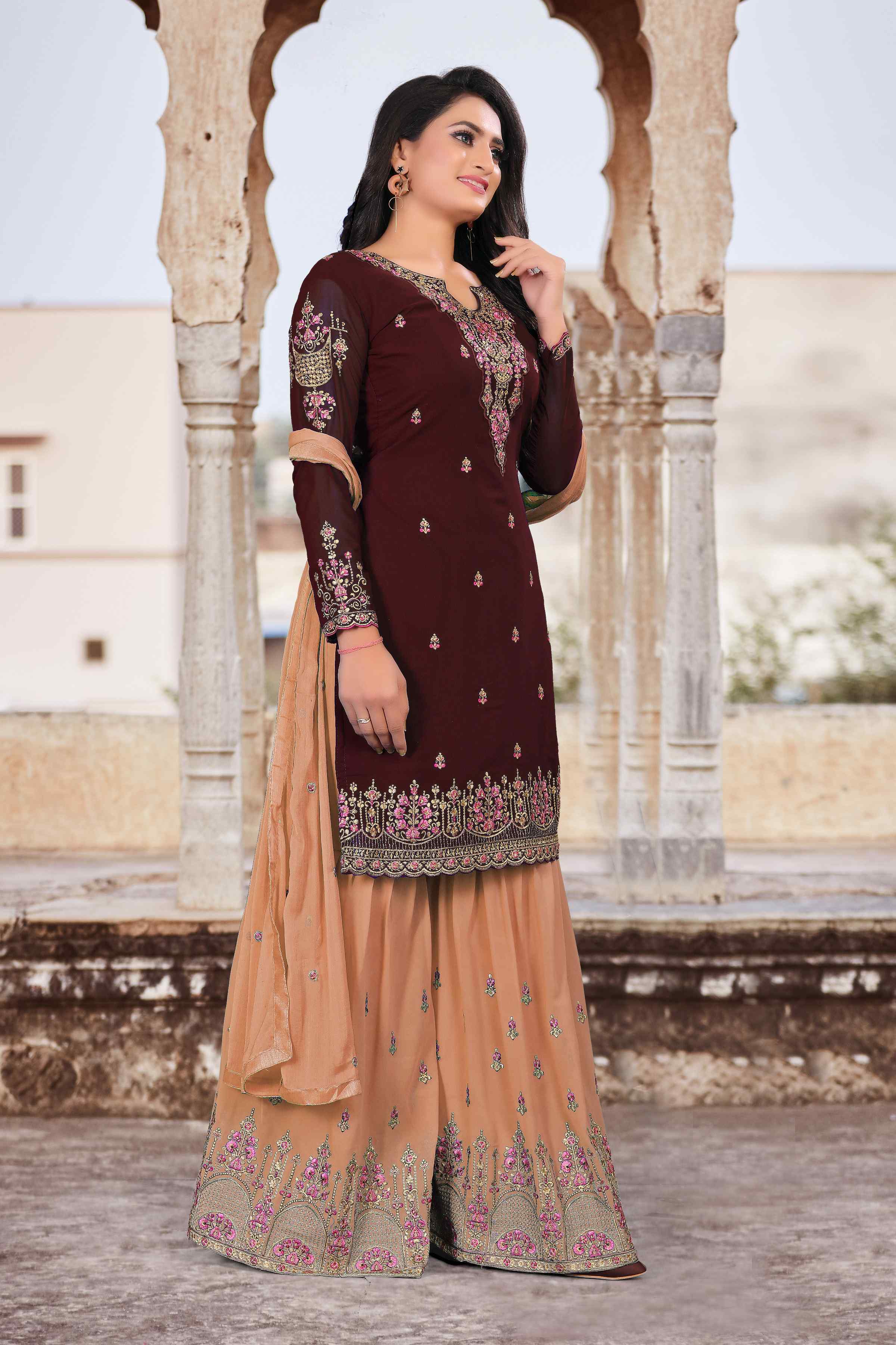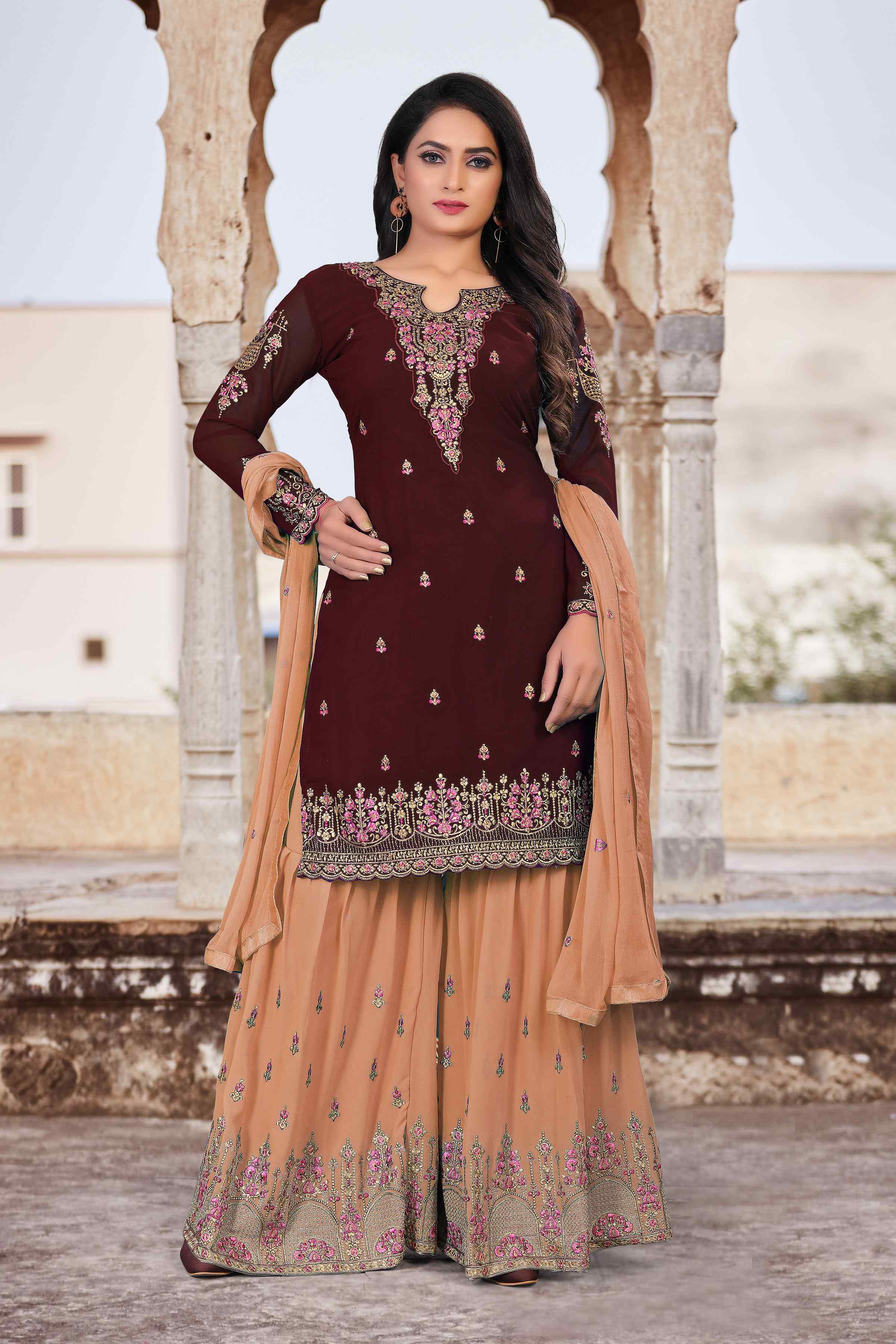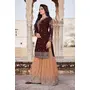HomeFashionKurtas & Kurta SetsDesigner Ethnic Suit Set with Dupatta Faux Georgette Fabric Thread And Zari Embroidered With Diamond Work for Women – Brown Color