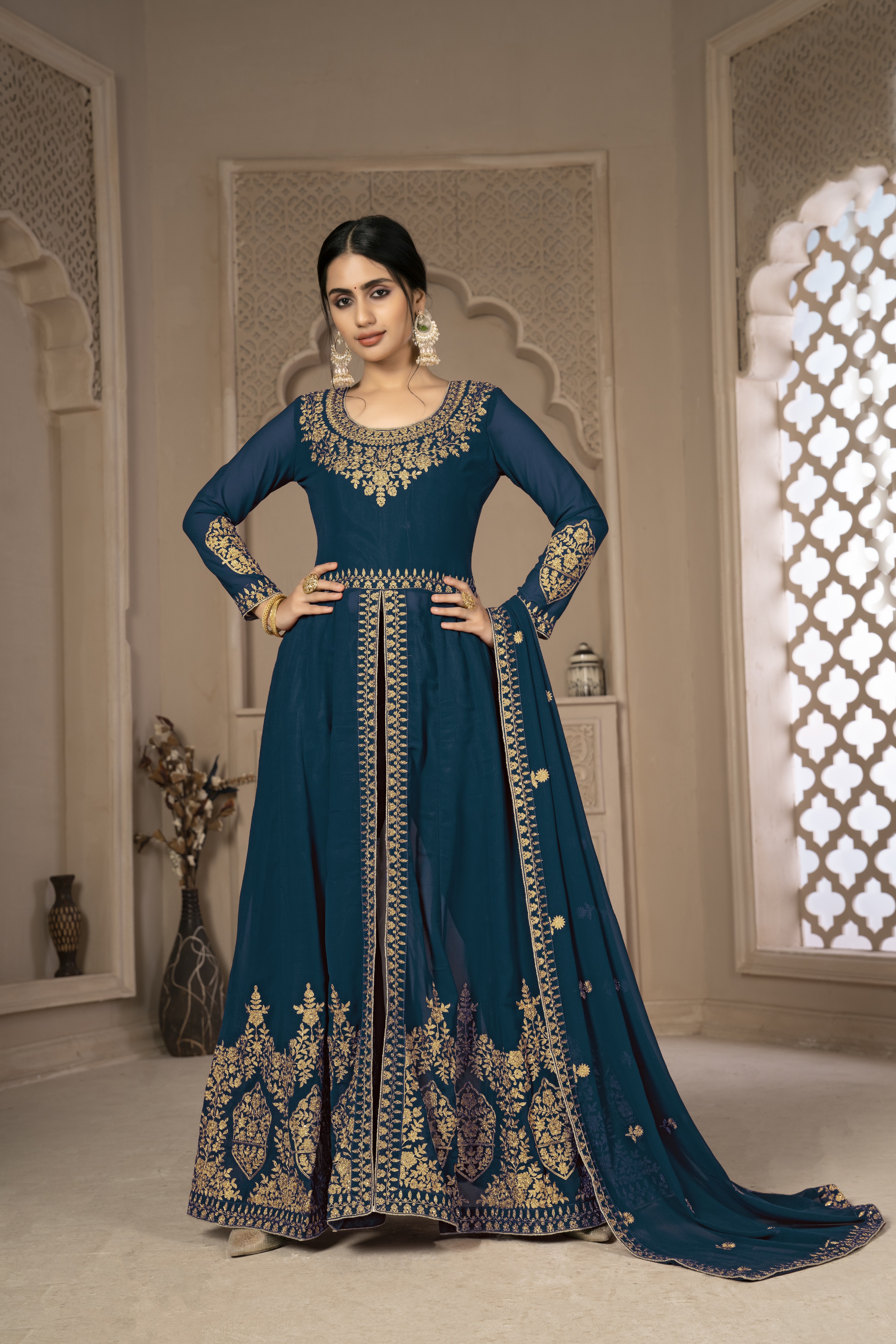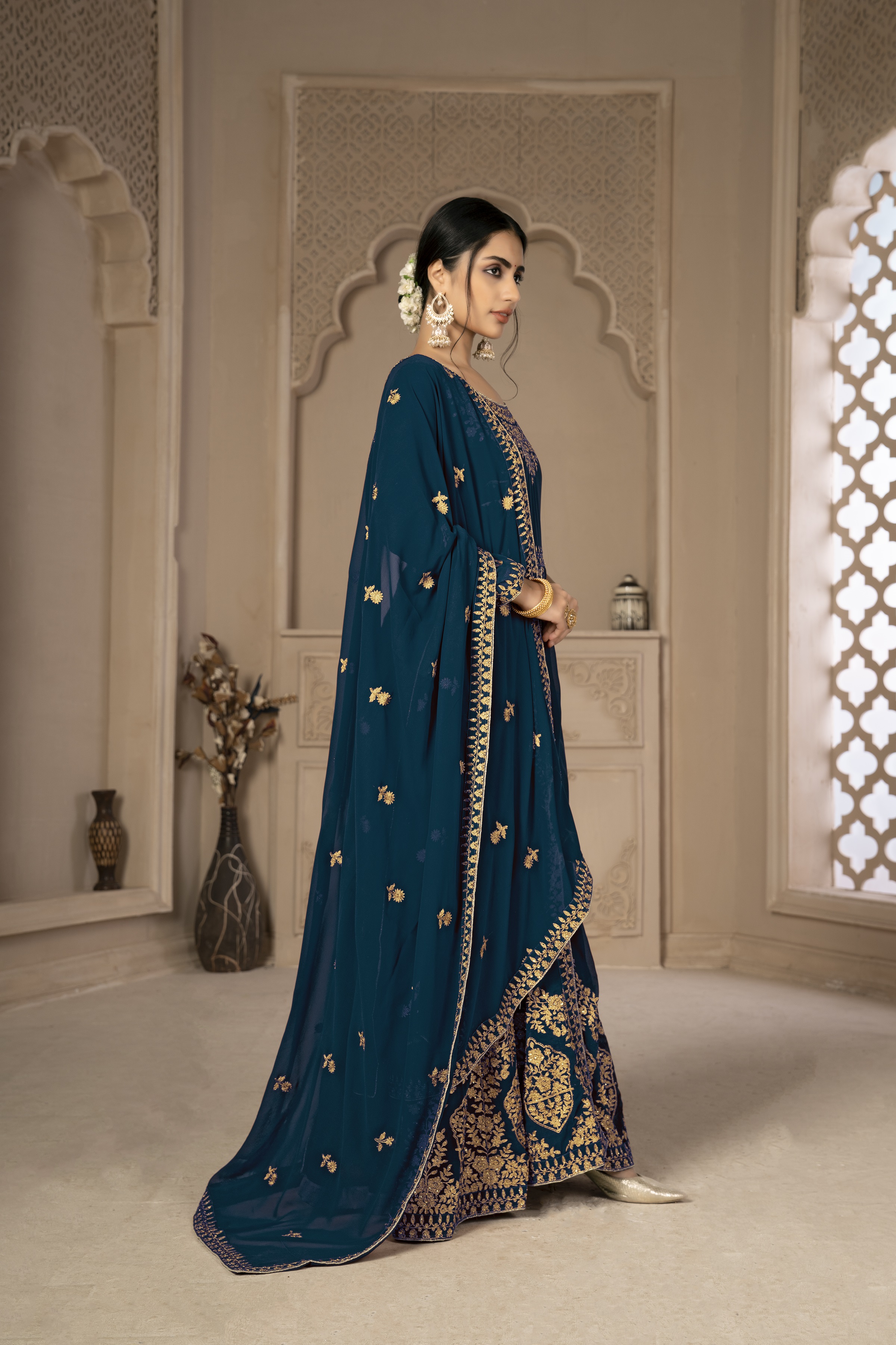 Designer Ethnic Suit Set with Dupatta Faux Georgette Fabric Zari Embroidered With Diamond Work for Women – Rama Color