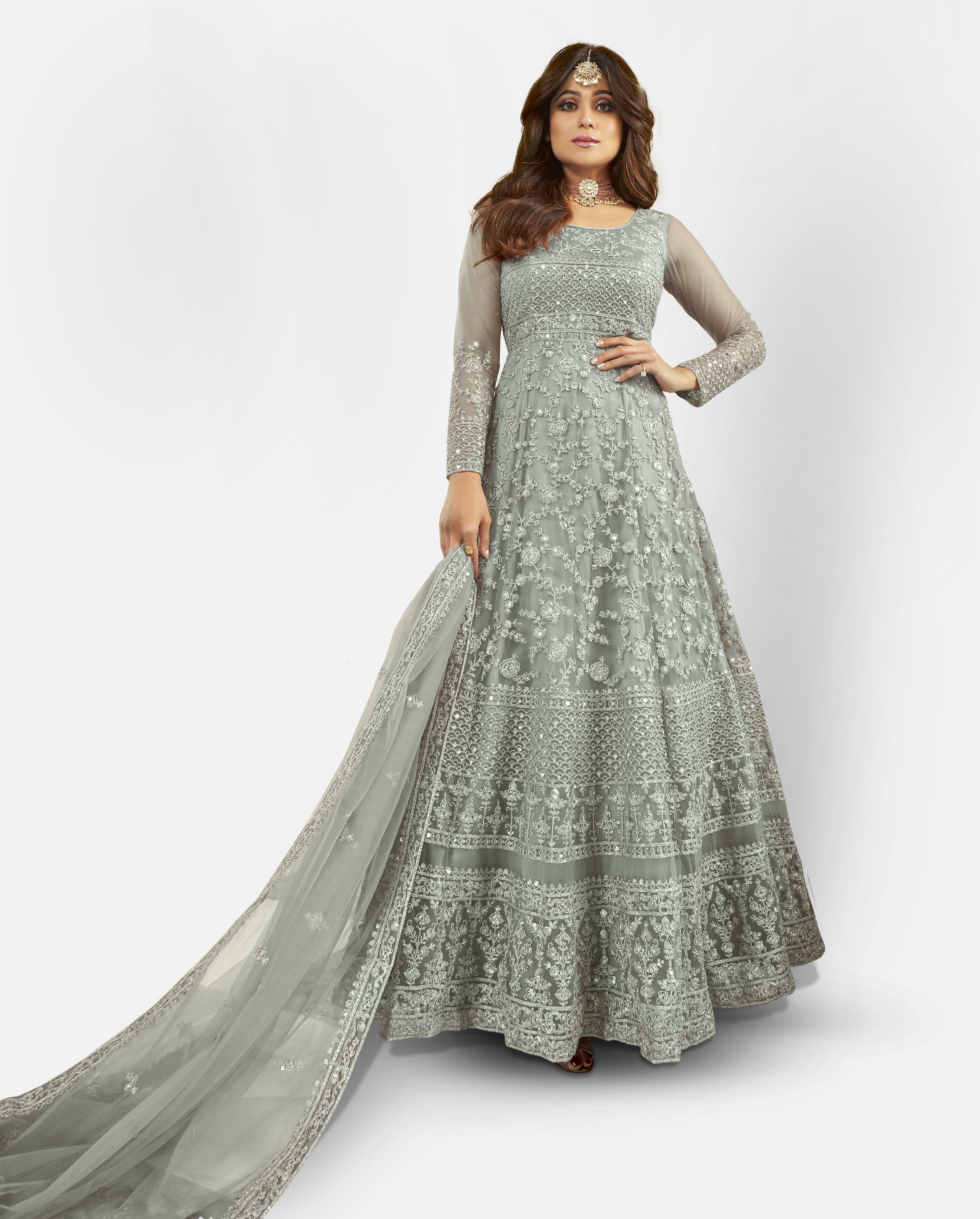 Designer Ethnic Suit Set with Dupatta Net Fabric Dori And Sequins Embroidered Wrok for Women – Grey Color