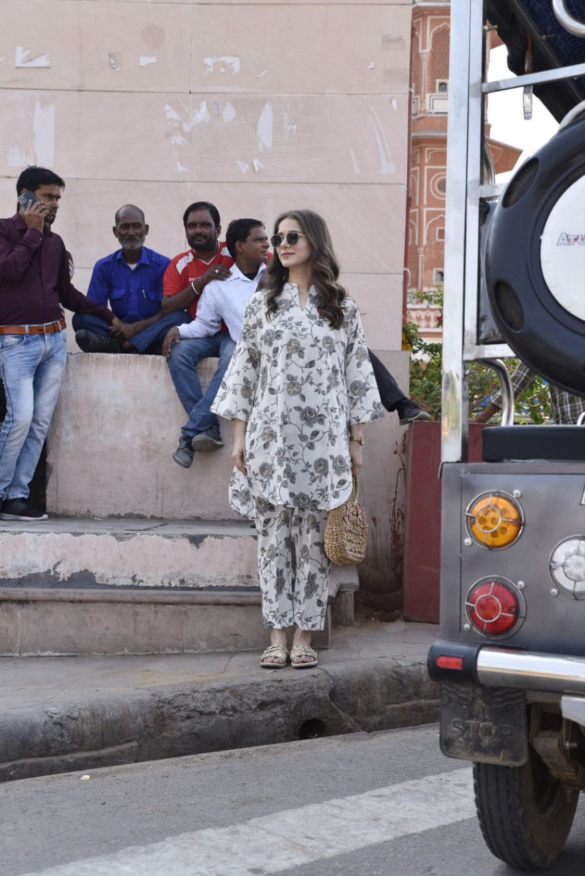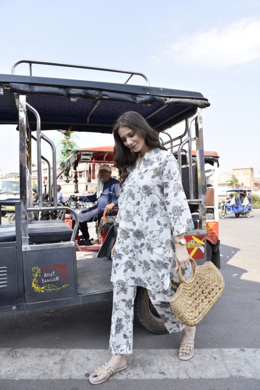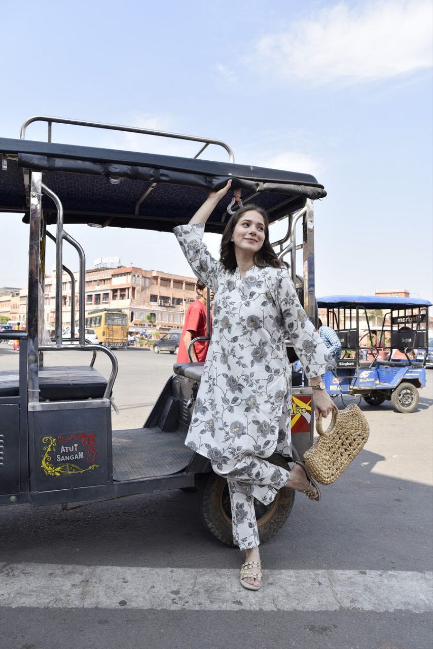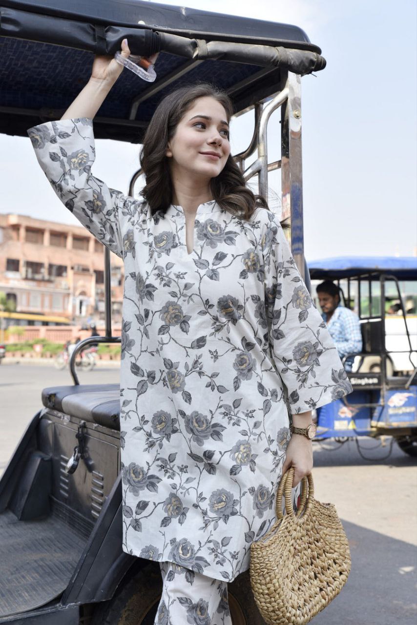 Floral Printed V Neck Kurta Set