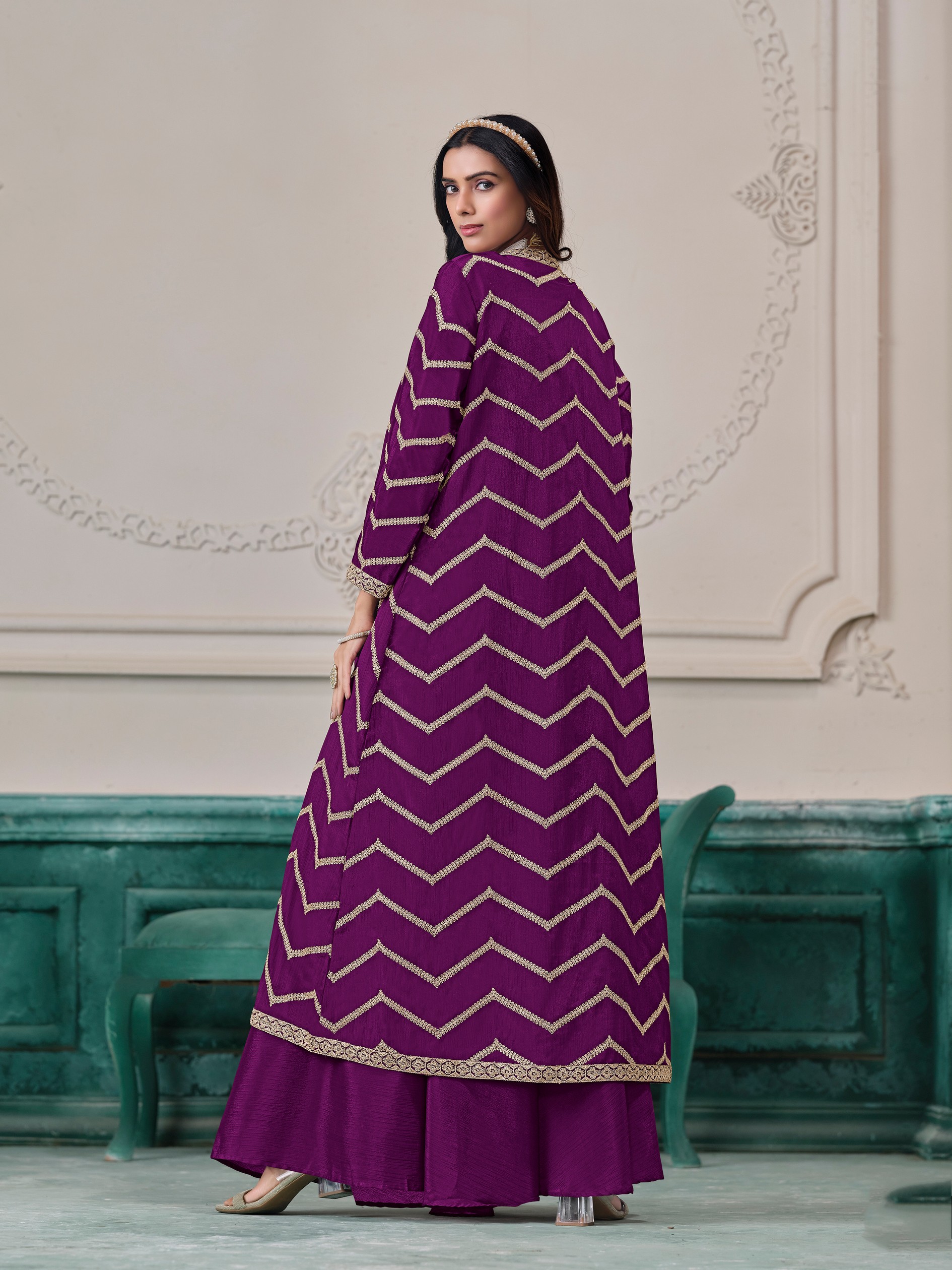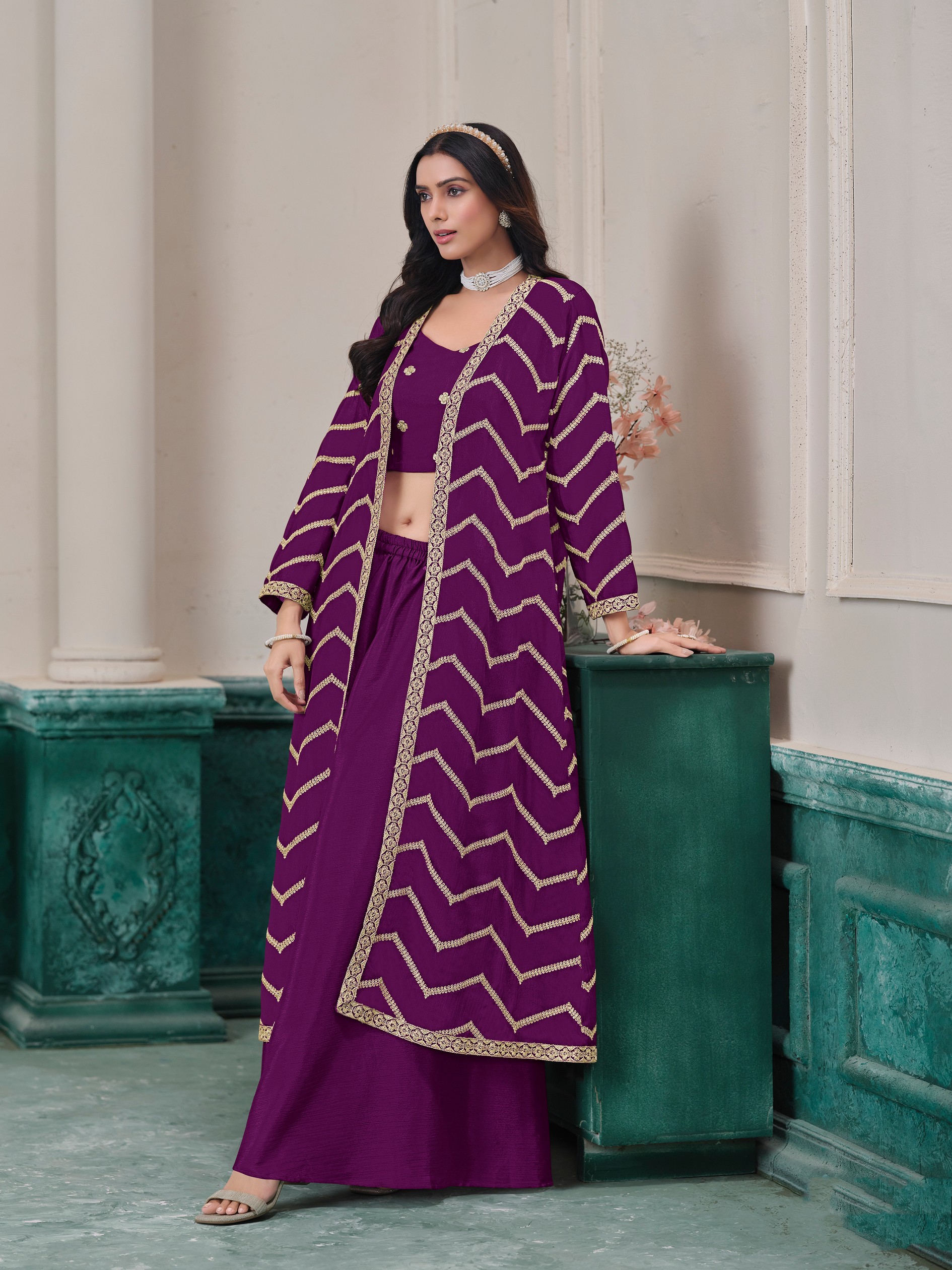 Looking These Beautiful Looking Fine Color Plazzo Shrug Suits.These Top Are Chinon And Shrug Are Chinon And Bottom Chinon Fabricated.Its Beautified With Designer Embroidery Work.