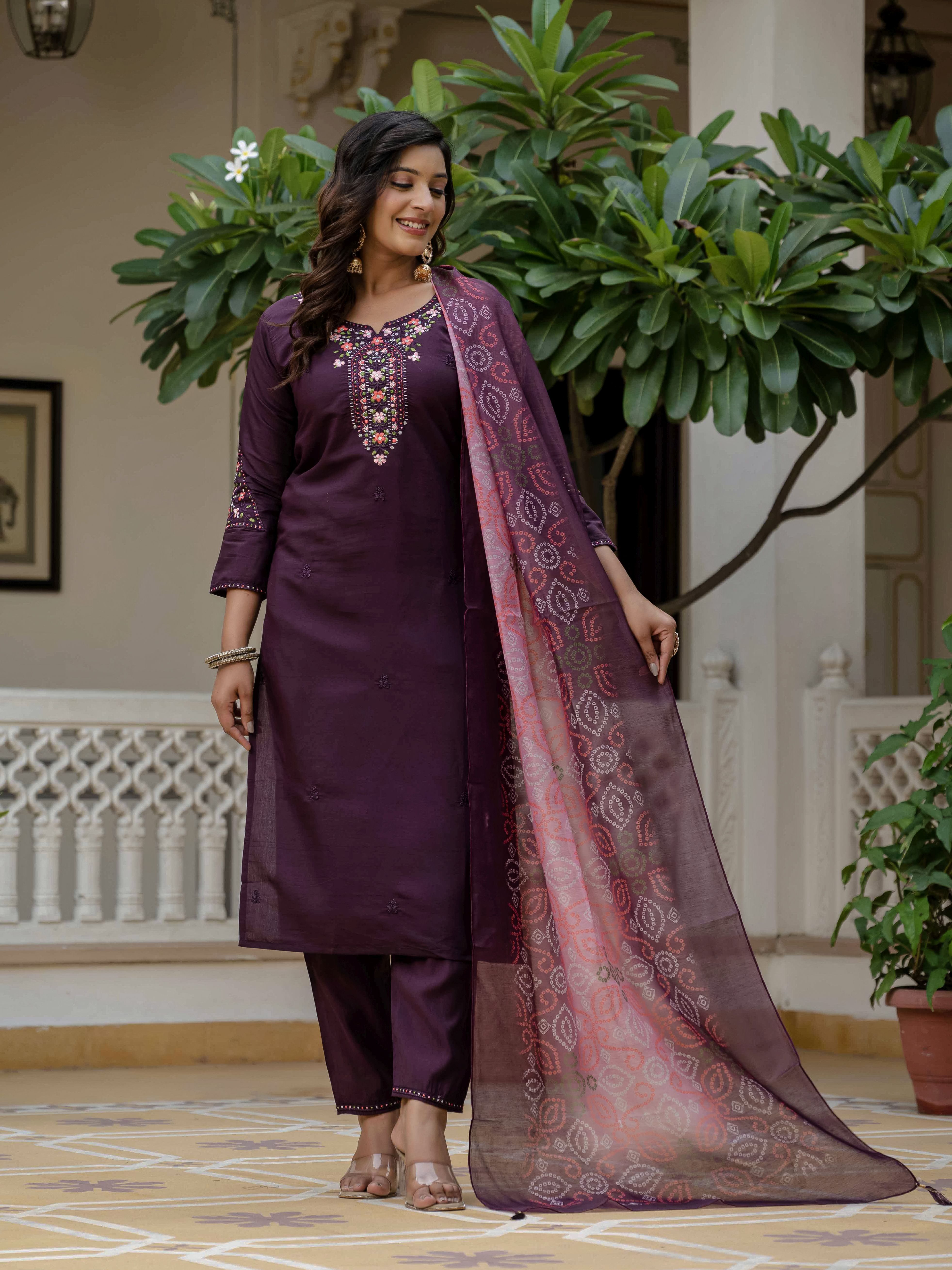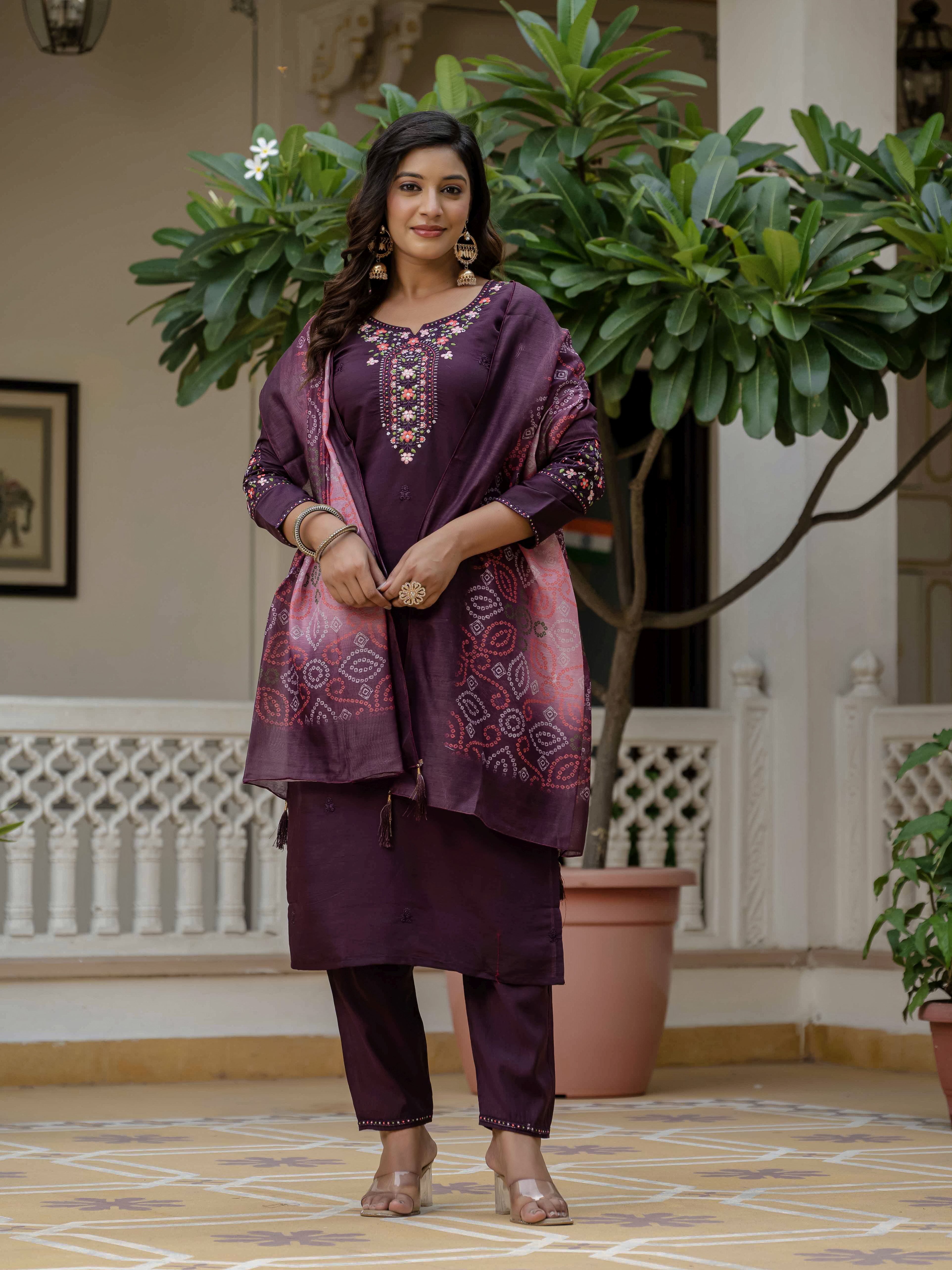 Wine Color Roman Silk Fabric Graceful Festive Special Kurta Set