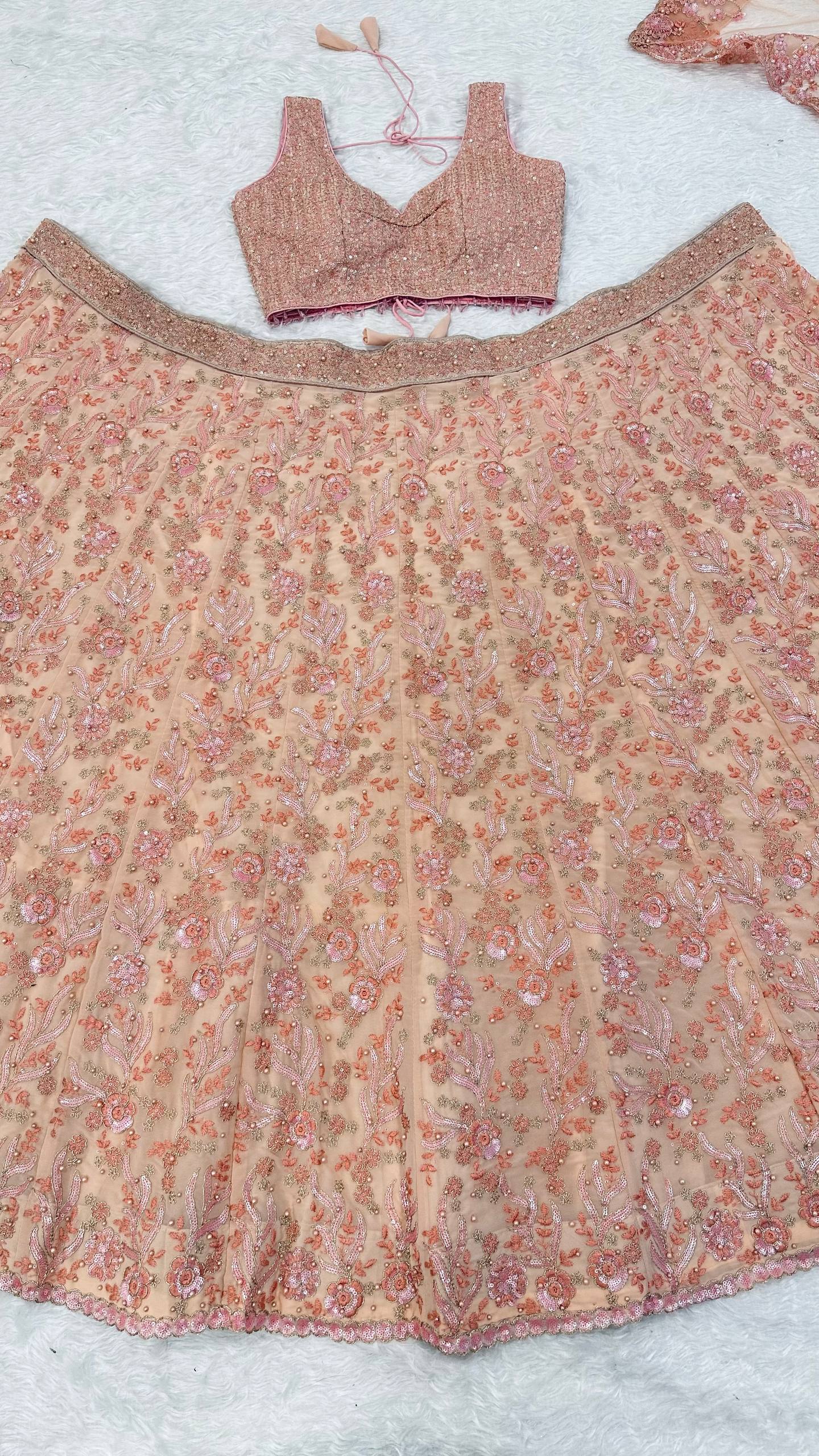 Fabric : Georgette lehenga with thread, dori, sequins pearl beads work Flair 3.25 metercan can attach Georgette blouse with sequins Dori work all over front back ( unstitch )Tassels border given Net duppata with sequins, thread, dori pearl beads work.