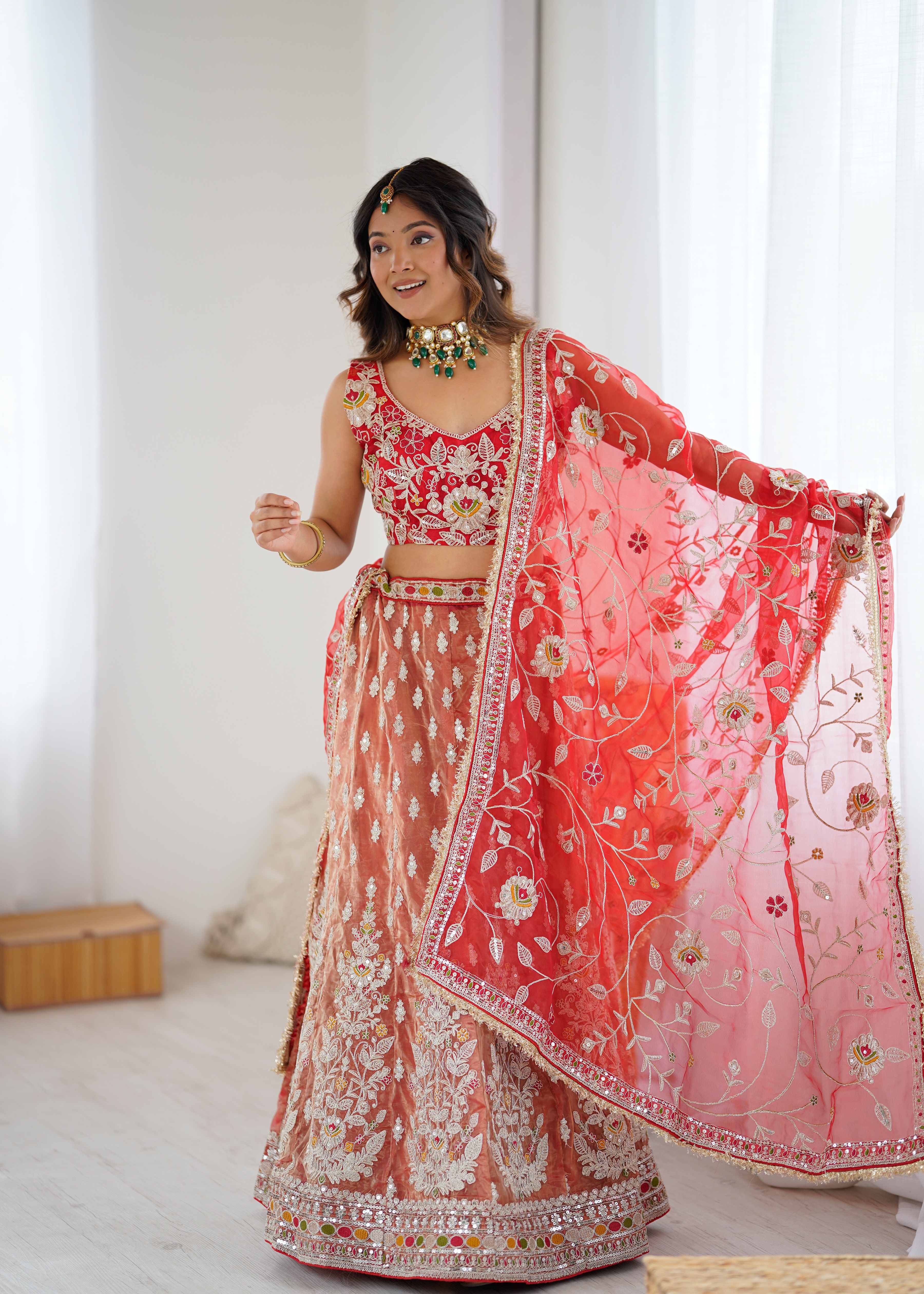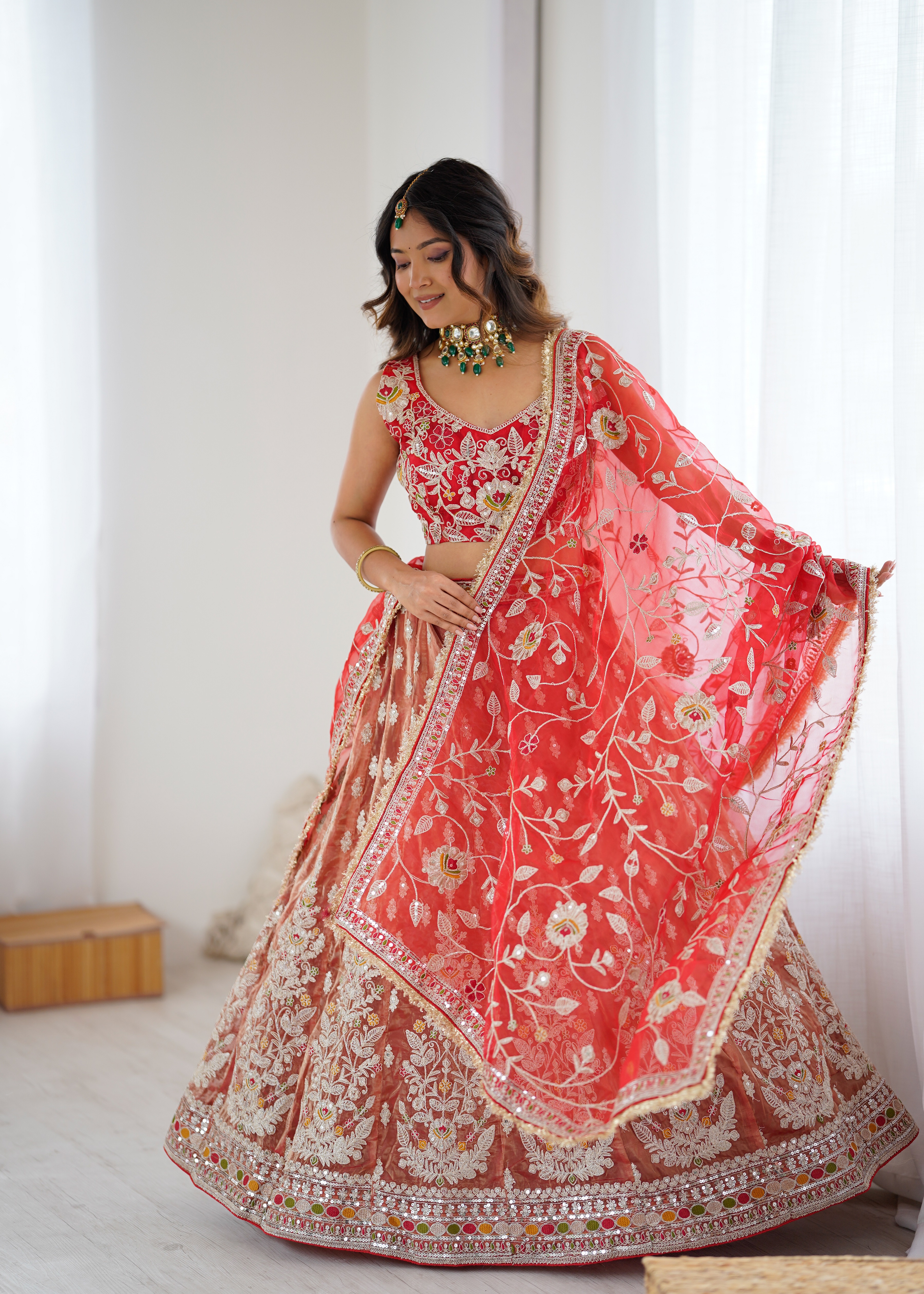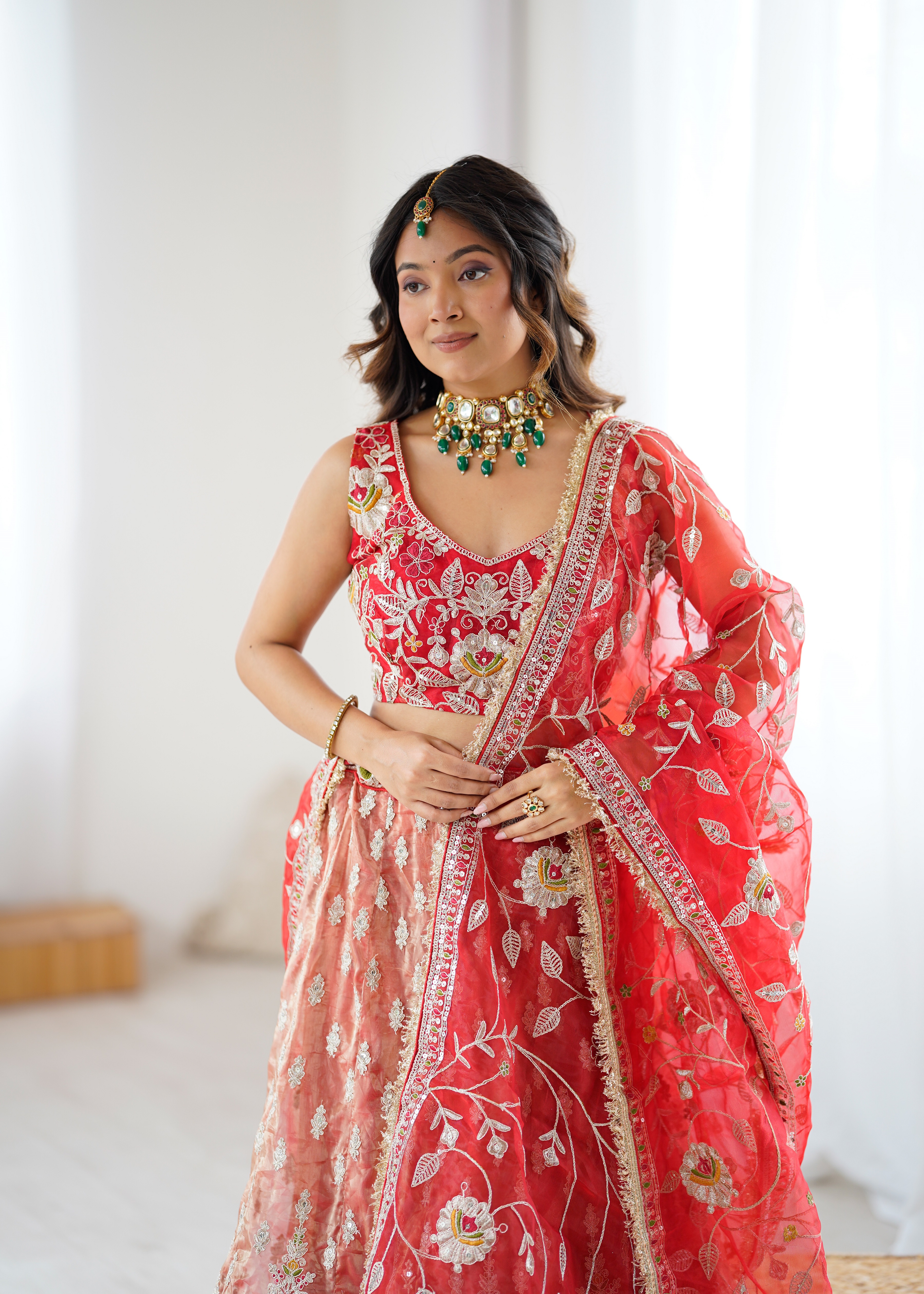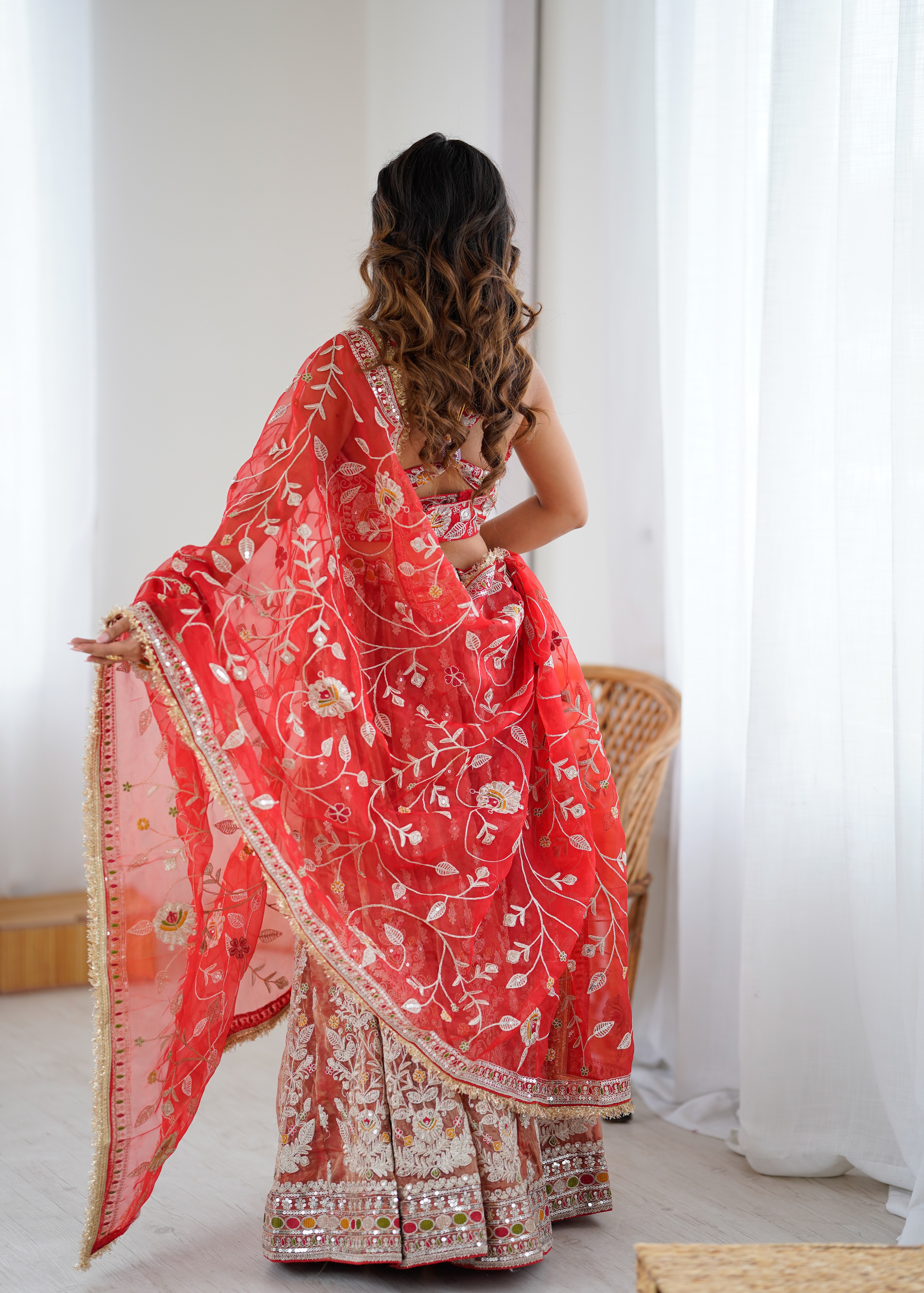 • Lehenga features a well-structured flare that creates a stunning silhouette while ensuring comfort.