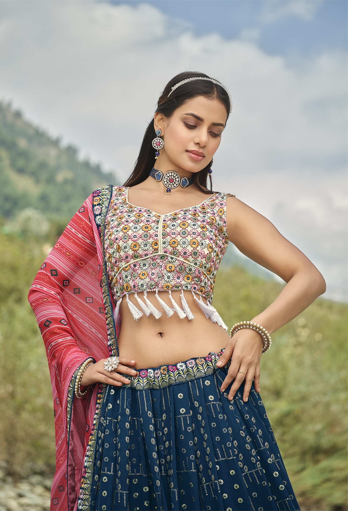 Elevate your ethnic look with this blue faux georgette lehenga featuring thread embroidery work. Designed for festive occasions and celebrations, it offers a graceful flow and timeless appeal.Crafted from lightweight faux georgette fabric with a semi-stitched finish, this lehenga ensures comfort and easy customization. Dry clean recommended.