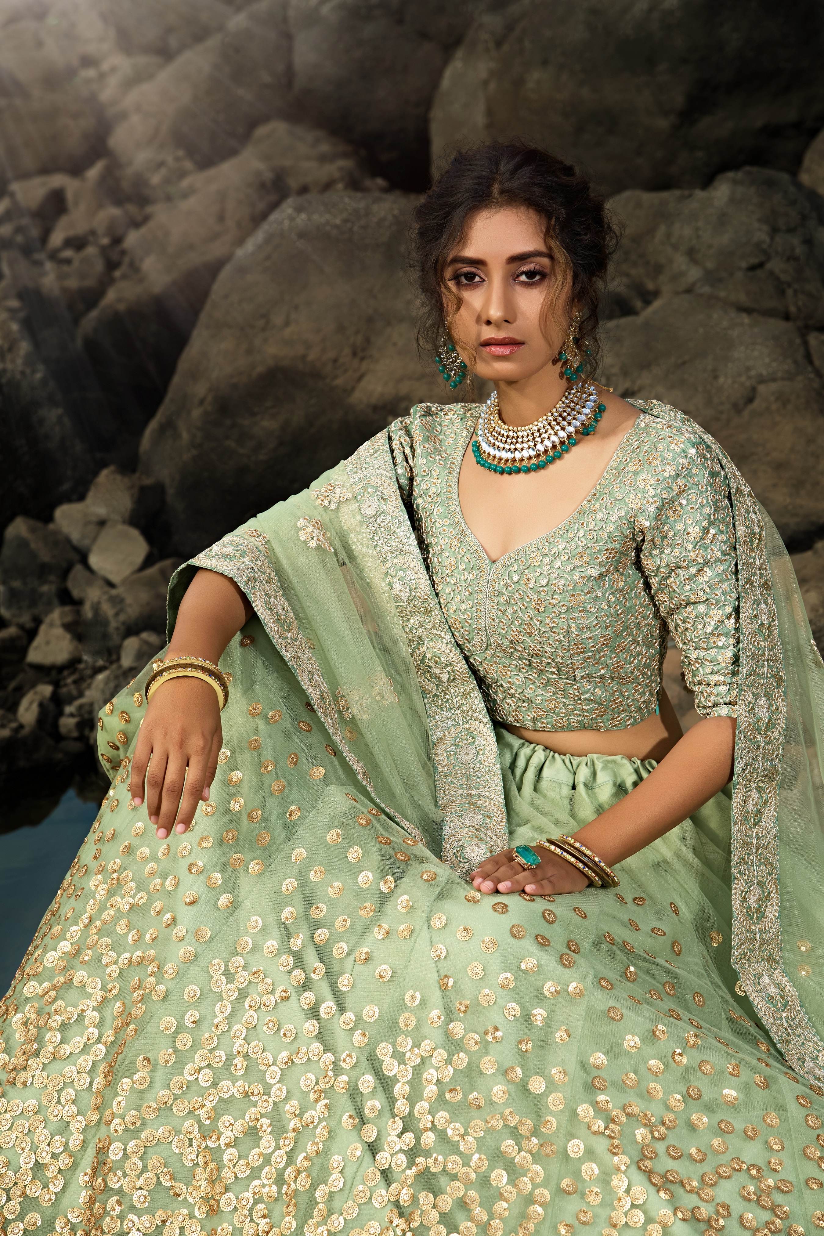 Elevate your ethnic look with this green net lehenga featuring sequience work work. Designed for festive occasions and celebrations, it offers a graceful flow and timeless appeal.Crafted from lightweight net fabric with a semi-stitched finish, this lehenga ensures comfort and easy customization. Dry clean recommended.