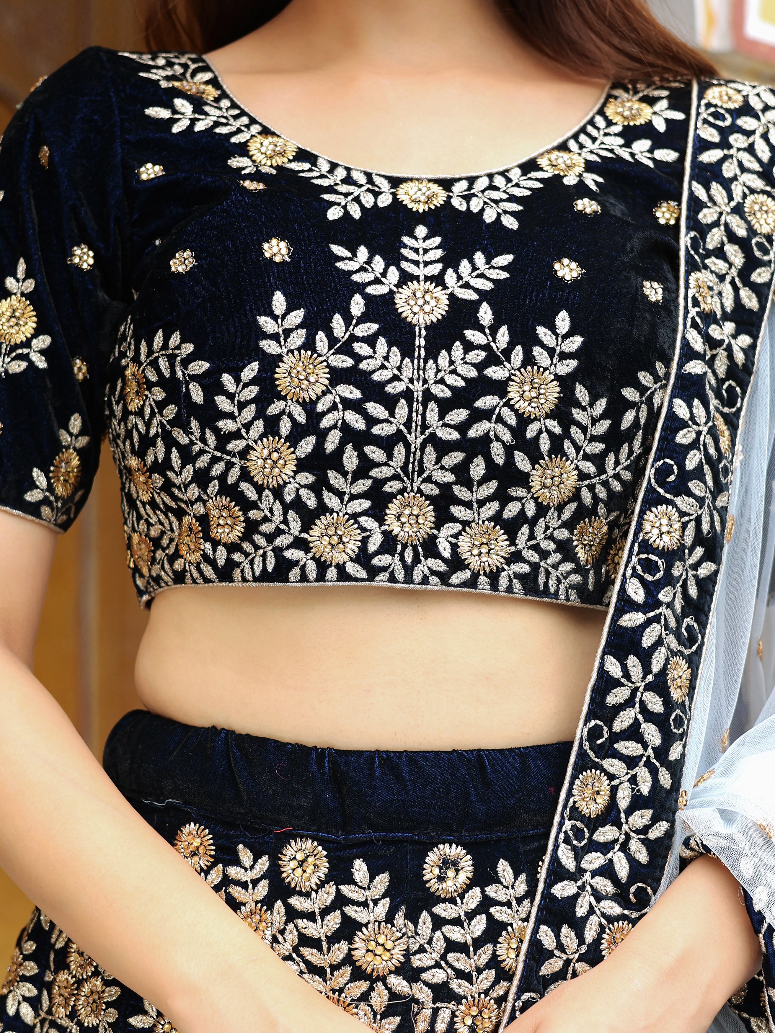 Elevate your ethnic look with this navy blue velvet lehenga featuring zari work work. Designed for festive occasions and celebrations, it offers a graceful flow and timeless appeal.Crafted from lightweight velvet fabric with a semi-stitched finish, this lehenga ensures comfort and easy customization. Dry clean recommended.