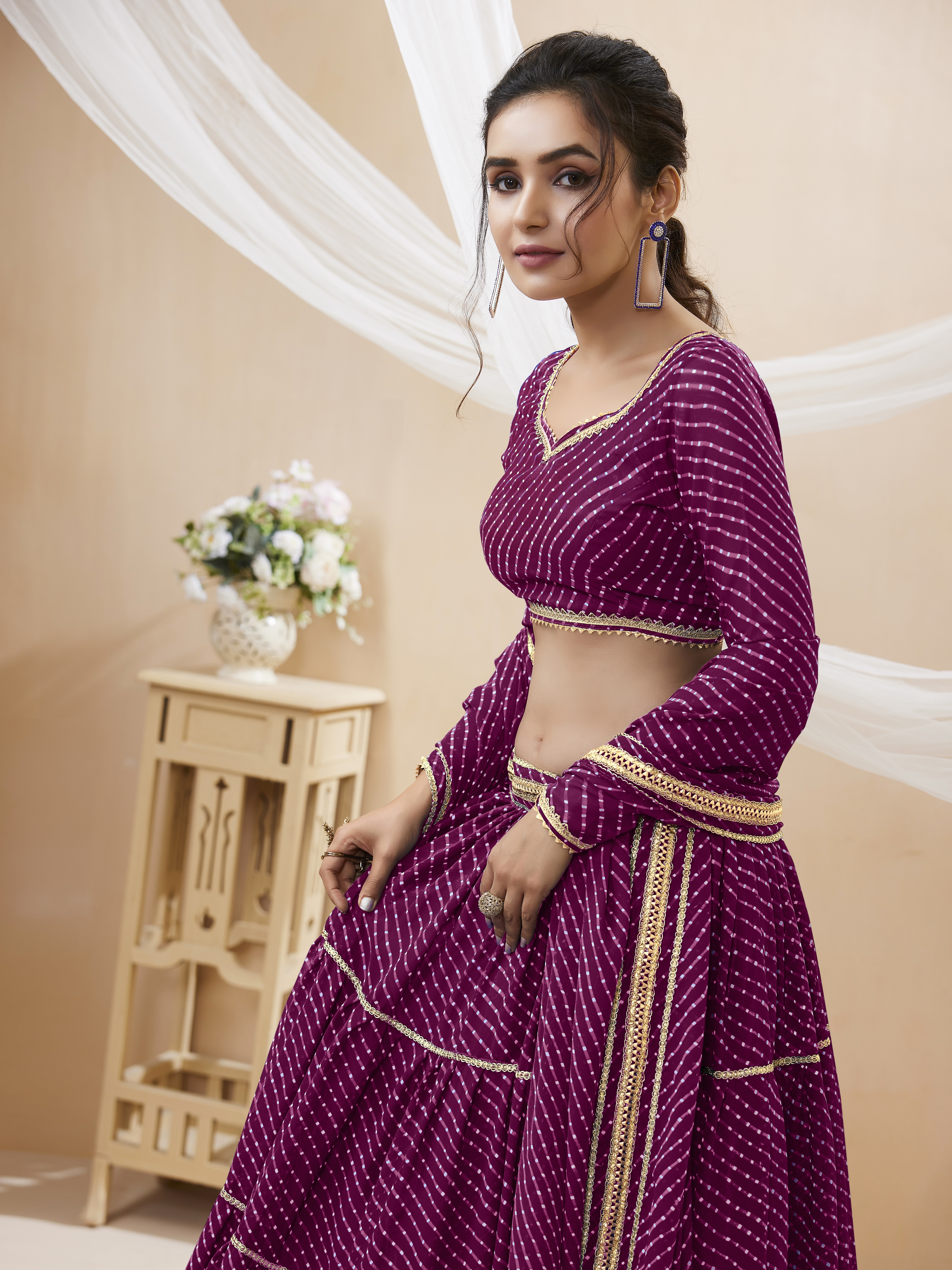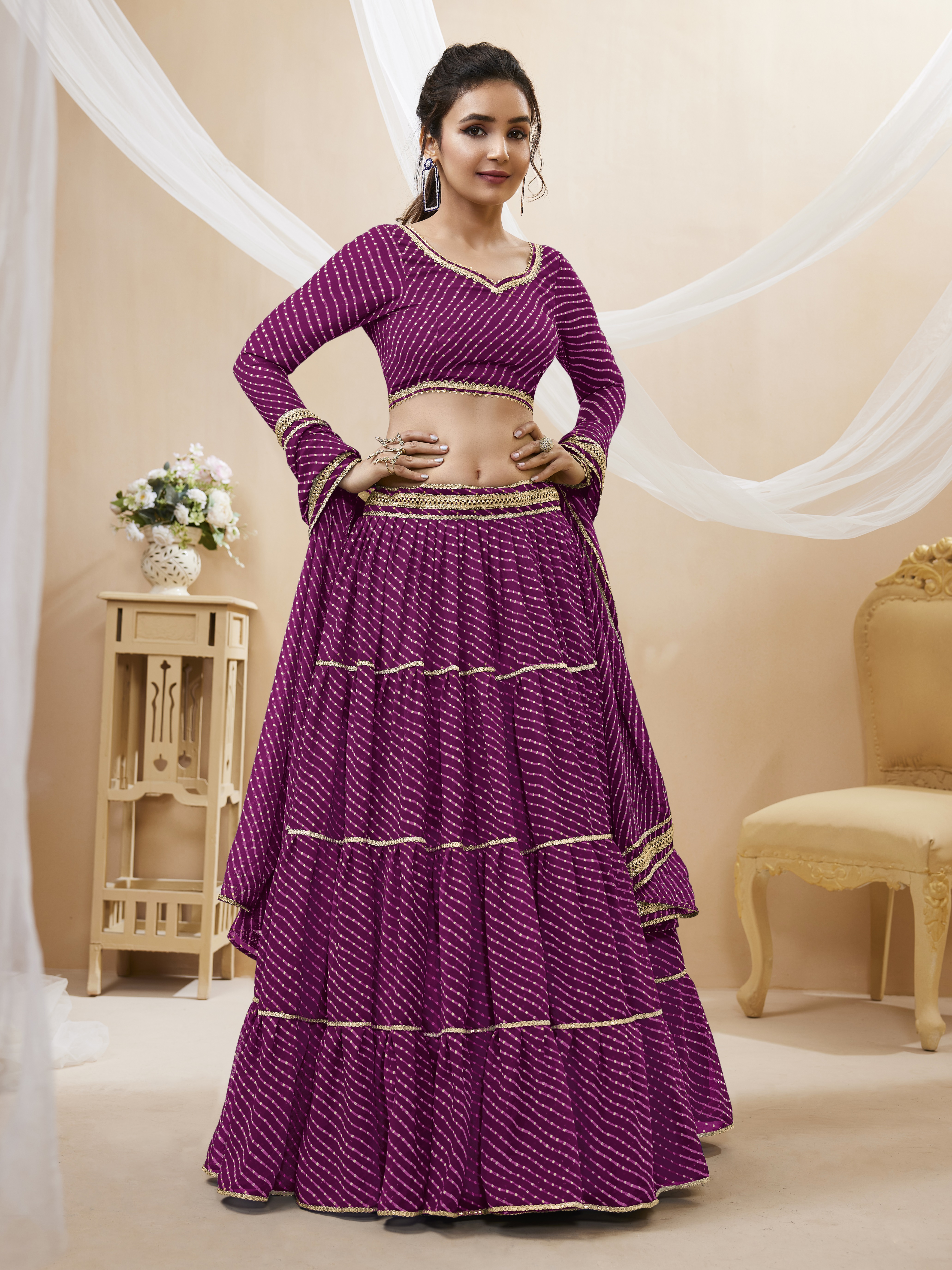Womens Purple Georgette Lehariya Lehenga Set