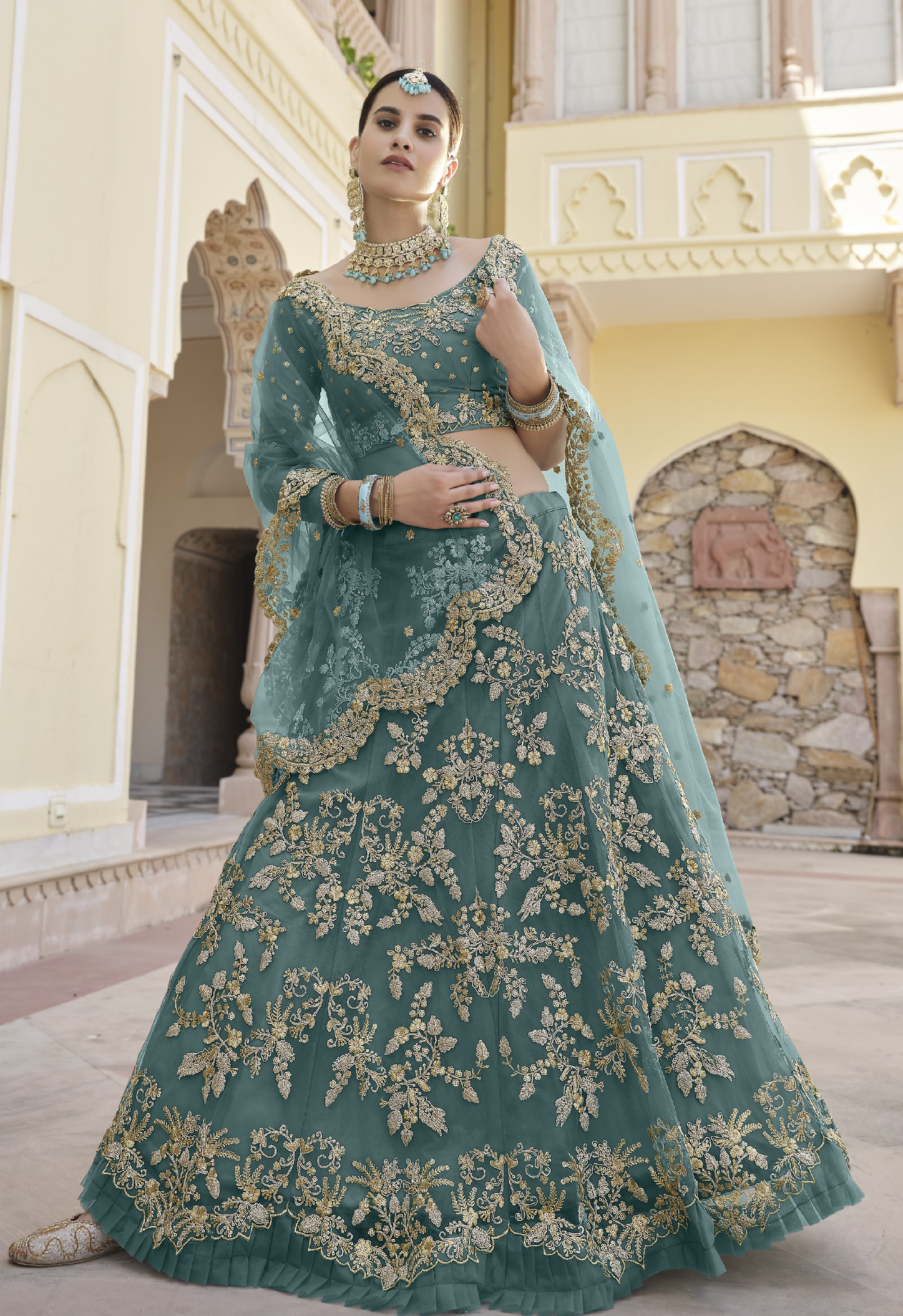 Womens Turquoise Net Zari Work Lehenga Set