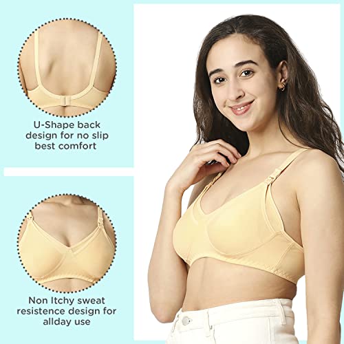 A feeding bra also known as a nursing bra is specially designed to provide comfort support and convenience for breastfeeding mothers. Unlike regular bras it features easy-access panels or cups that can be unclipped or pulled down to allow for quick and discreet breastfeeding or pumping. These bras are essential for new mothers as they make the process of breastfeeding smoother and more comfortable both at home and on the go. Made of 100% cotton with extra-soft elastic for ease of wear Front clasp with drop clip to breastfeed quickly. Non-wired for utmost comfort Equipped with thicker straps broader sides and a deeper center front for complete support Non-wired for utmost comfort Ergonomically designed fabric to aid in breastfeeding. Machine washable. Available in ALL sizes - 34 36 38 297 and cup sizes - B C D and neutral colors to suit your preferences.