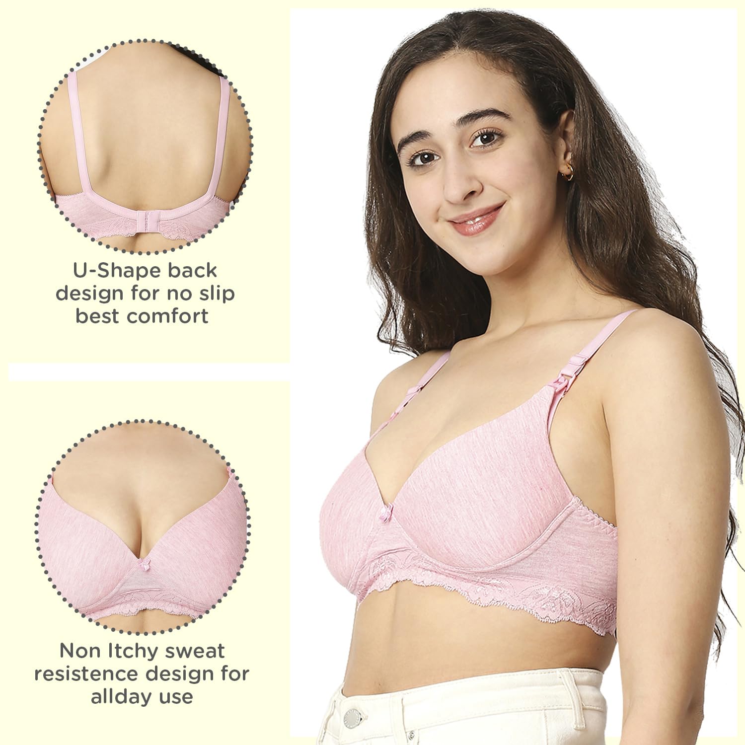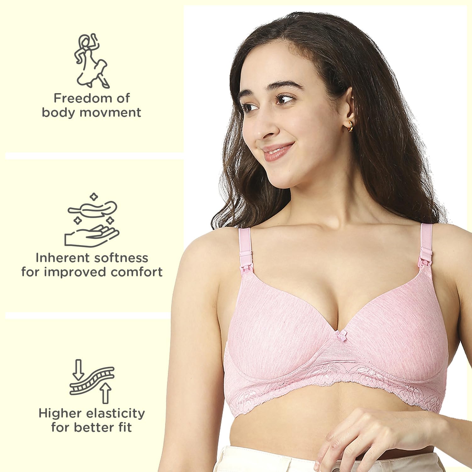A feeding bra also known as a nursing bra is specially designed to provide comfort support and convenience for breastfeeding mothers. Unlike regular bras it features easy-access panels or cups that can be unclipped or pulled down to allow for quick and discreet breastfeeding or pumping. These bras are essential for new mothers as they make the process of breastfeeding smoother and more comfortable both at home and on the go. Made of 100% cotton with extra-soft elastic for ease of wear Front clasp with drop clip to breastfeed quickly. Non-wired for utmost comfort Equipped with thicker straps broader sides and a deeper center front for complete support Non-wired for utmost comfort Ergonomically designed fabric to aid in breastfeeding. Machine washable. Available in ALL sizes - 34 36 38 407 and cup sizes - B C D and neutral colors to suit your preferences.