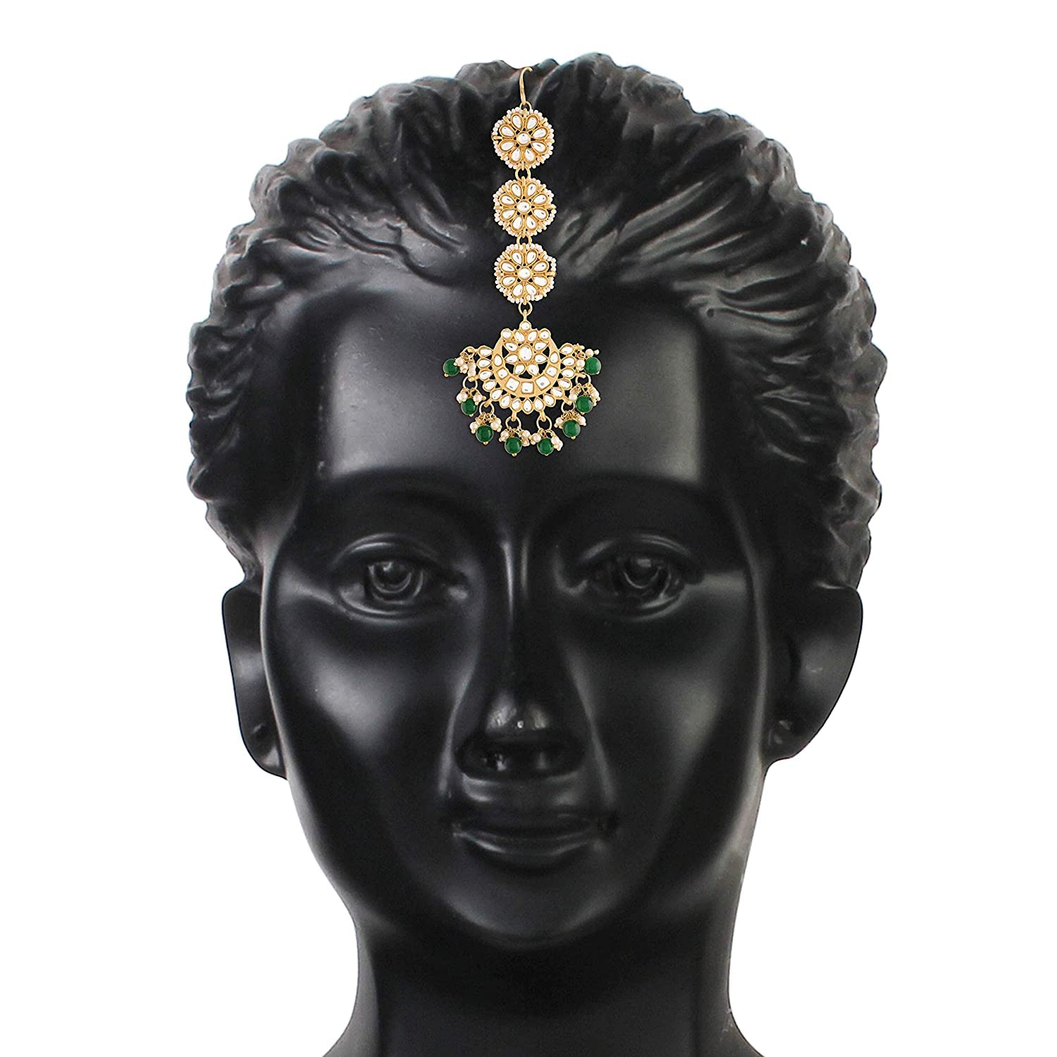 This maang tikka/passa is crafted in 18k gold-plating and features kundan studded in it and secured with a hook closure. Style this as maang tikka or passa with your ethnic attires to complete the look. Perfect Accesory for your jewelry box!