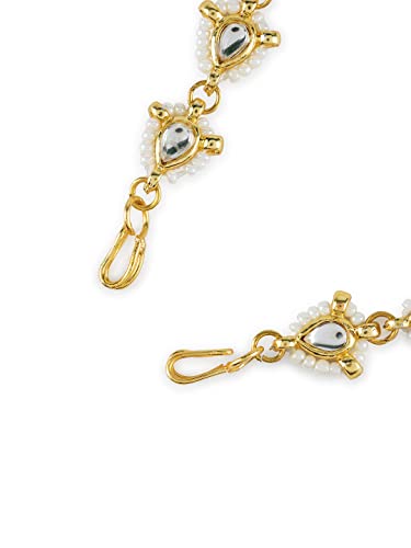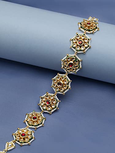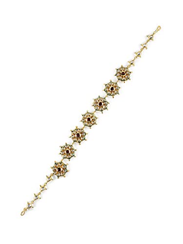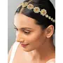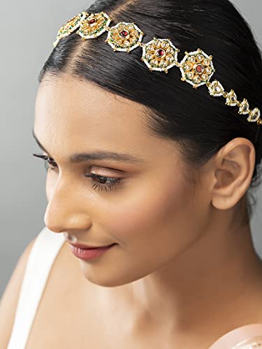 This mathapatti for women is made of brass and is gold-. This mathapatti has a and flowers design and is adorned by kundan work. This mathapatti will look great with festive and bridal wear.