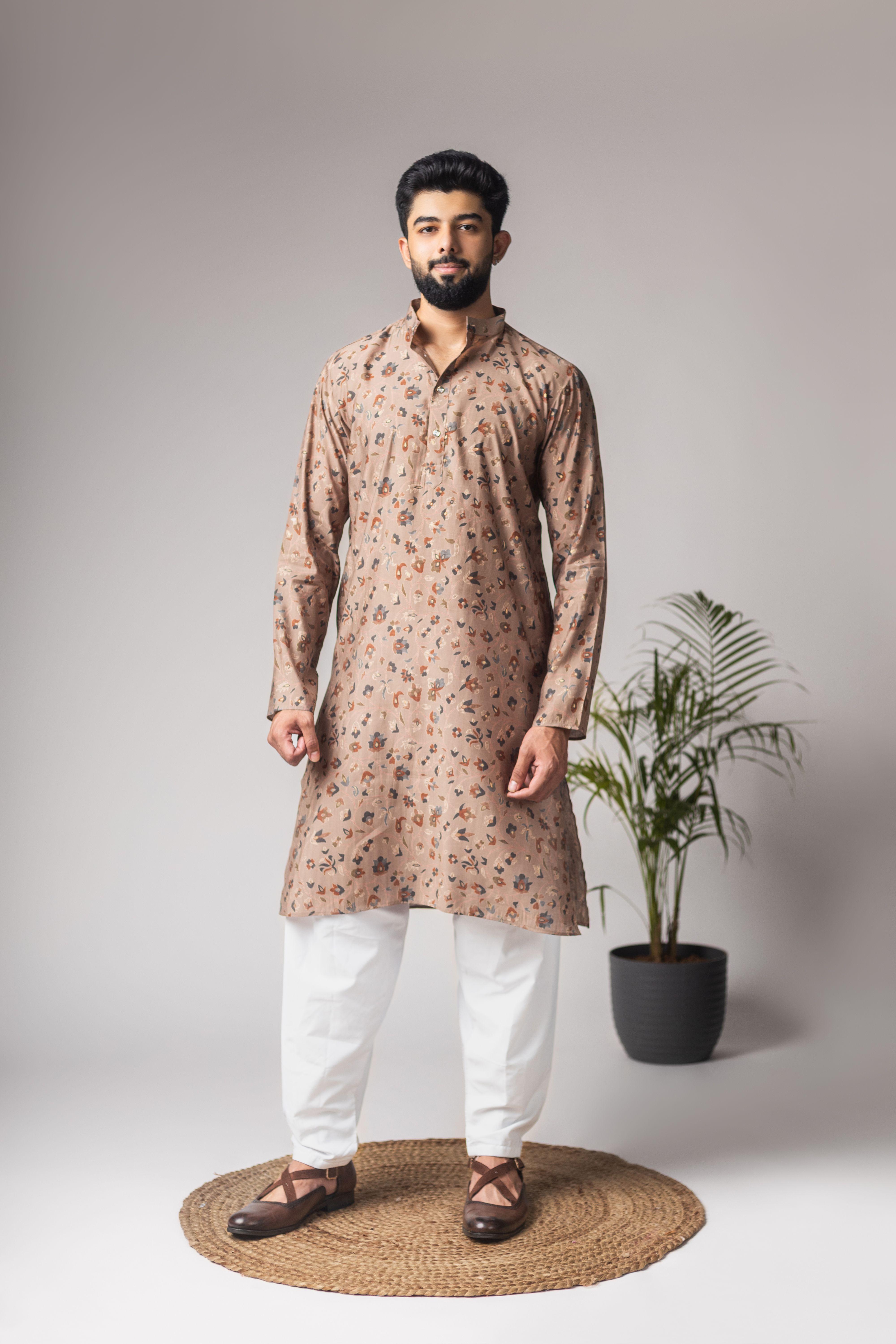 Brown Color Modal Silk Fabric Designer Printed Festive Wear Men's Kurta Payjama