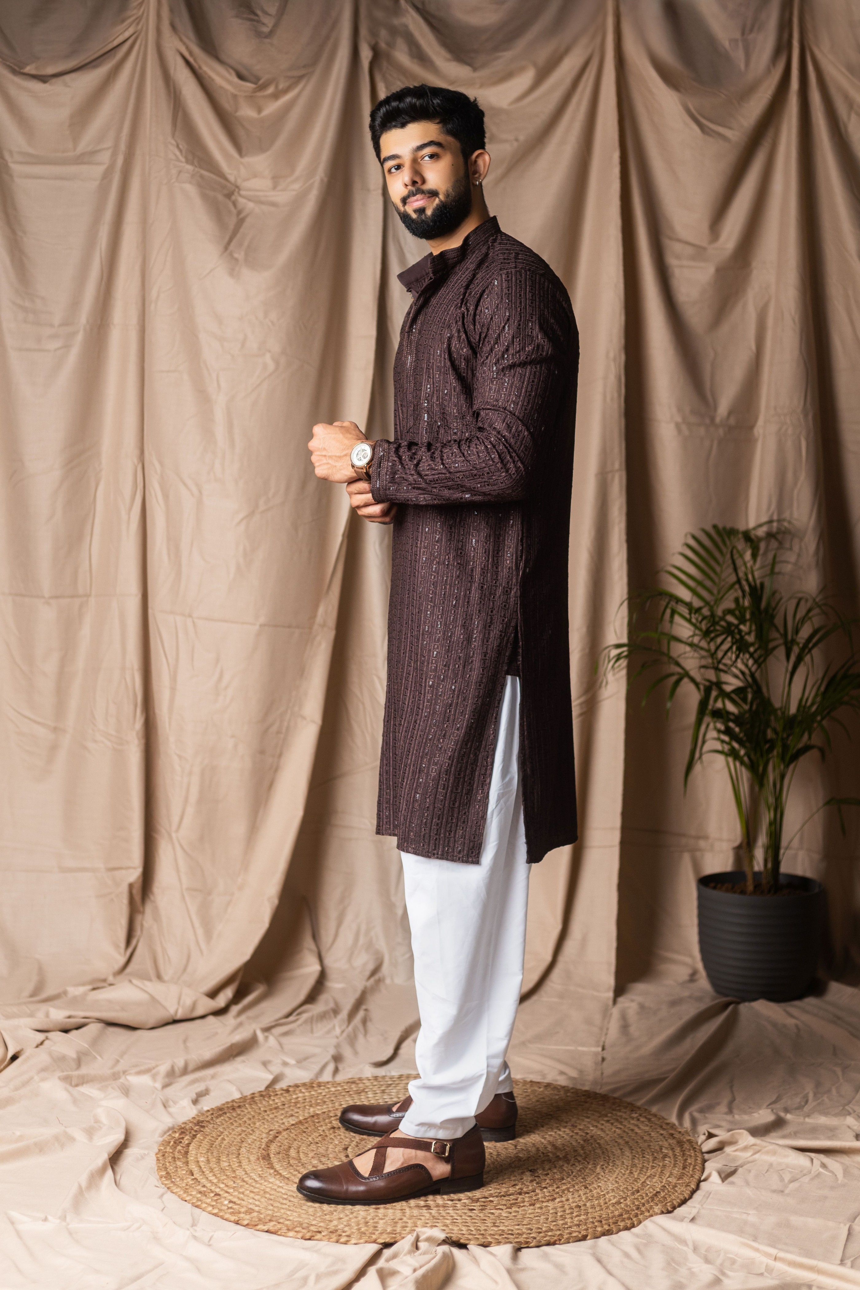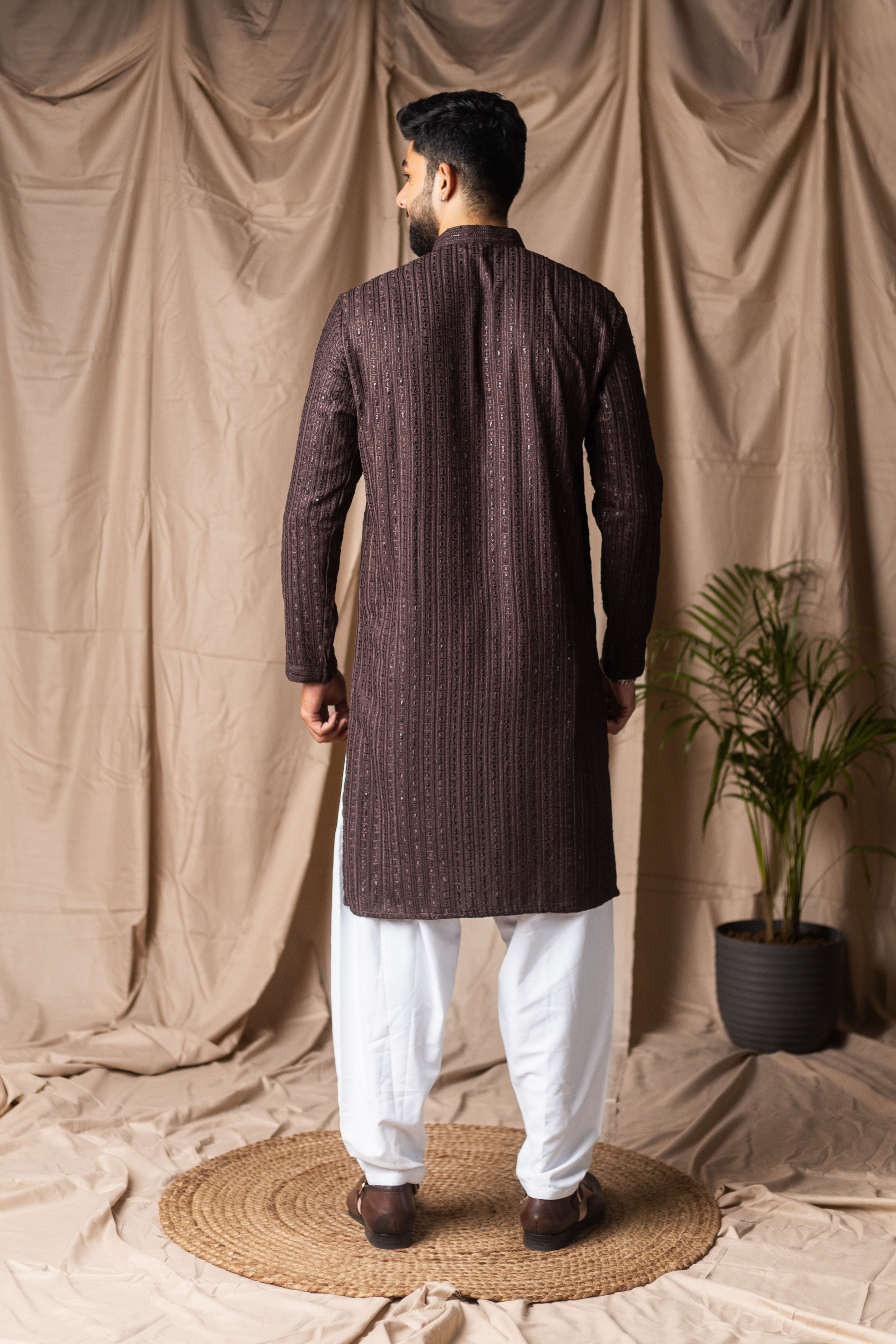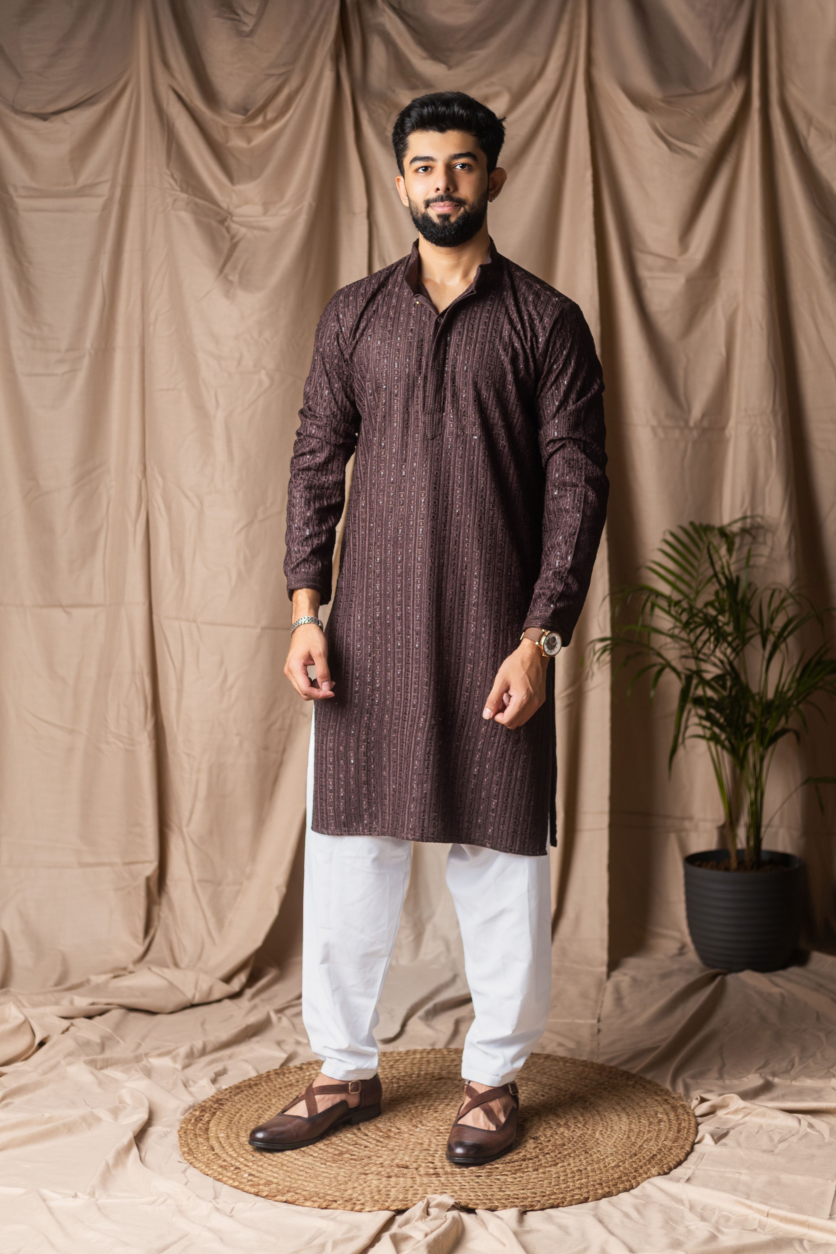 Dark Brown Color Rayon Fabric Festive Wear Ethnic Men's Embroidered Kurta Payjama