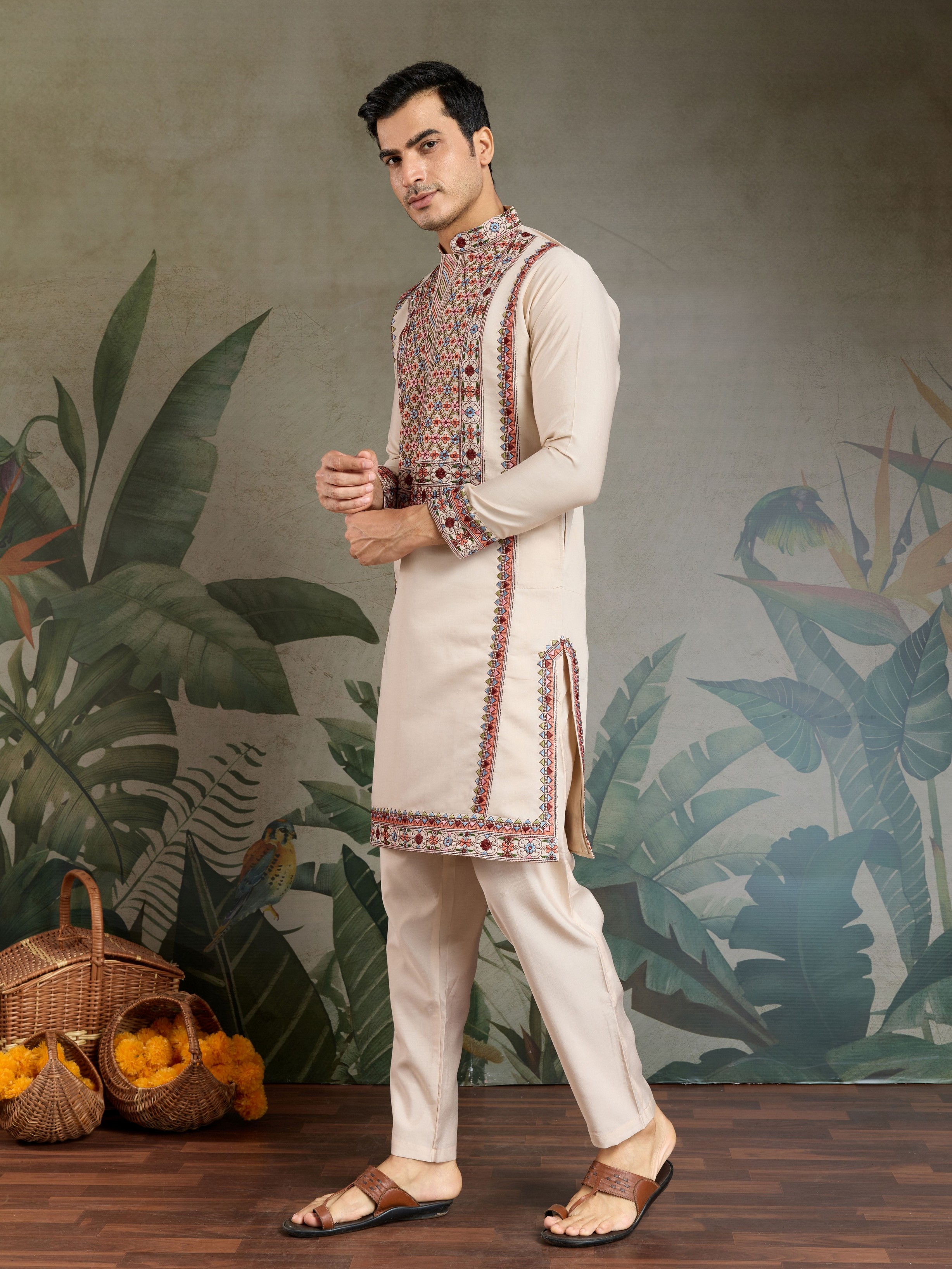 Ivory Color Viscose Silk Fabric Designer Embroidered Kurta For Mens