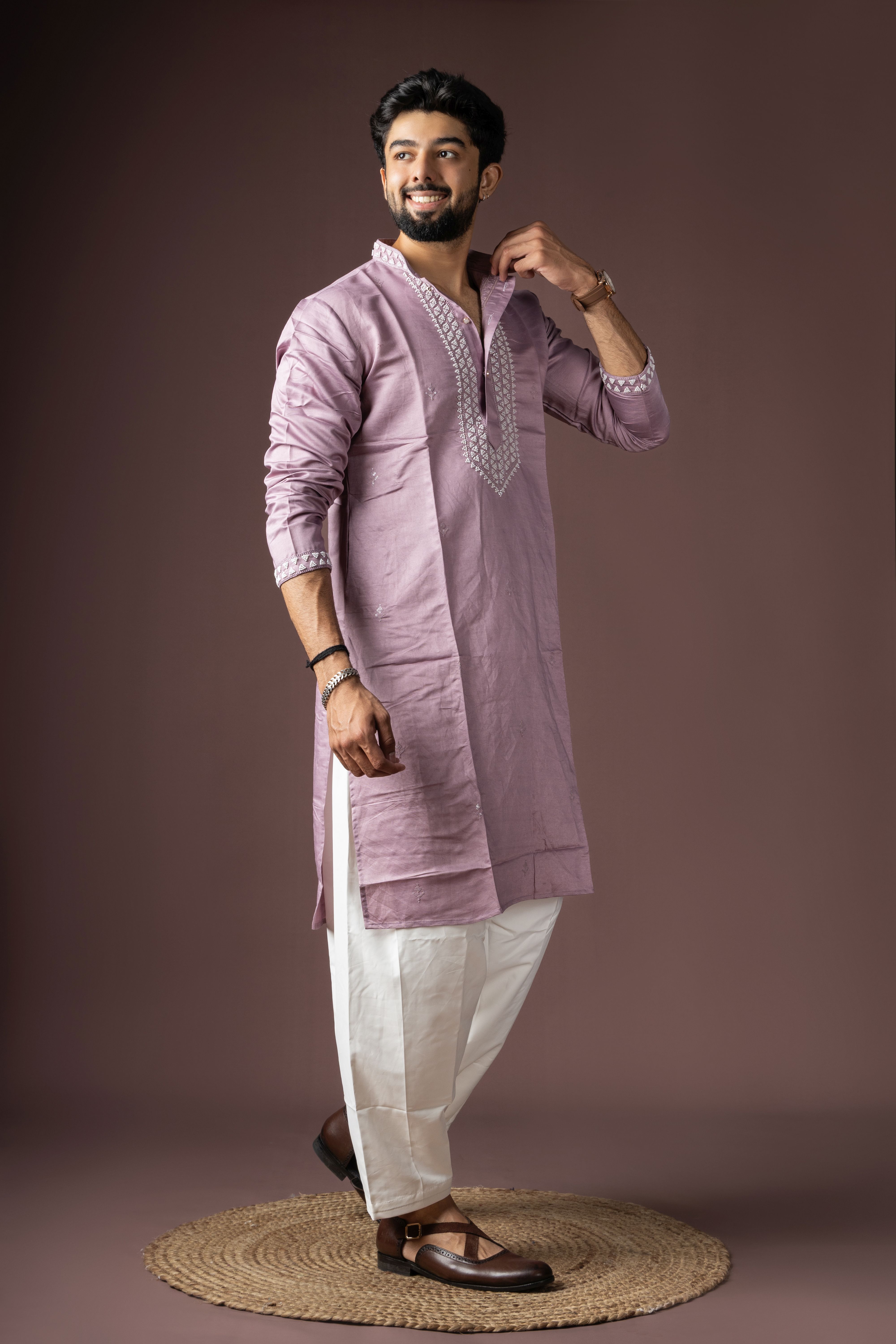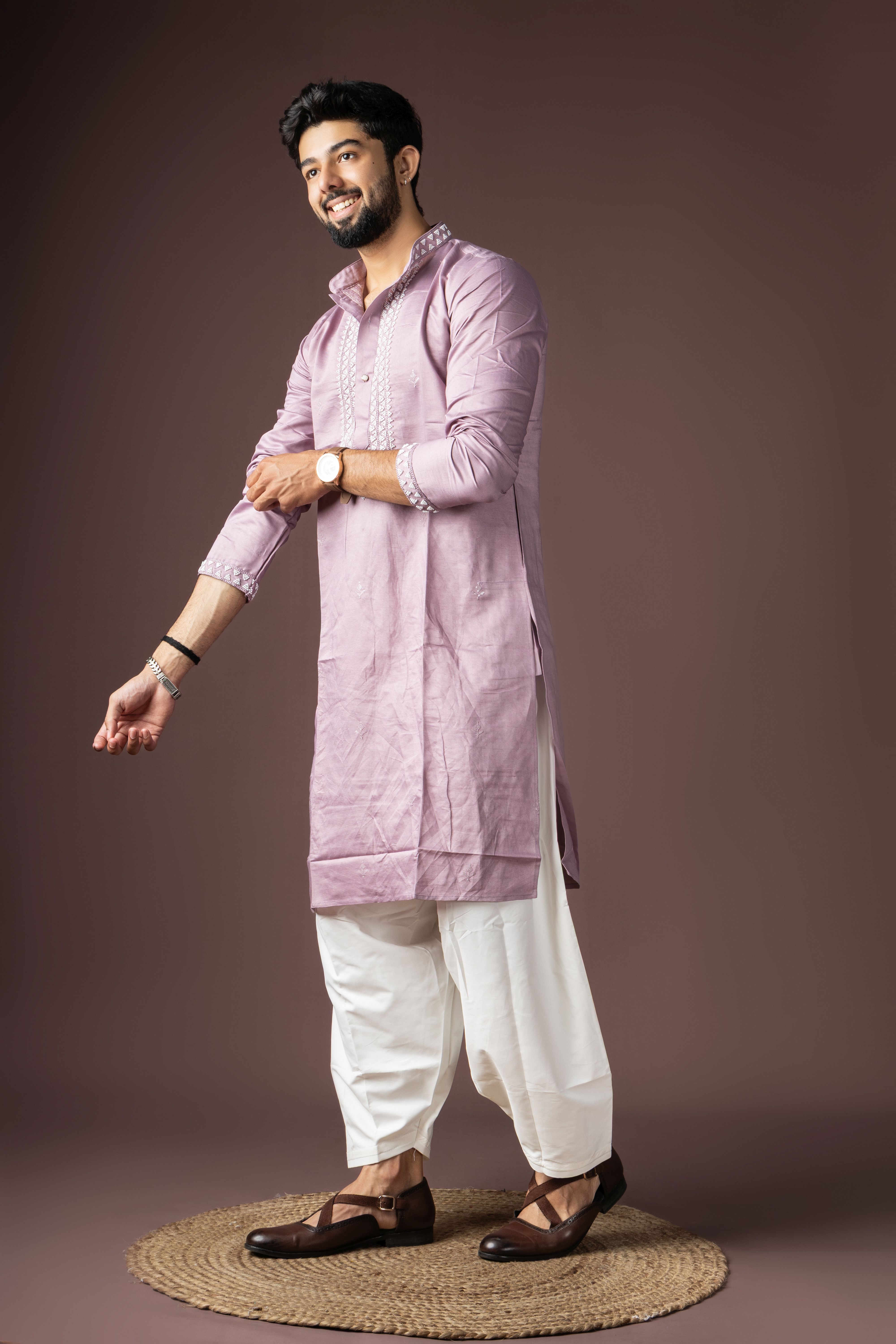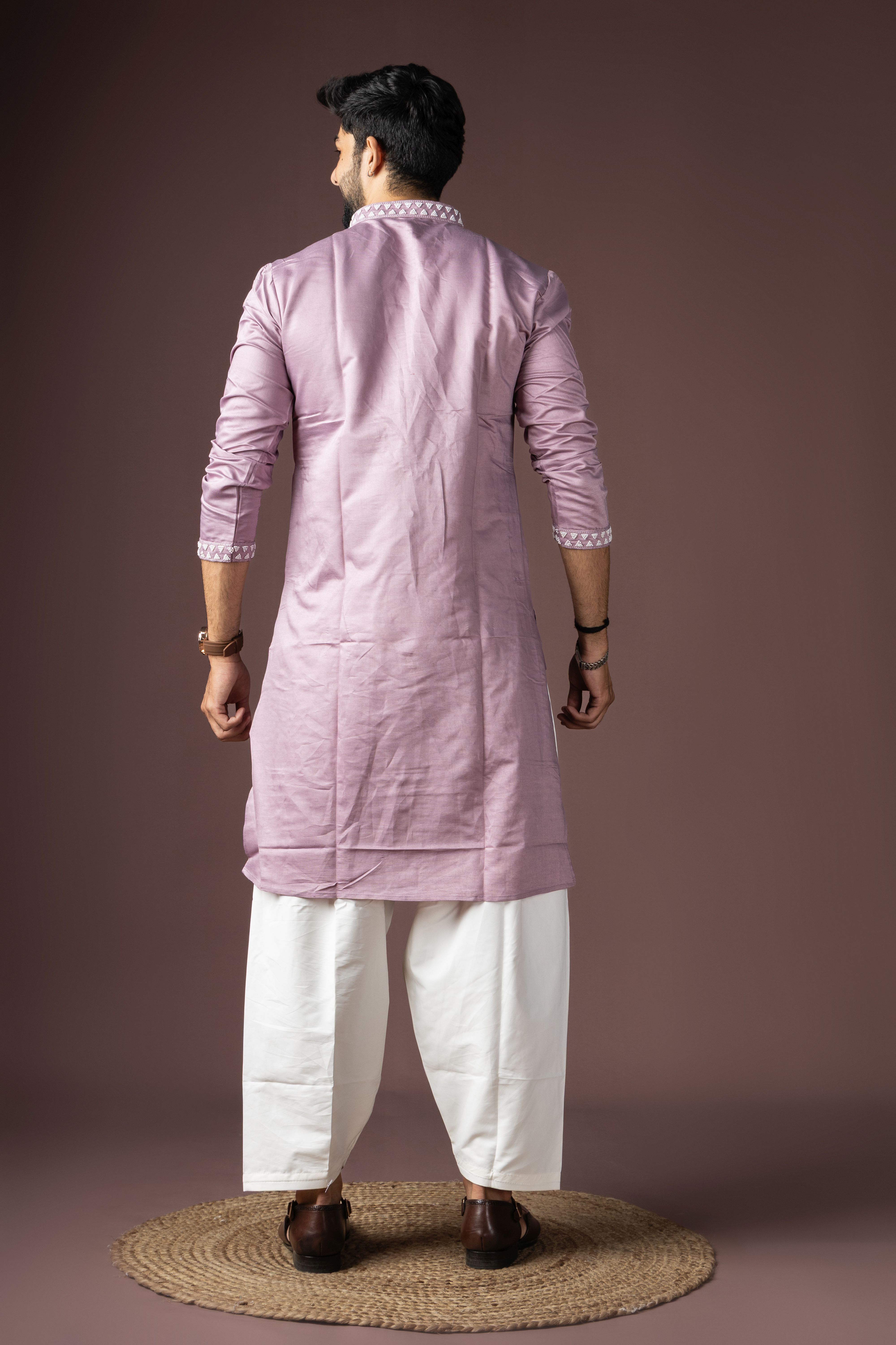 Lavendar Color Beautiful Printed Silk Fabric Ceremonial Men's Kurta Payjama