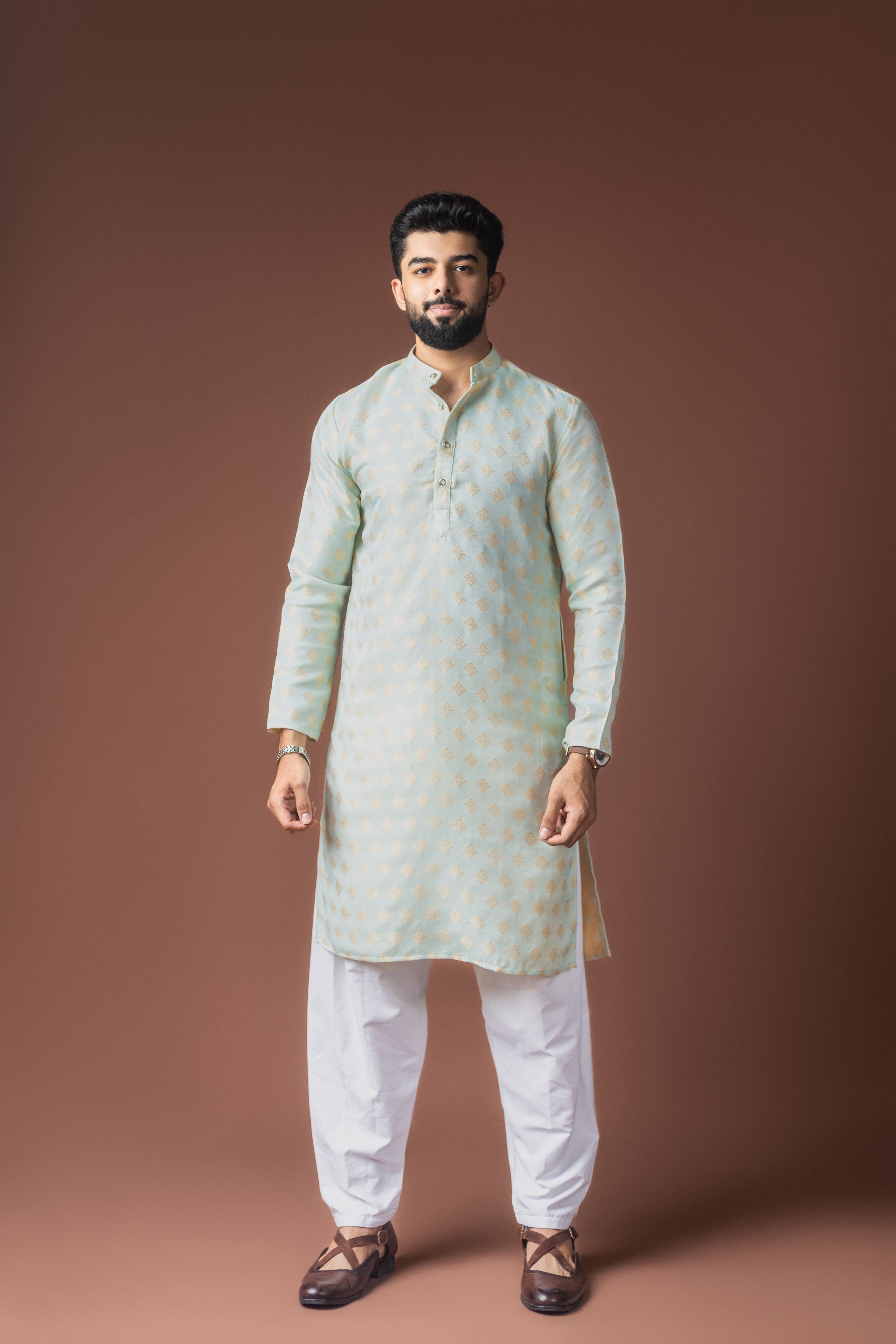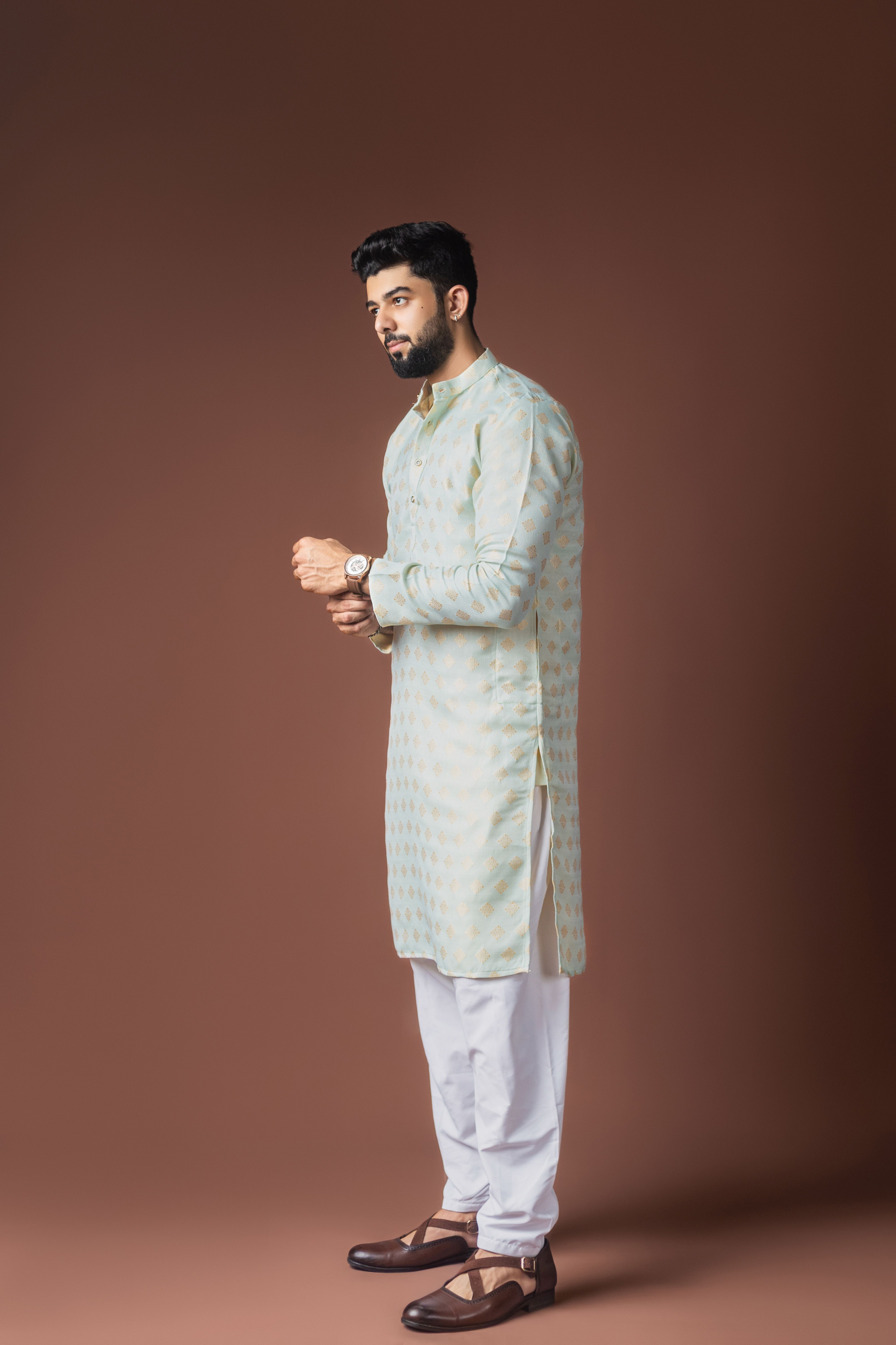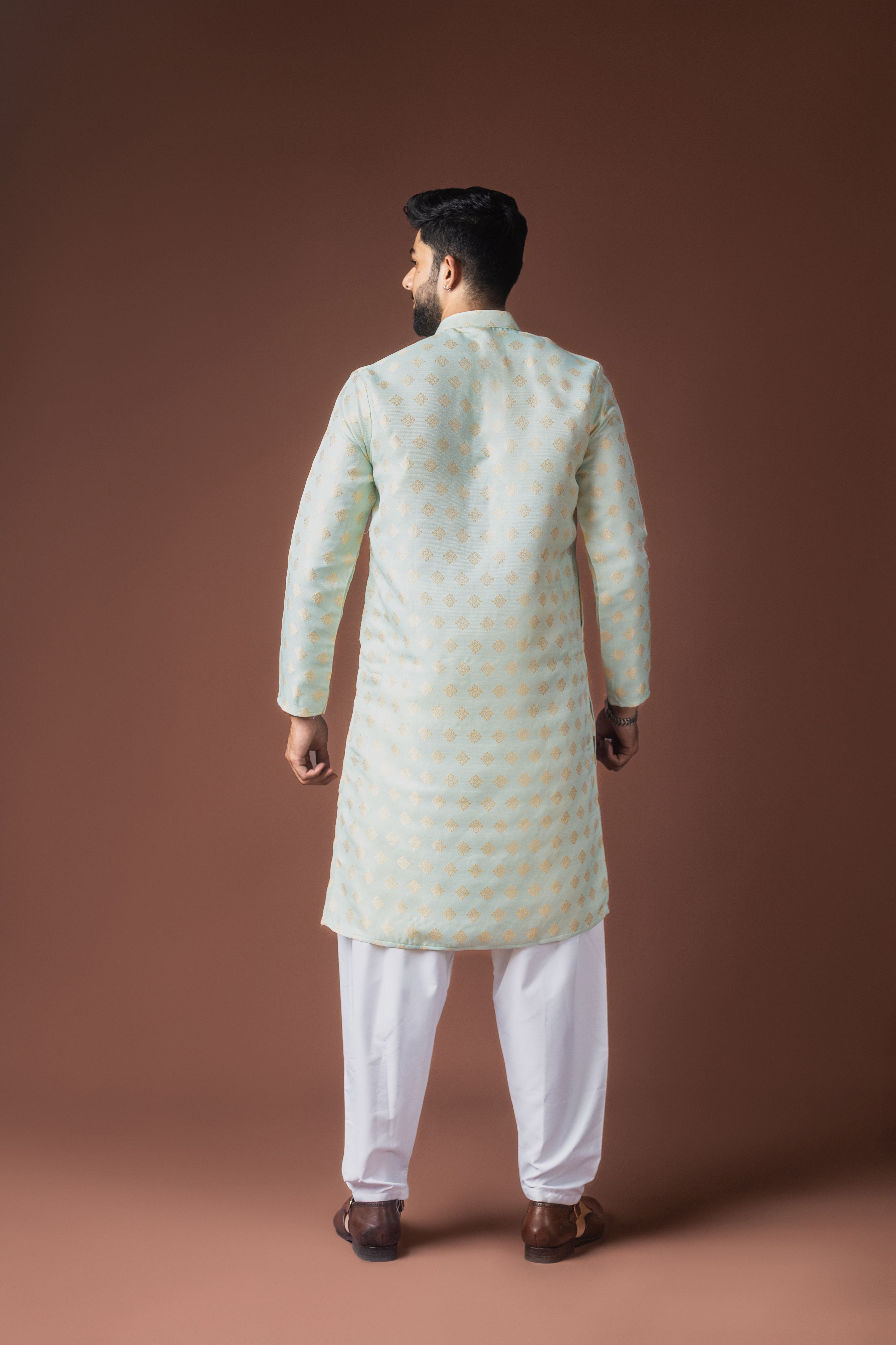 Light Green Color Jacquard Designer Ethnic Men's Kurta Payjama For Festive Looks