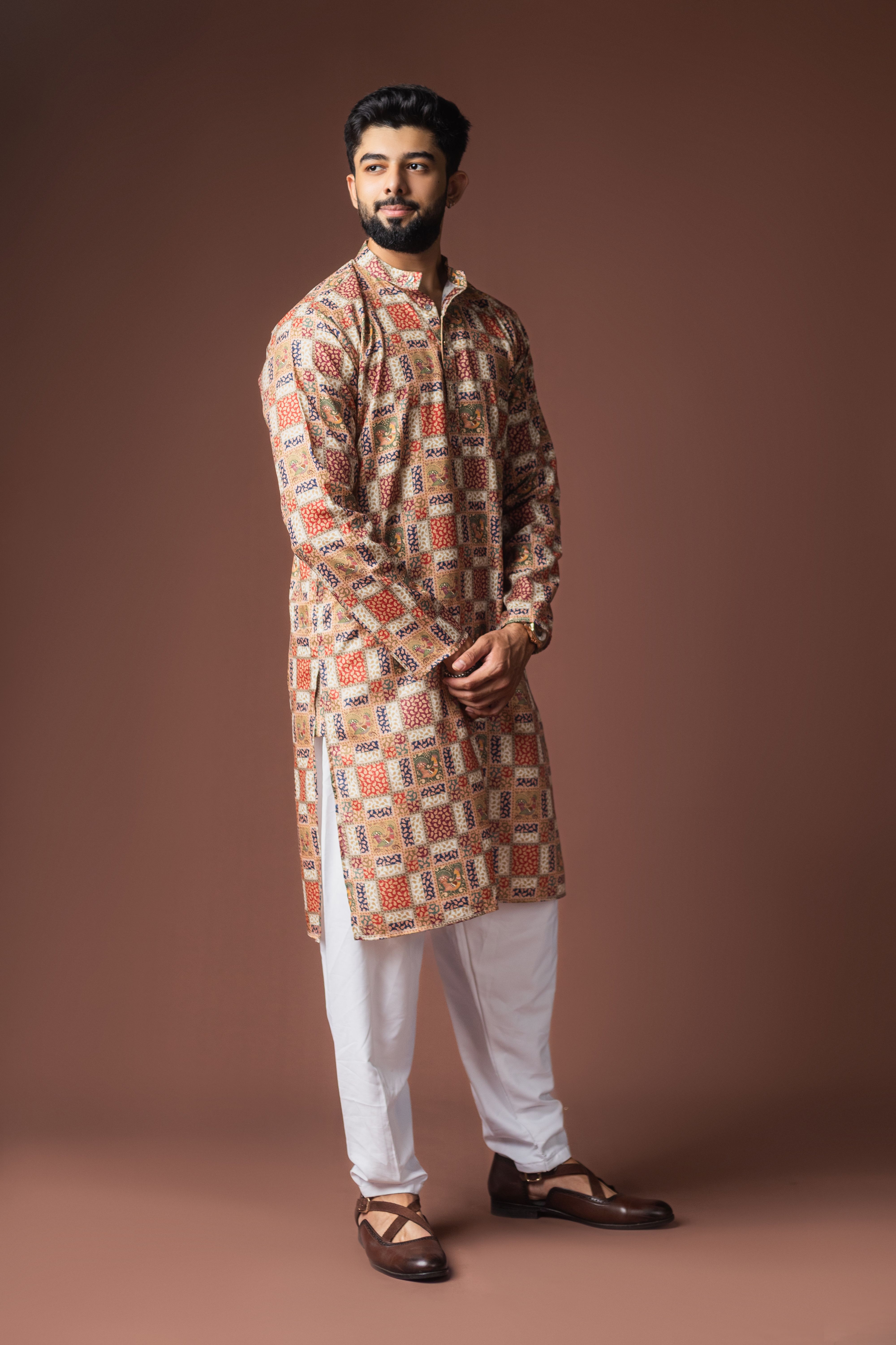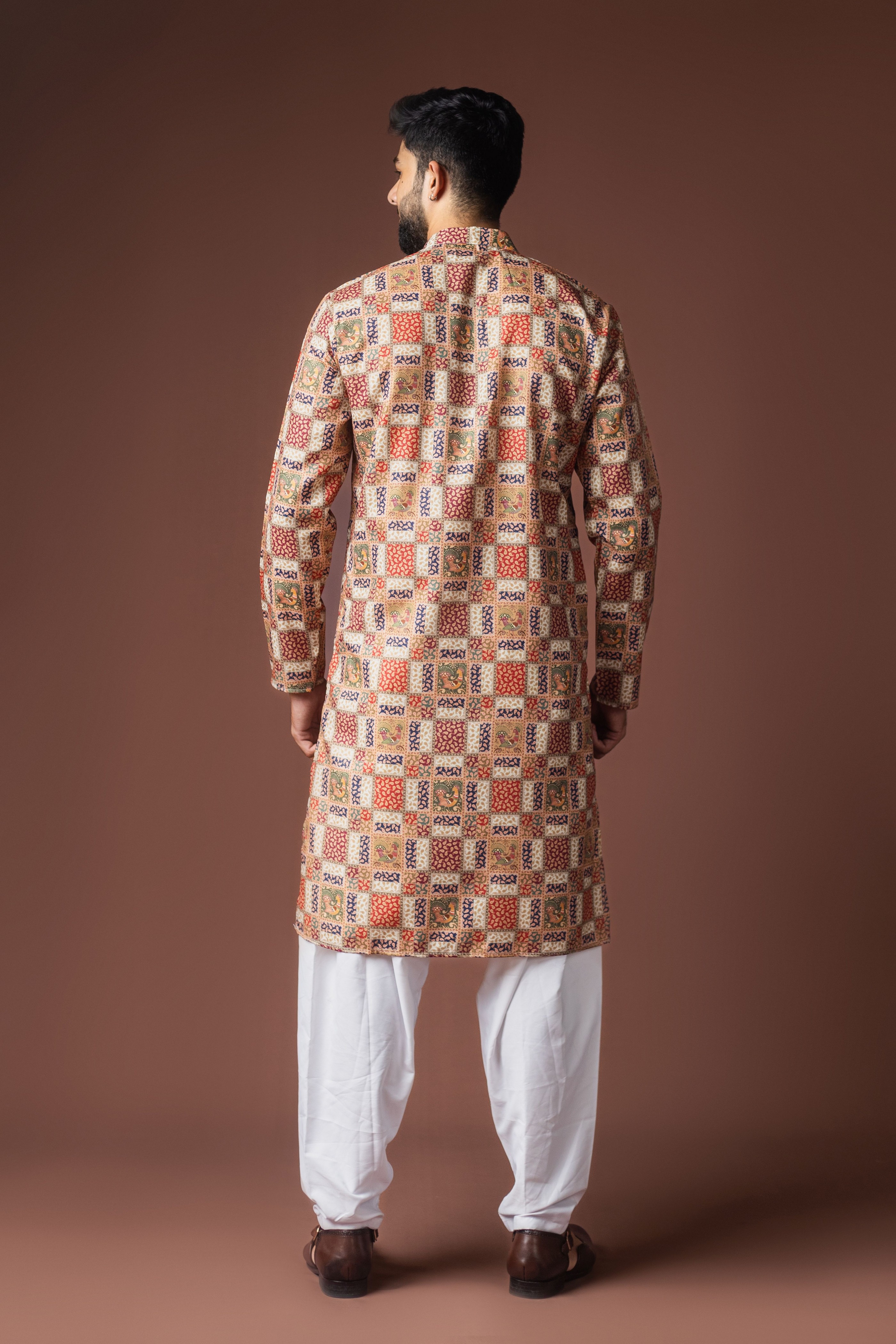 Multy Color Blended Linen Fabric Designer Printed Festive Wear Men's Kurta Payjama