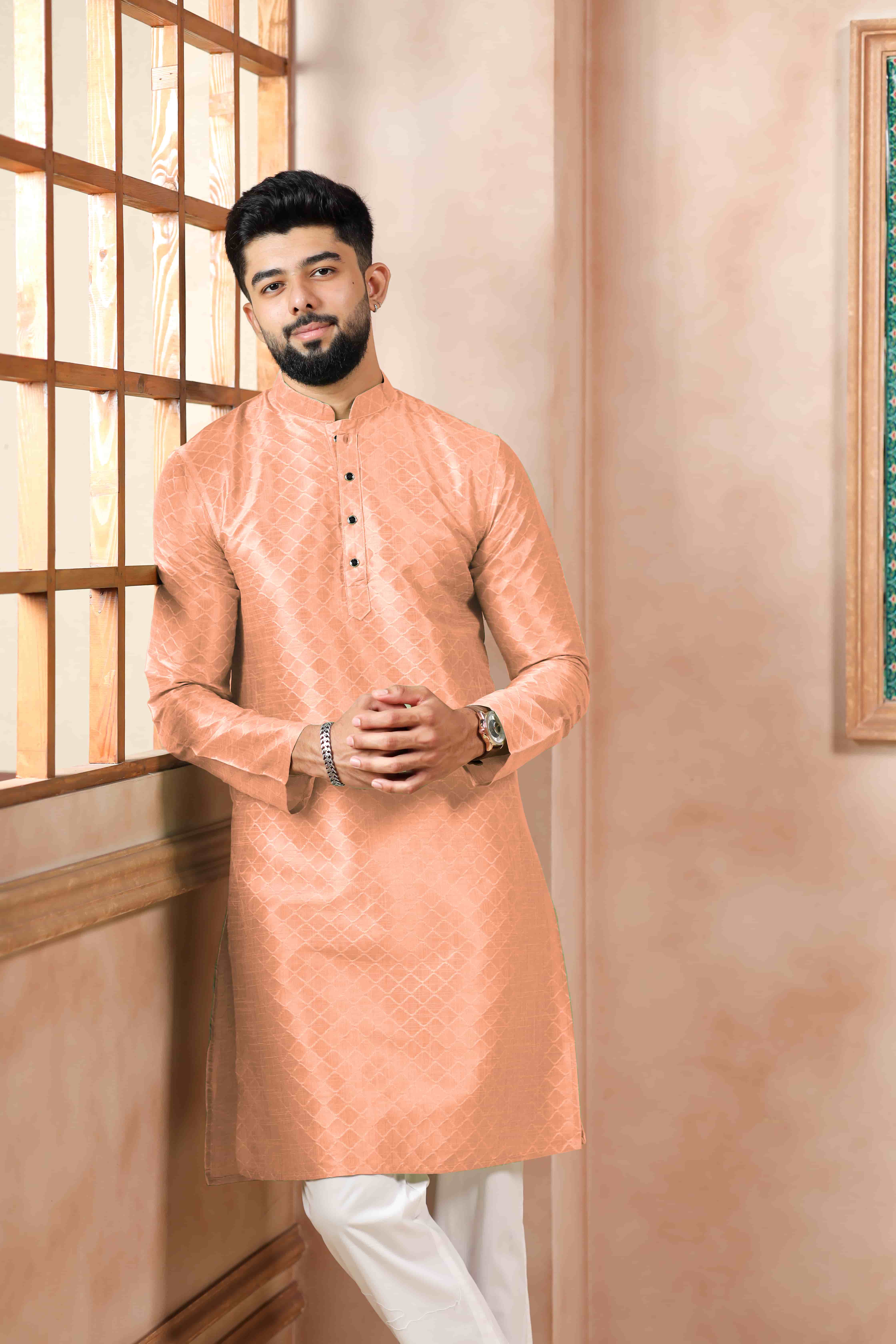 Peach Color Graceful Partywear Kurta Payjama For Mens Ceremonial Looks
