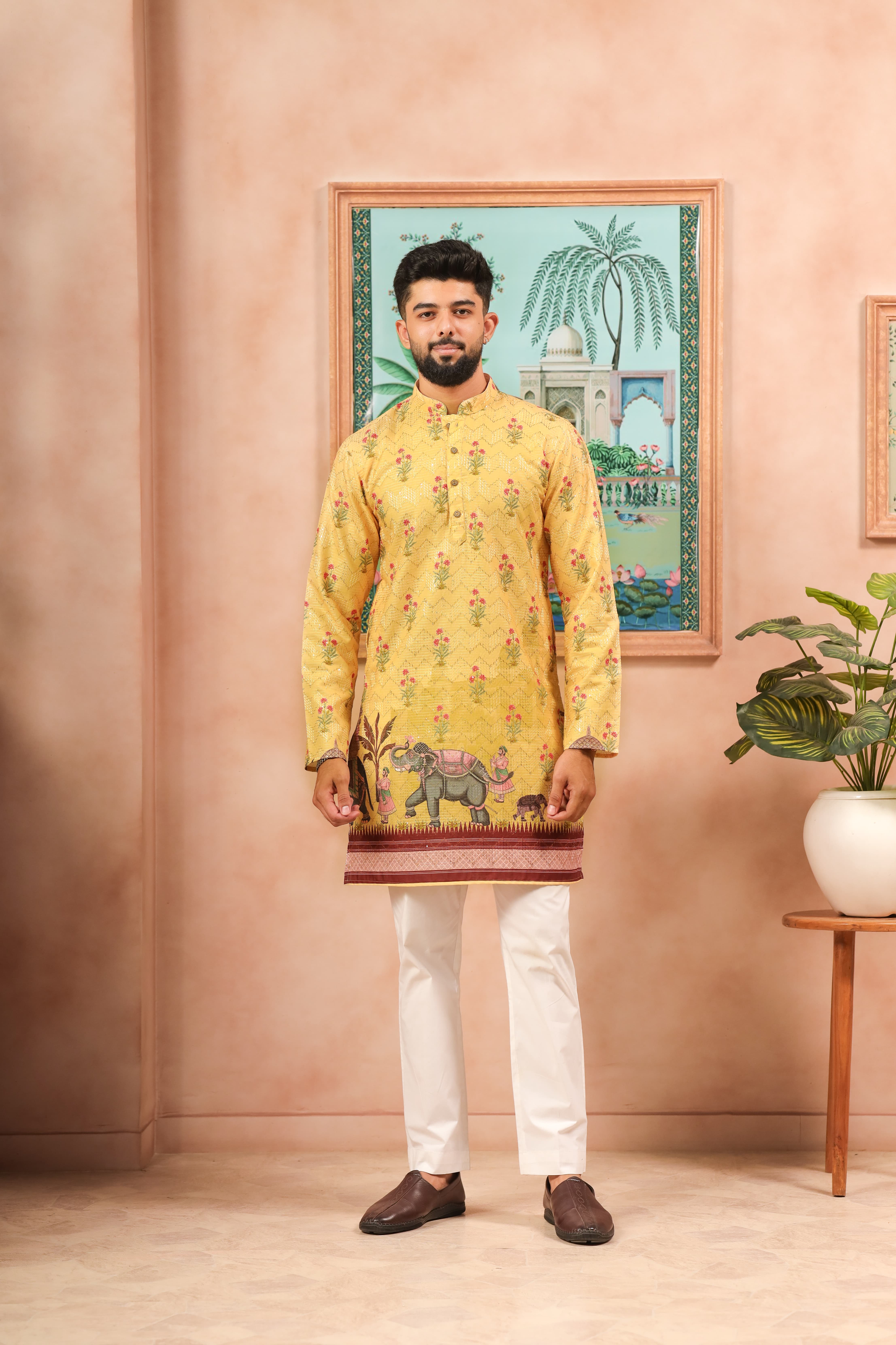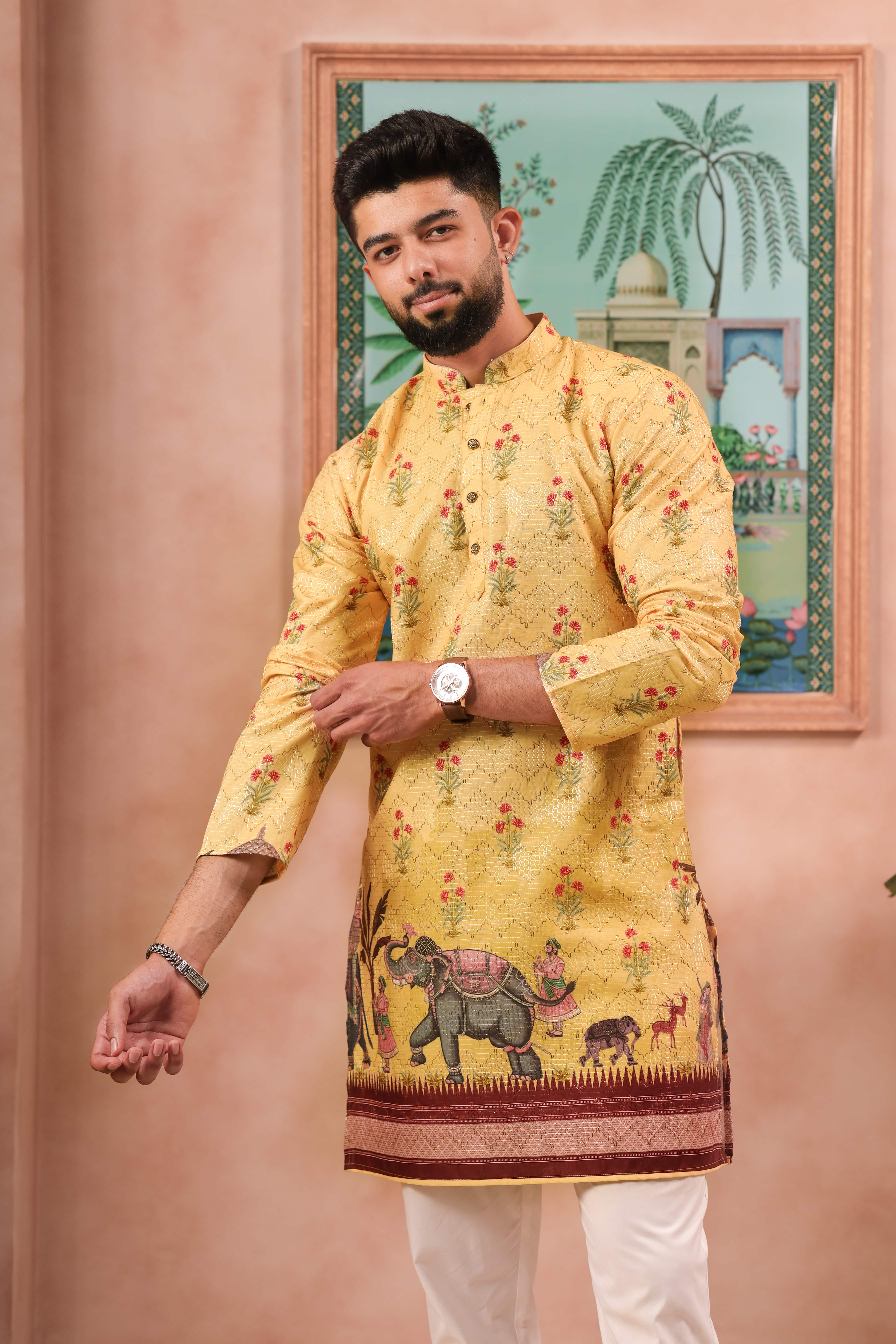 Yellow Color Beautiful Blended Cotton Fabric Ceremonial Kurta Pjyama